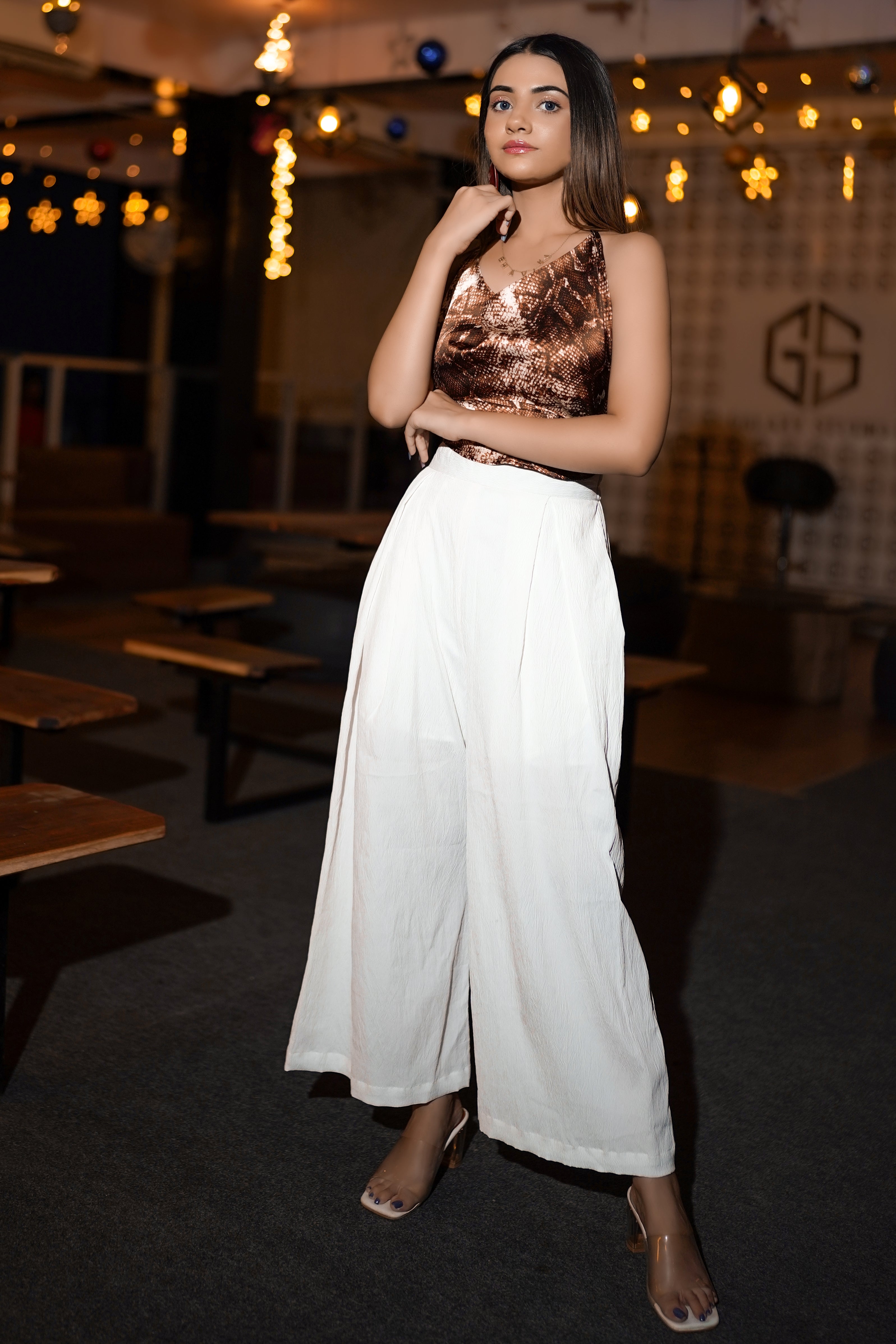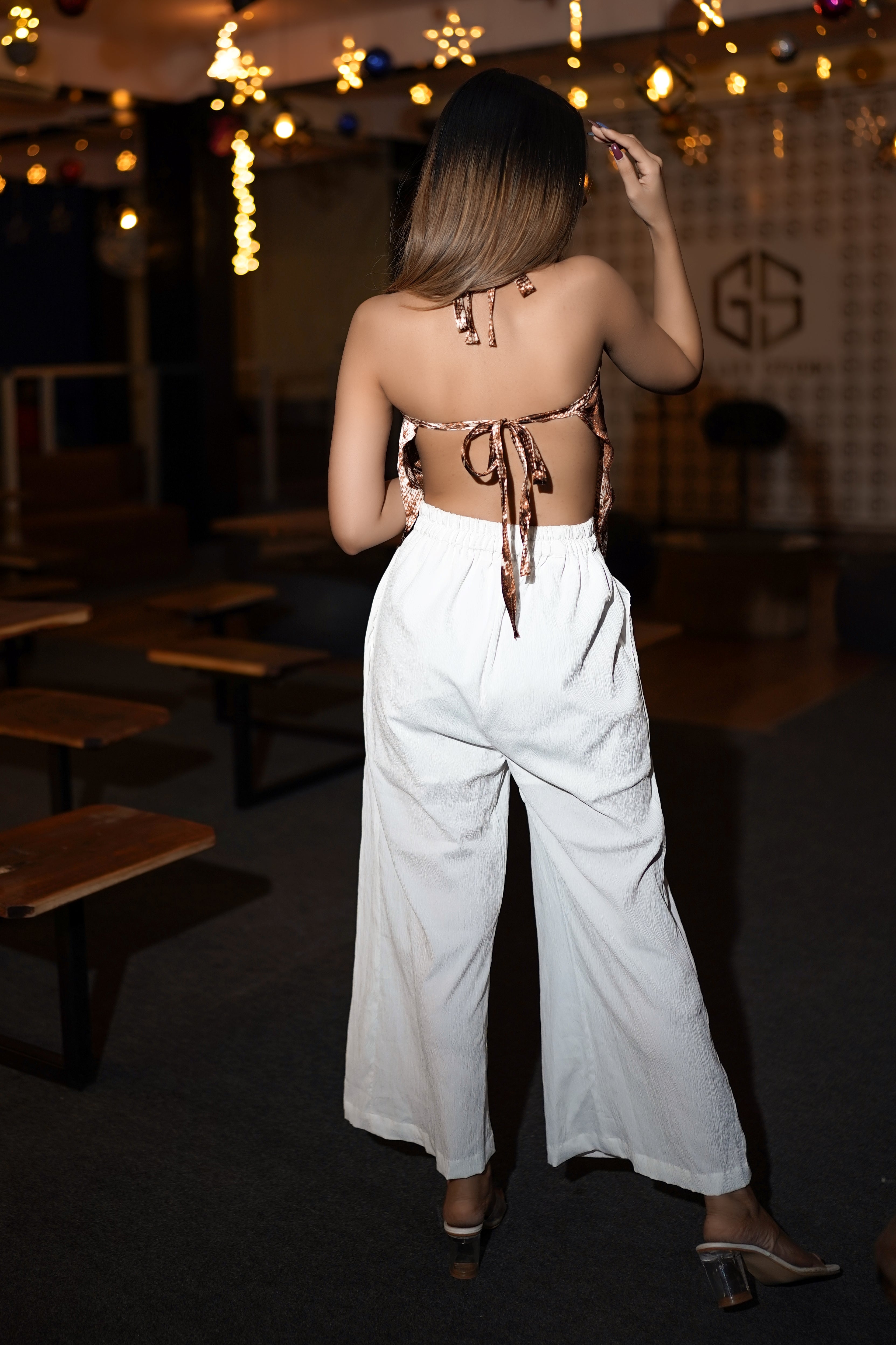 Slip into this animal print scarf top, for a picture-worthy party look from MANNMANI'S latest collection. This cowl neck top is made of satin which is completely backless and has back knots. Pair it with a neutral pair of long skirts or our white wide-leg pants for a hot chic look.