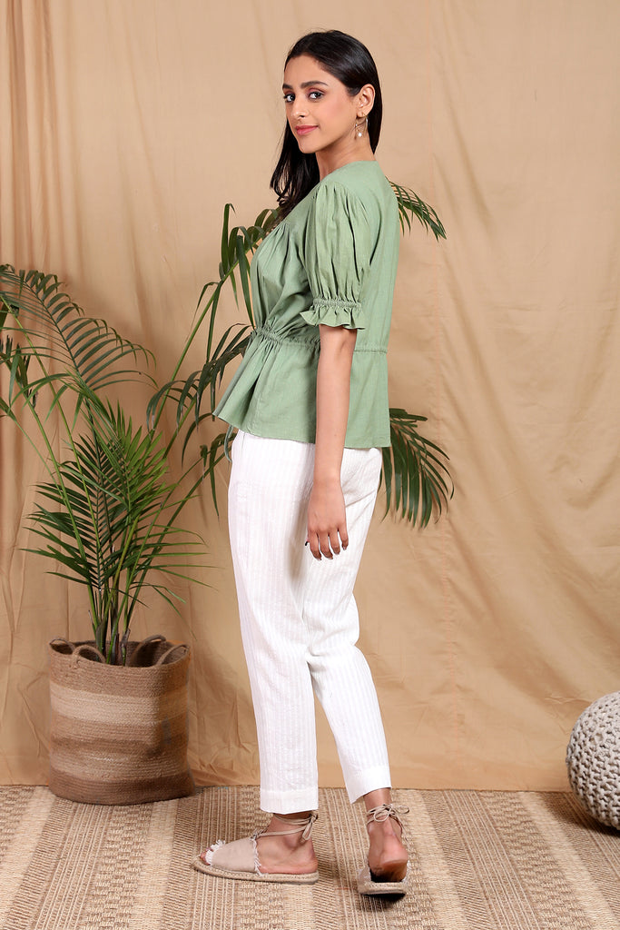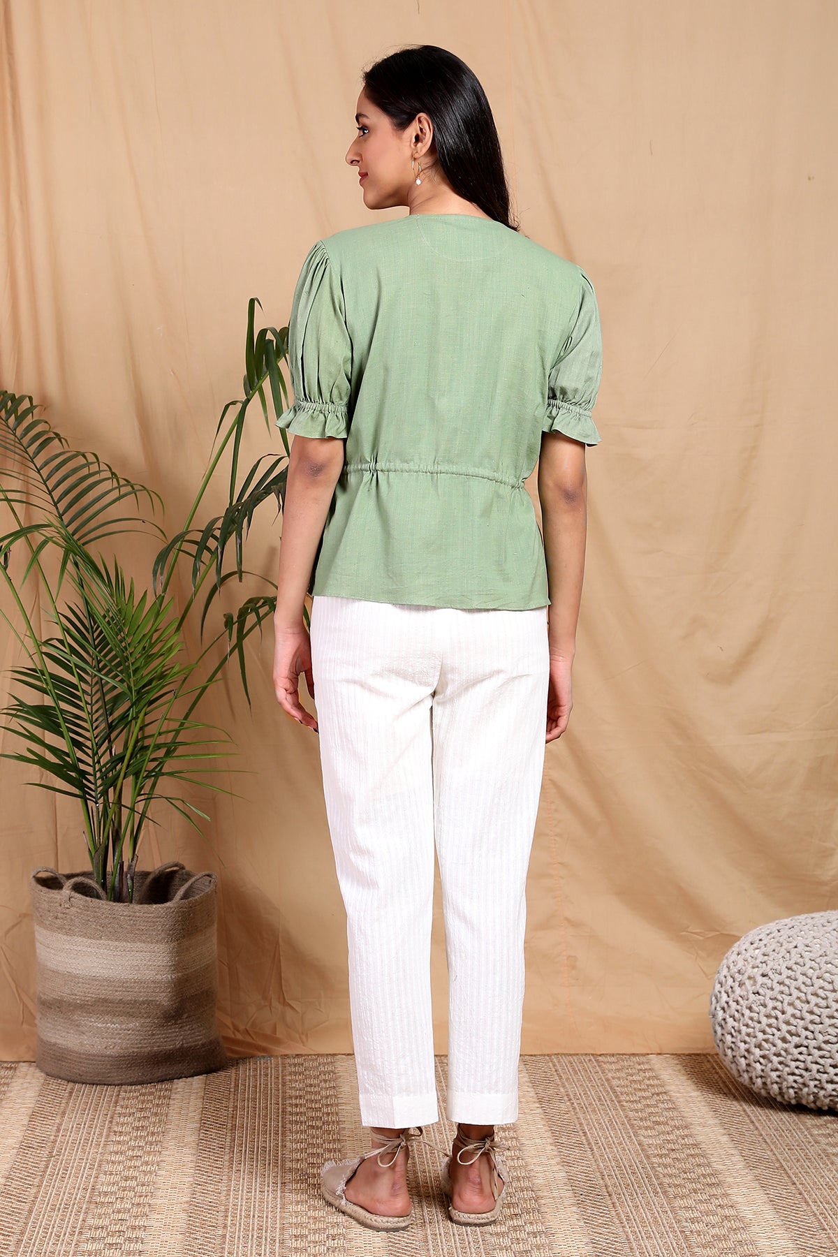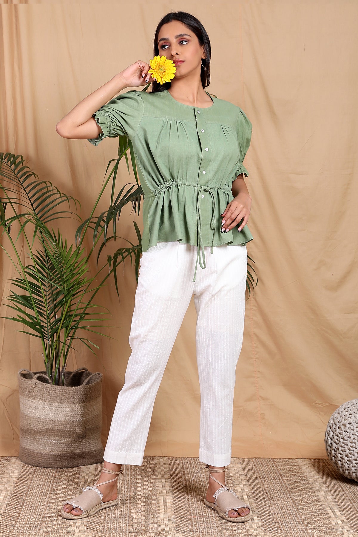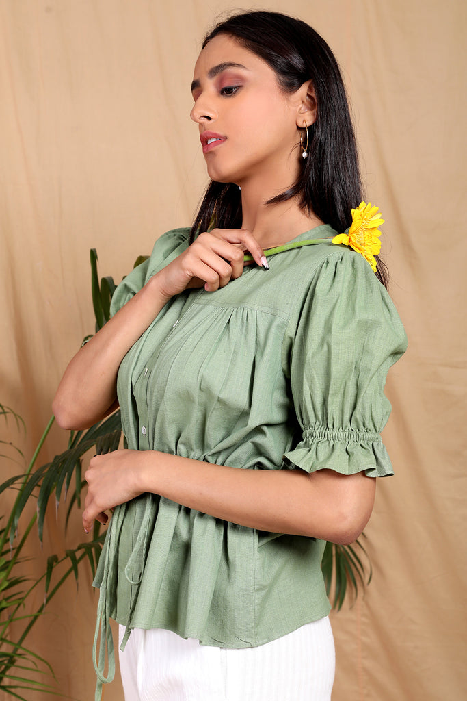 Who doesn't love a cute detailing top? Handcrafted in handwoven cotton linen fabric with puff sleeves elasticated and charmed with ruffle detail at the end. Drawstring tie up detail for a cinched waist look and front button opening. A summer must-have!