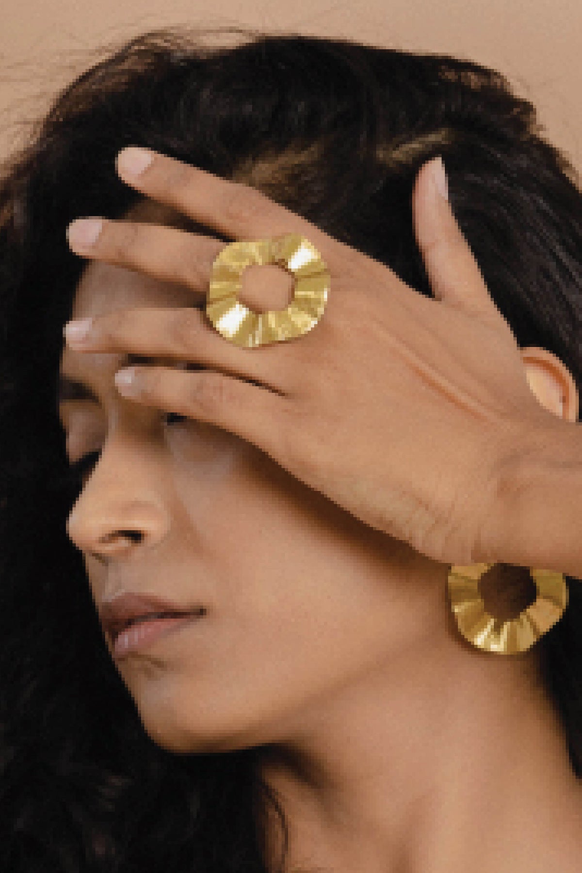 For all the strong yet beautiful, humble yet bold women out there, these gorgeous earrings are for you. Inspired by the flow of an ocean; a flow similar to the multifacets of a woman, the earrings are handcrafted by local artisans using hammering and folding technique in 18kt gold plated brass.