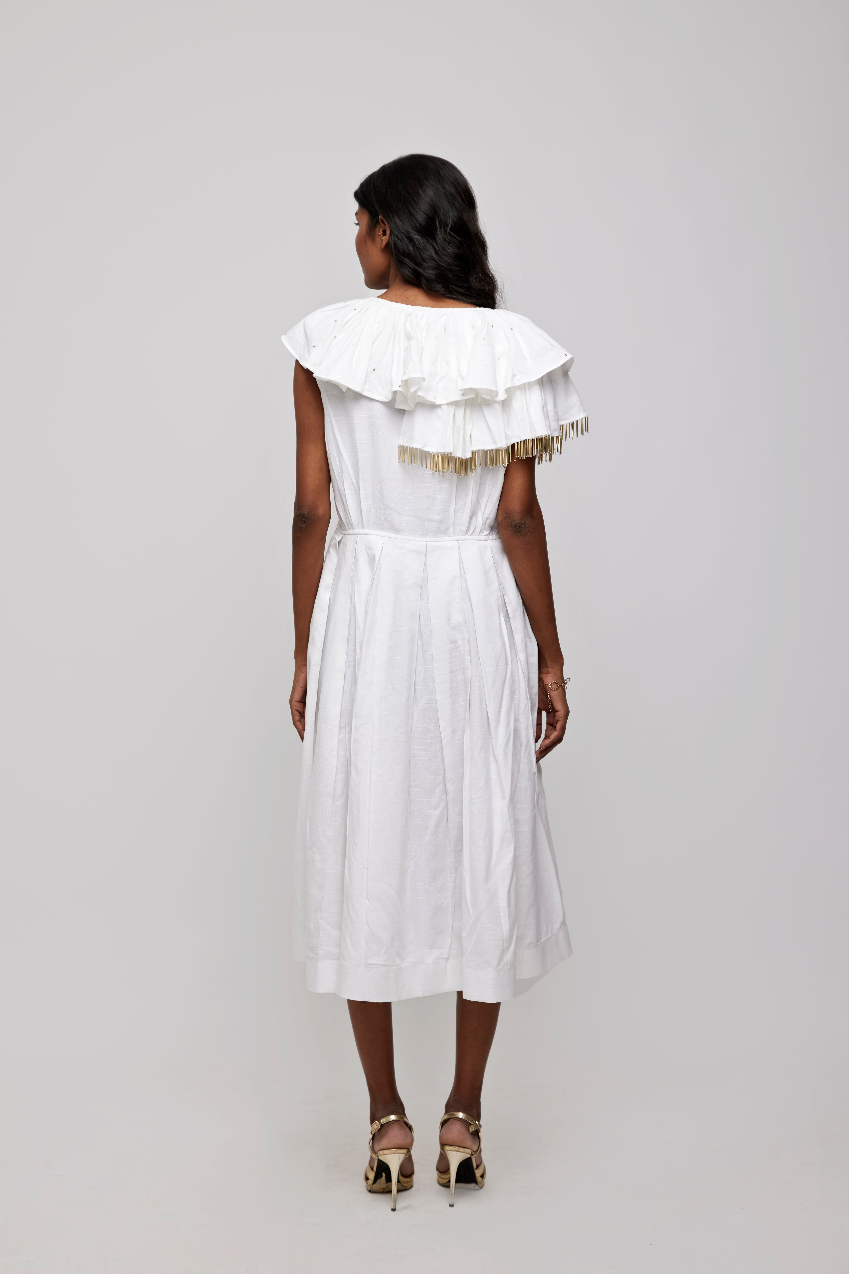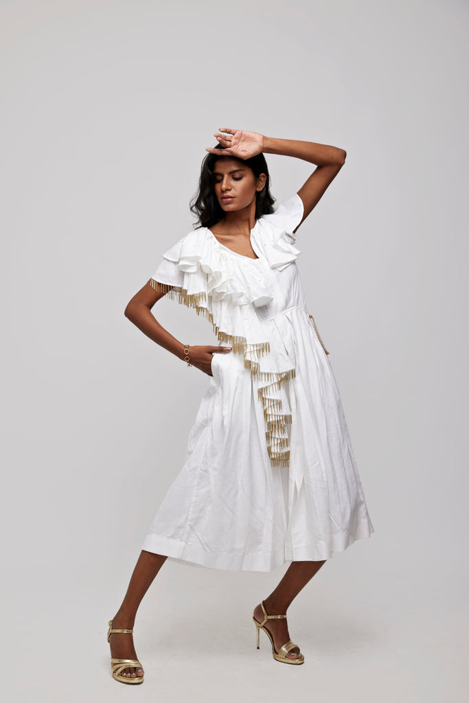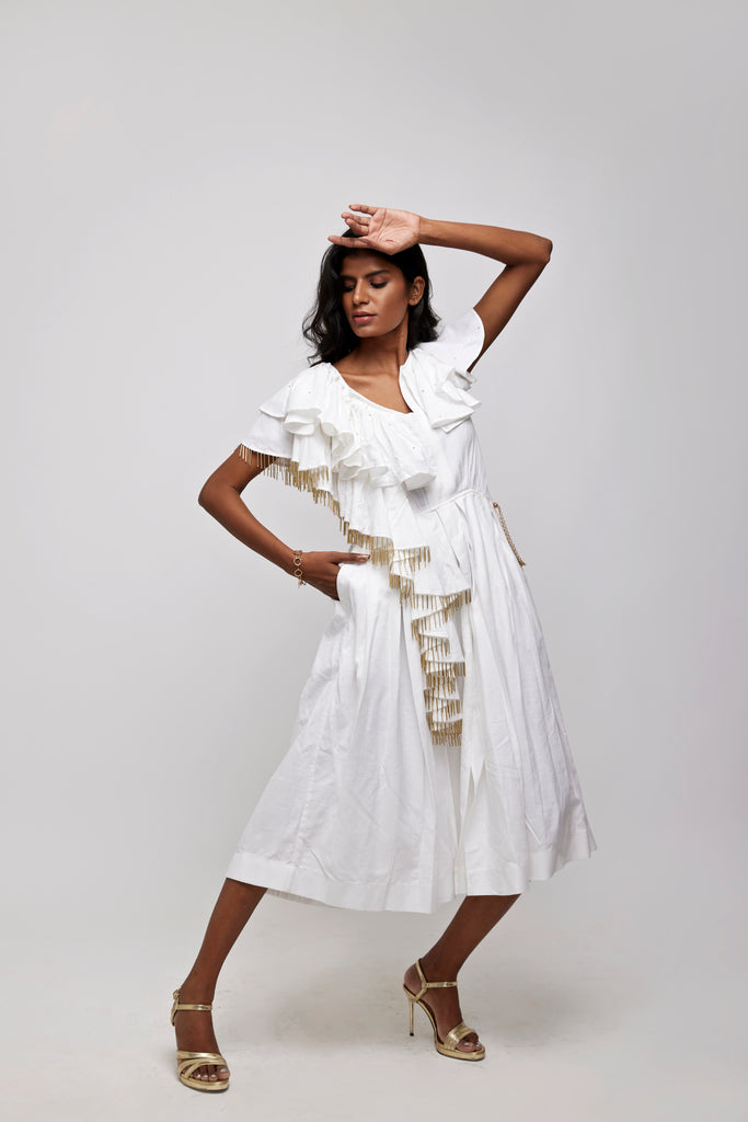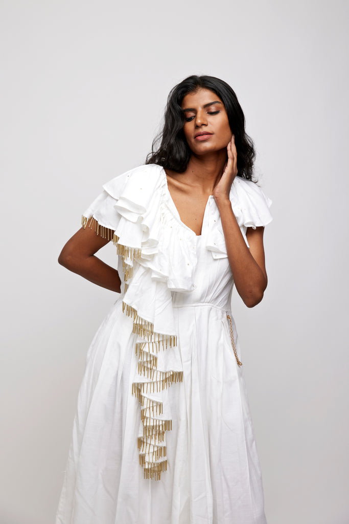 The bodice has pleated ruffles starting from the left side of the neckline and dropping down to the right side down the upper waist.