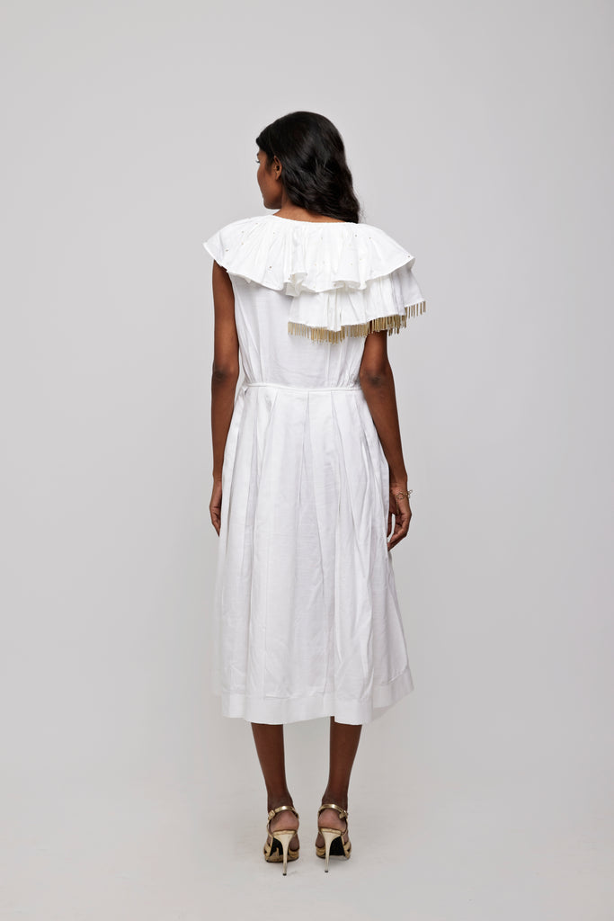 From the back, the centre point another layer of pleated ruffles with golden tubes dropping down to the right side towards the lower thighs. The first layer of pleated ruffles is embellished with golden and silver sequins.
