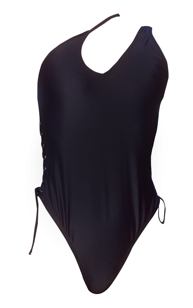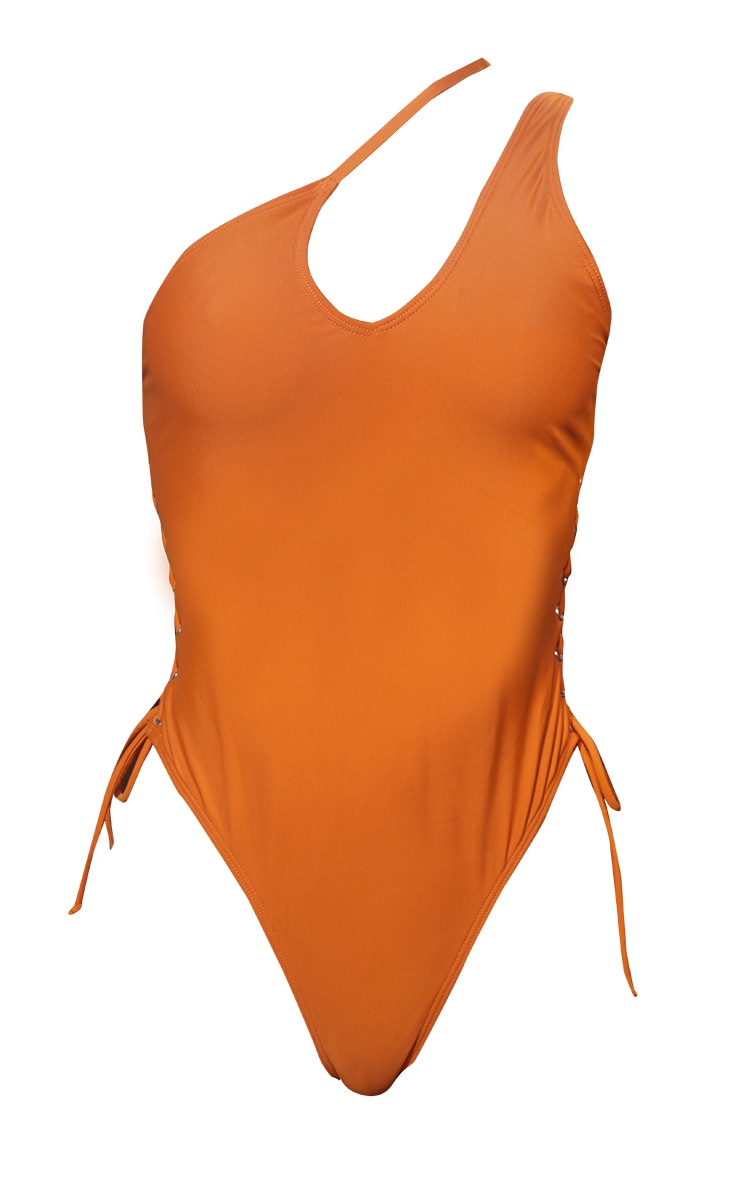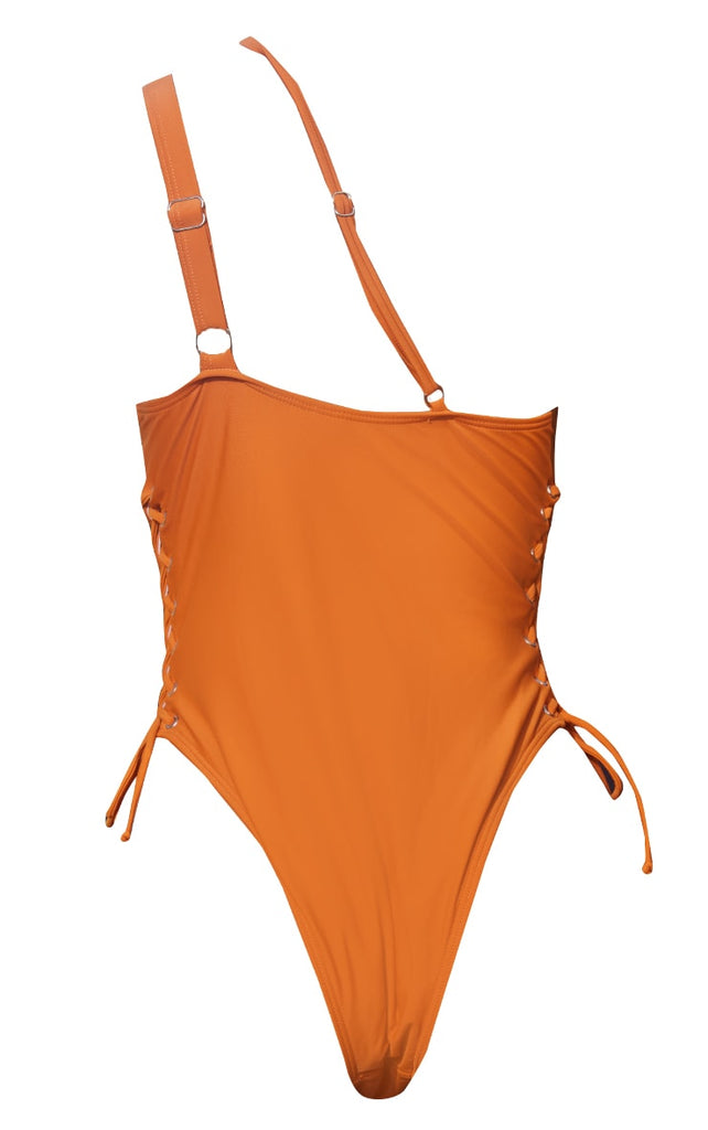 Get ready to have all eyes on you in this swimsuit. Featuring a rust material with an asymmetric one shoulder design and lace up detailing. Just add statement accessories for a poolside look we can't get enough of.