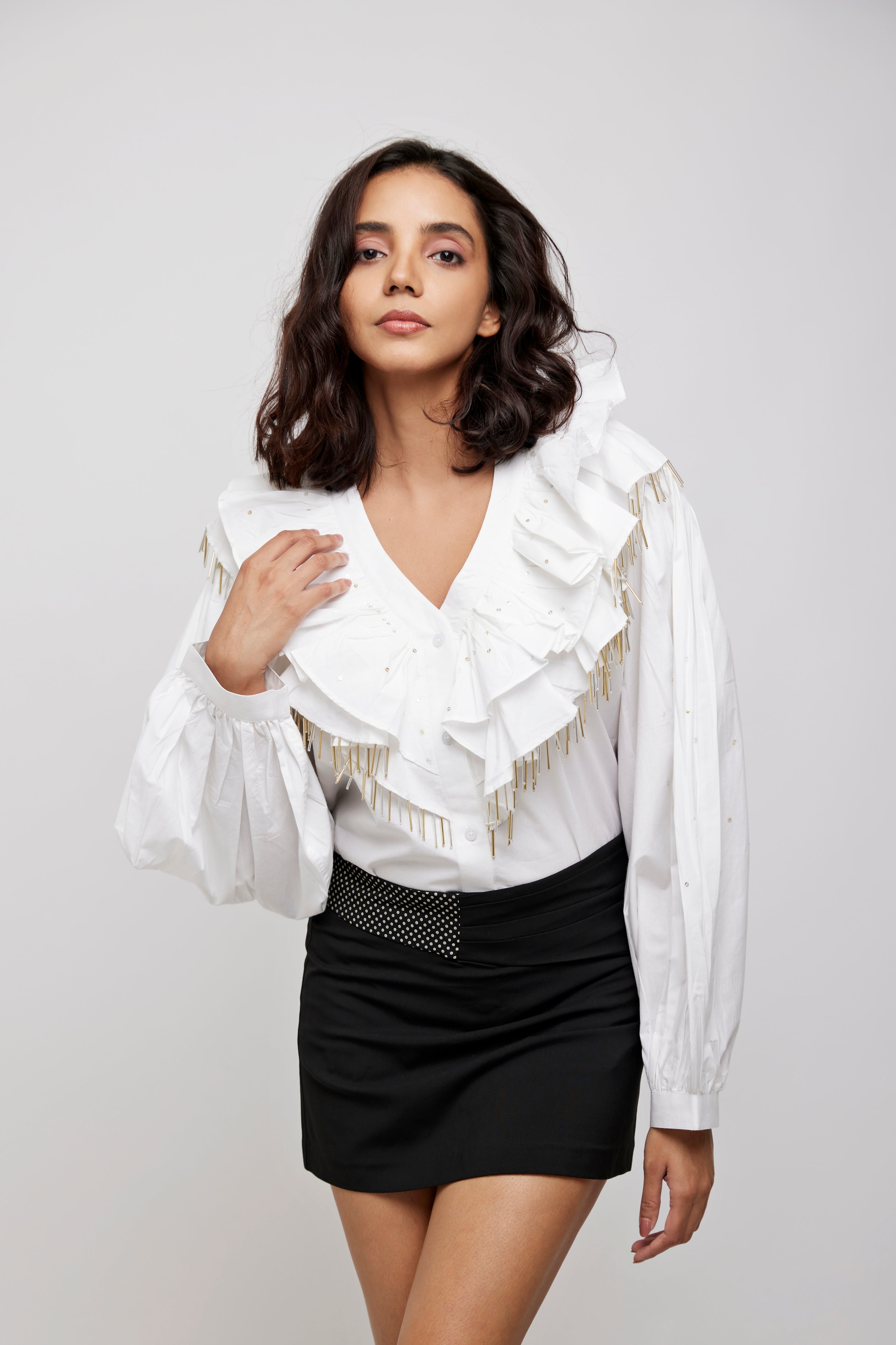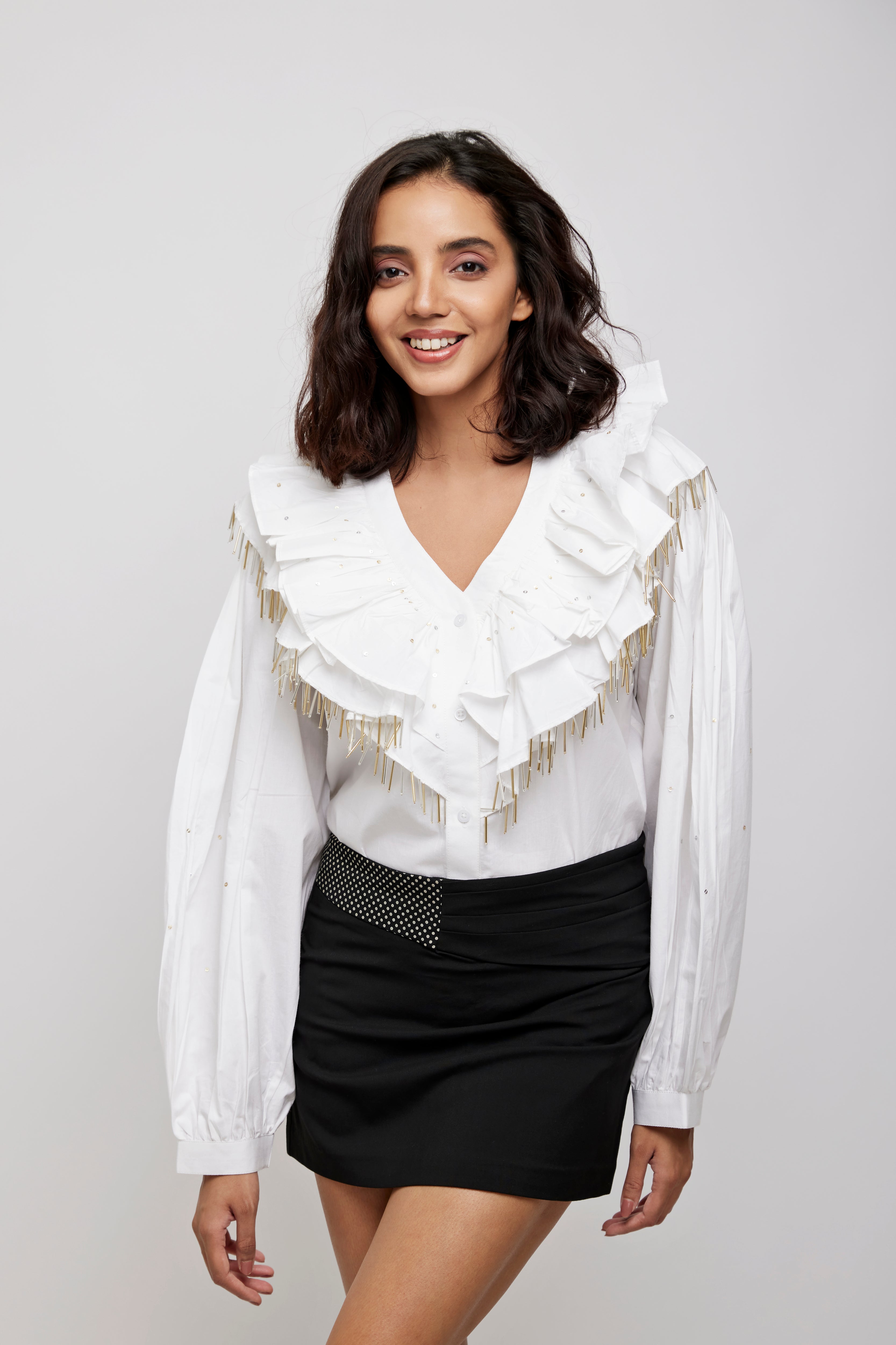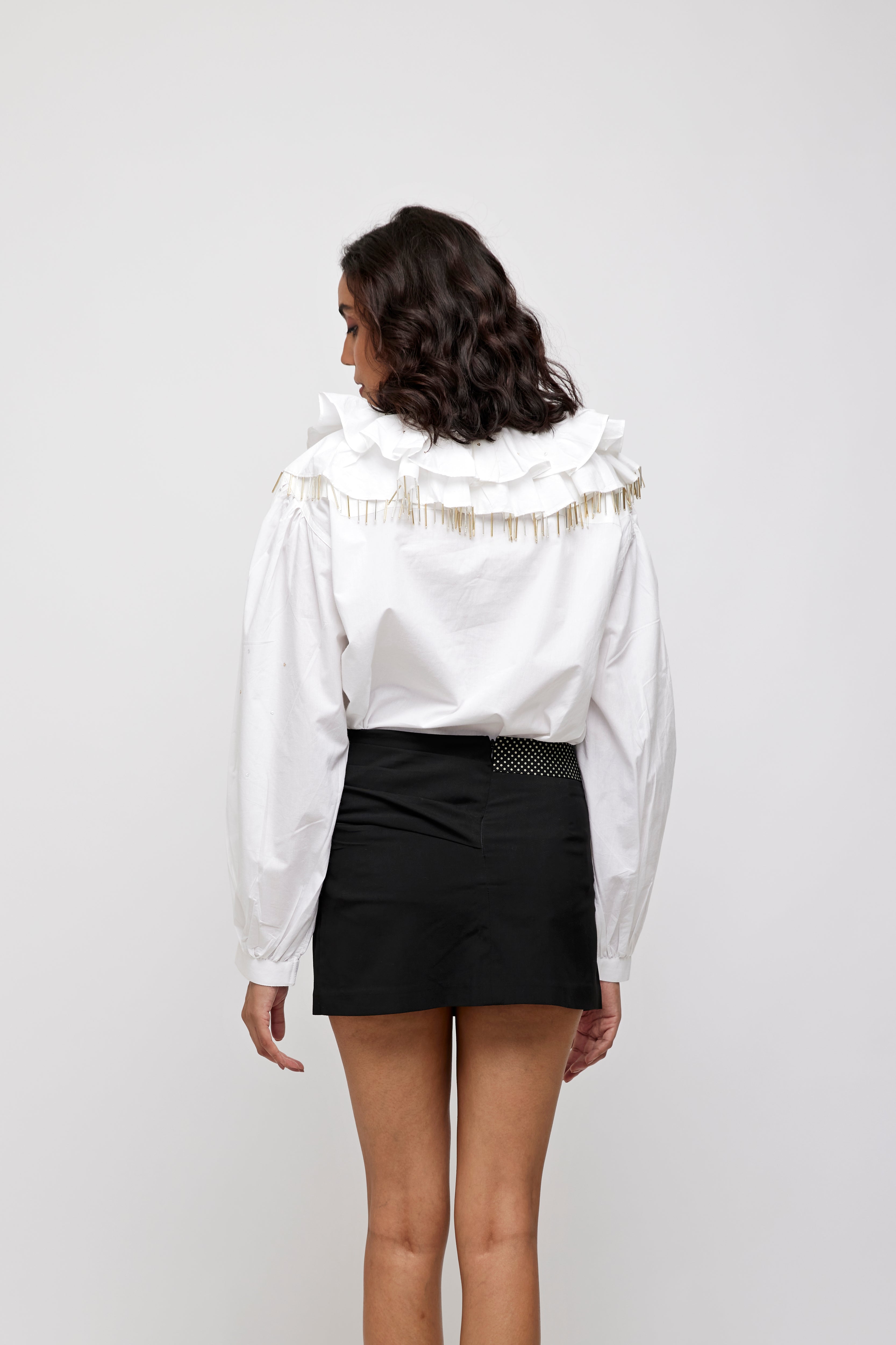 Horizontal yoke with rounded ends near the armholes at the back.Medium wide neckline to a front opening V neckline Shirt with 2 layers of ruffles in full circular attached.