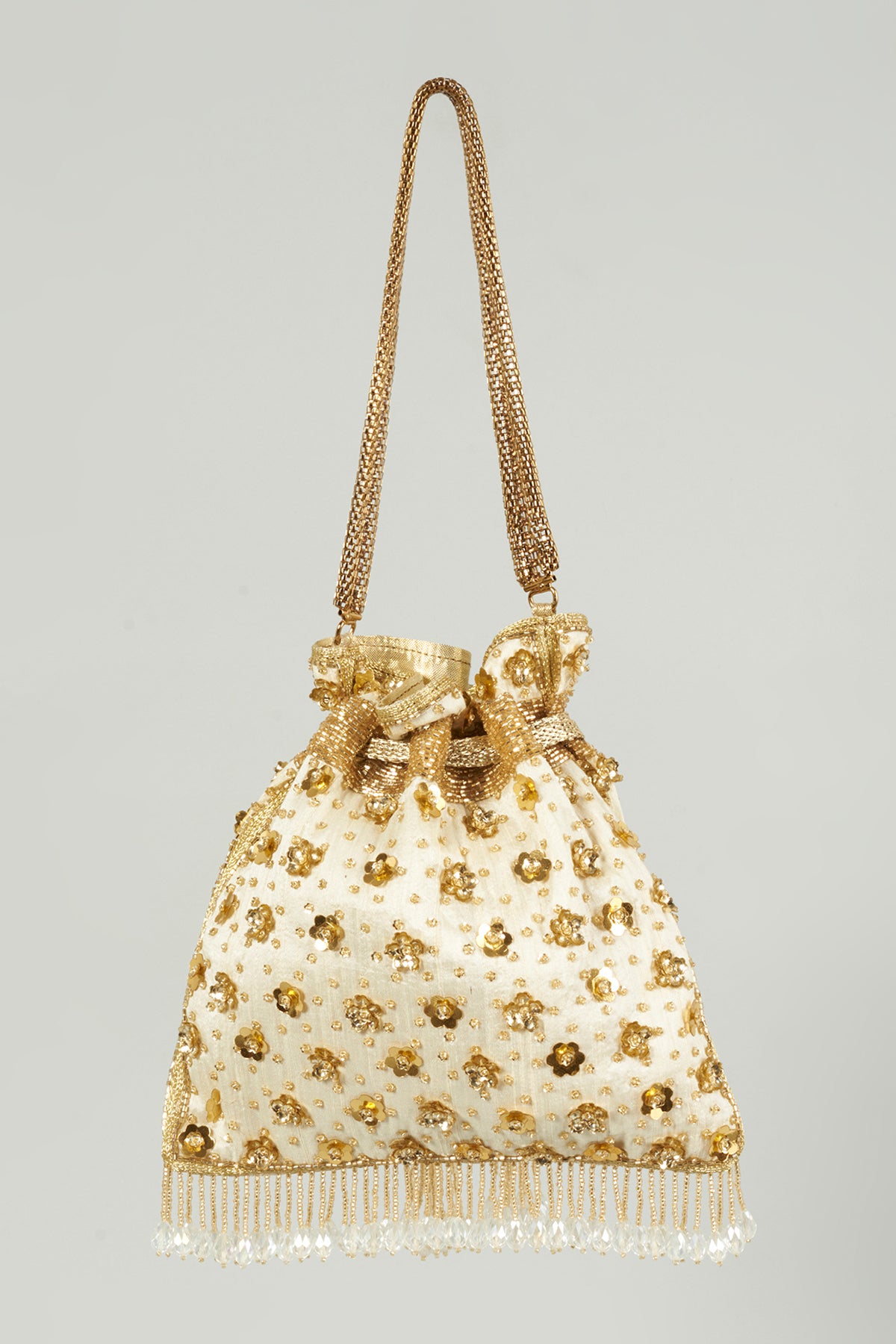 Metal flowers in shades of gold hand embroidered and finished with crystal danglings.