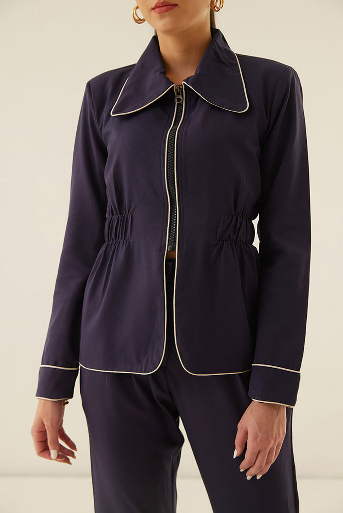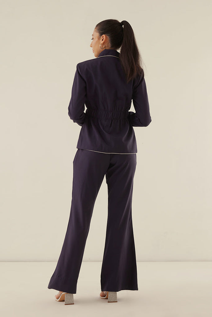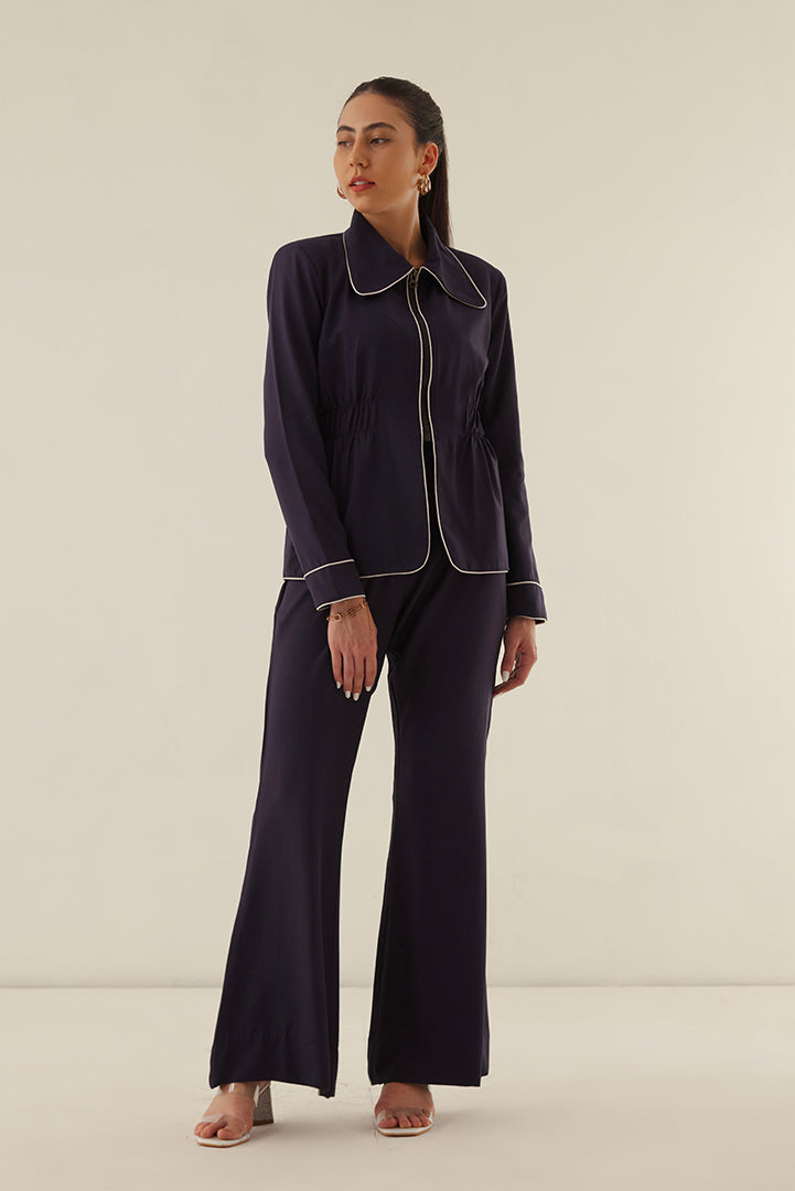 Our small lapel jacket with zip fastening is a must-have for your everyday wear. The waist detailing is done with elastic for the cinched waist and the cuff has piping adding an elegant touch. It is extremely versatile and can be worn in all seasons and styled. The set comes with a pair of high waist flare pants with button openings for comfort. Available in plus size also.