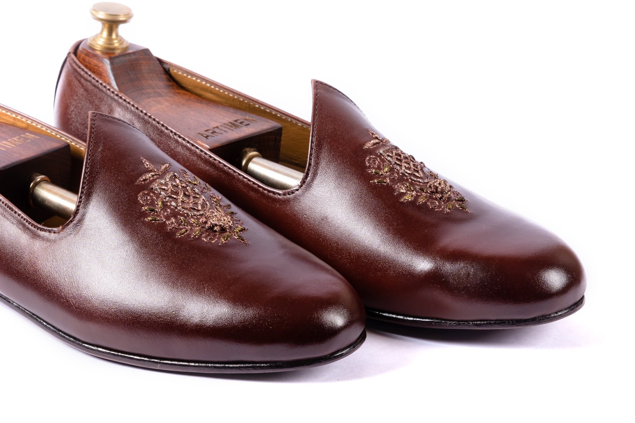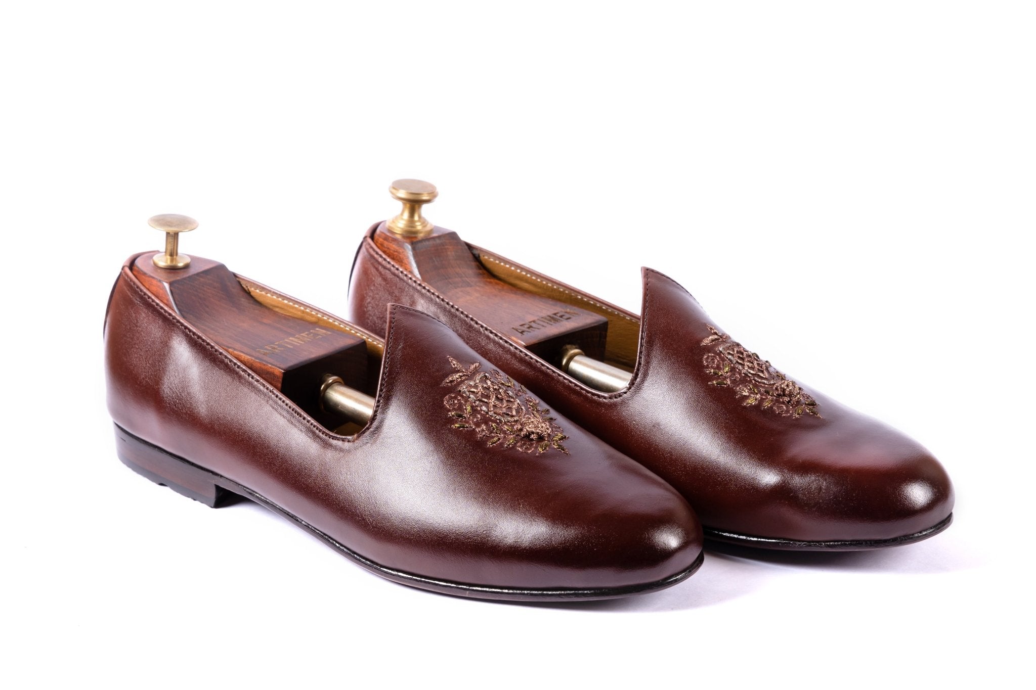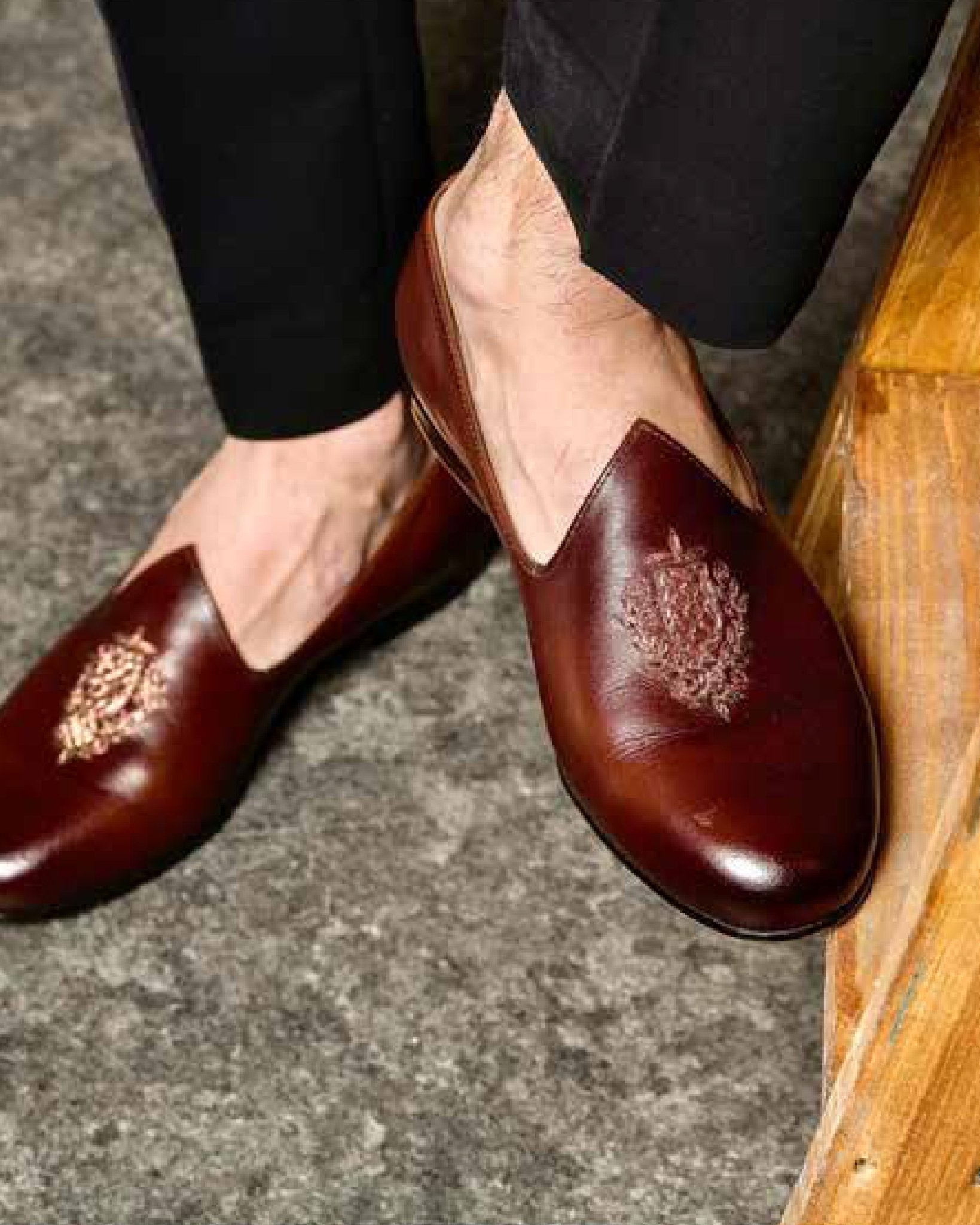 One of the hottest selling, most loved and appreciated pair. This Jutti shoe with a HAND EMBROIDERED motif has been a hit for all our clients across the world. Comfort and class at its best. Hand sprayed burnt brown is the new color in this jutti collection. Little away from the old school, this jutti shoe gives you the look and comfort of a loafer.Β