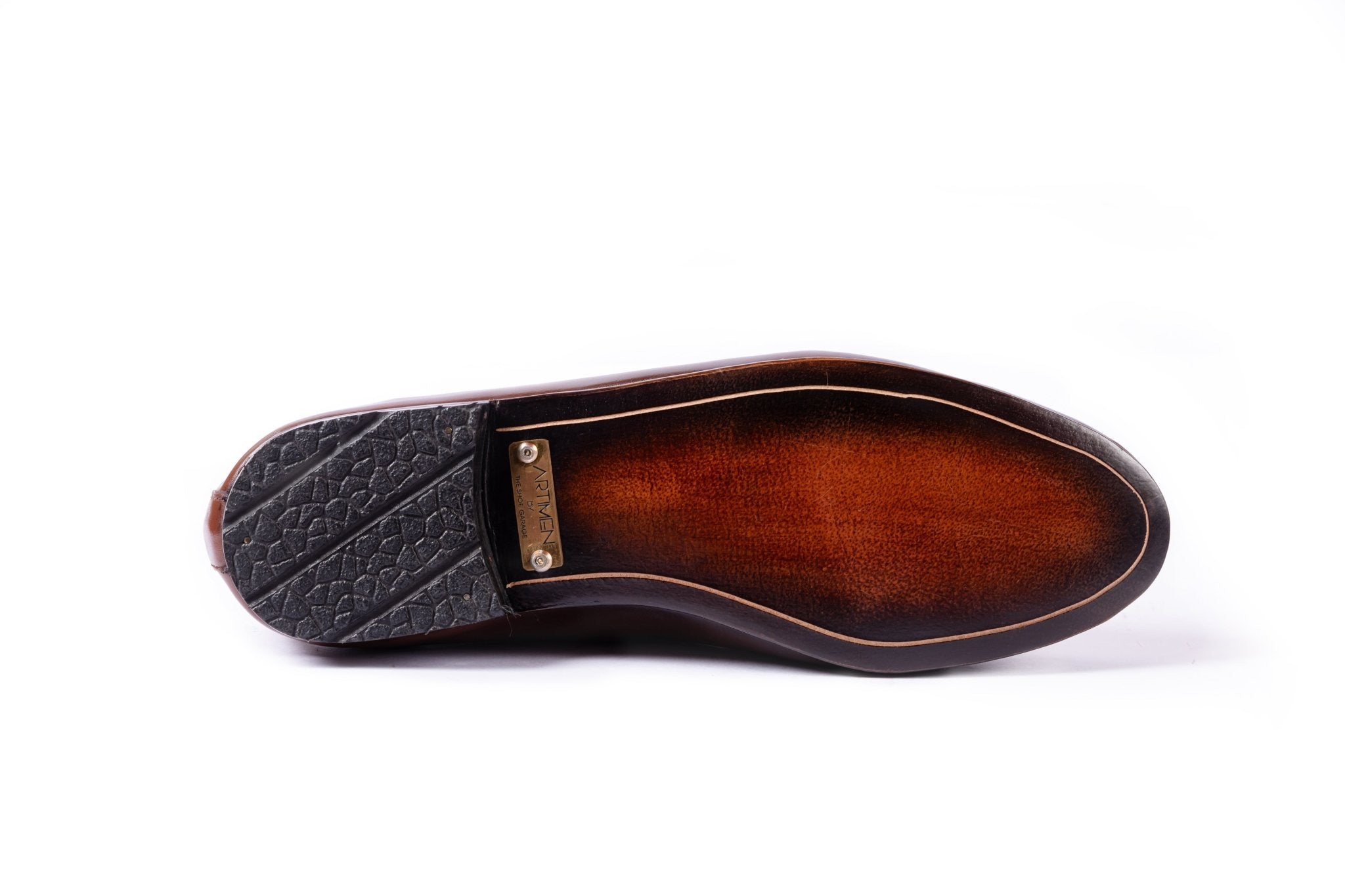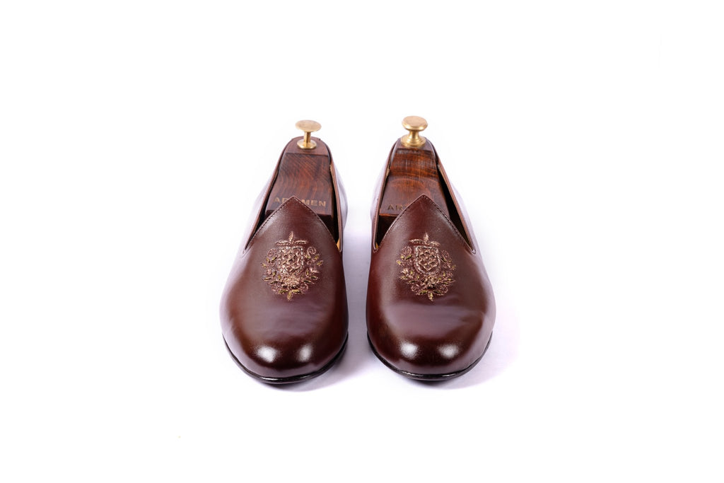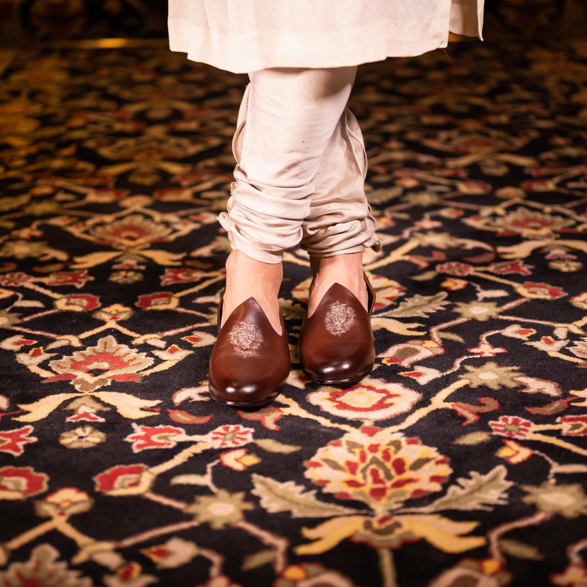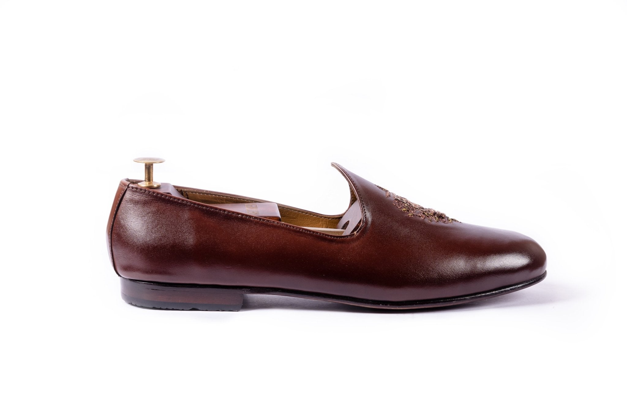 One of the hottest selling, most loved and appreciated pair. This Jutti shoe with a HAND EMBROIDERED motif has been a hit for all our clients across the world. Comfort and class at its best. Hand sprayed burnt brown is the new color in this jutti collection. Little away from the old school, this jutti shoe gives you the look and comfort of a loafer.Β