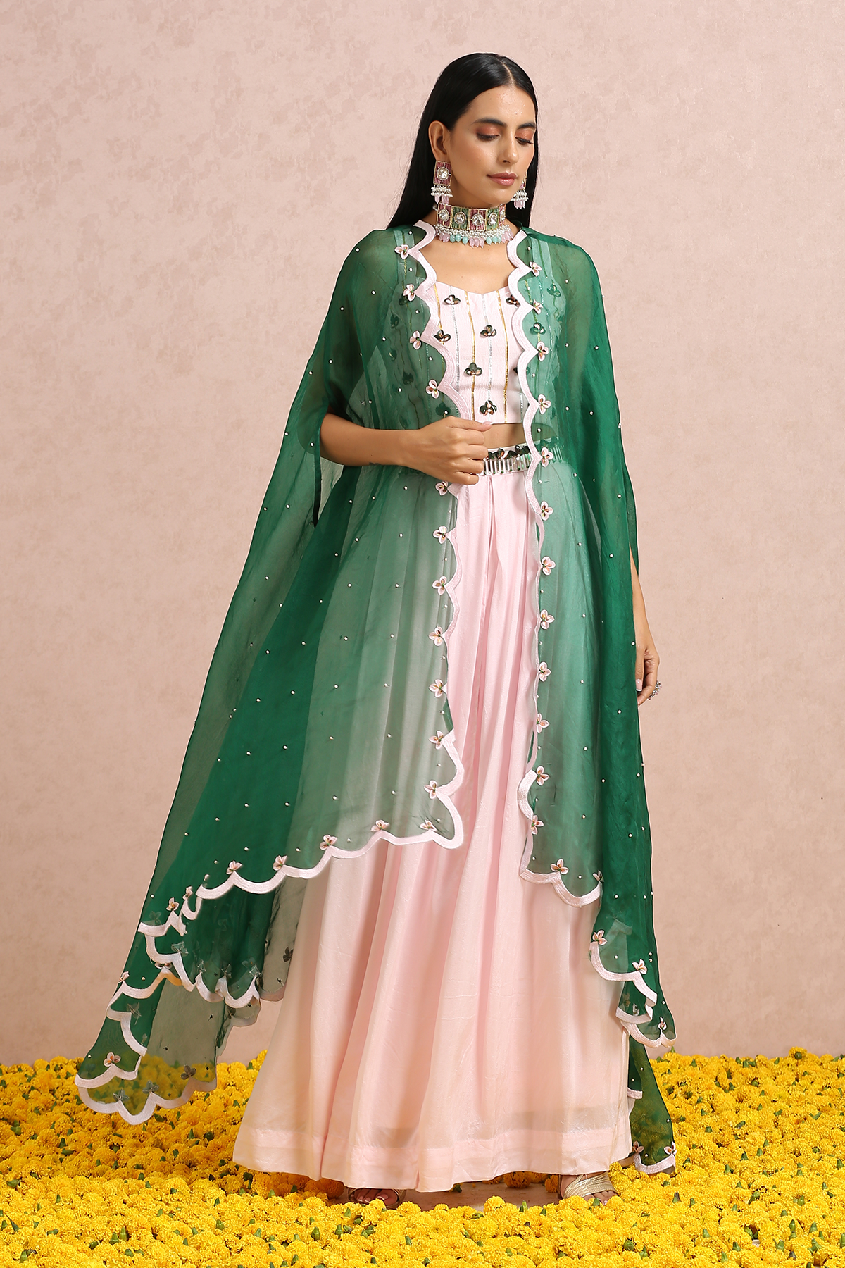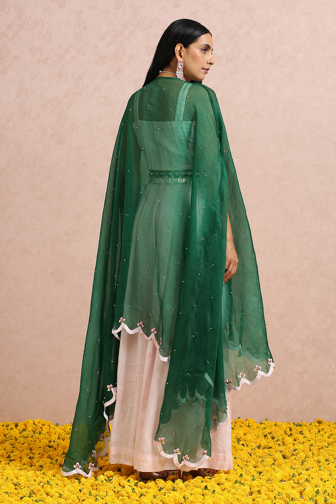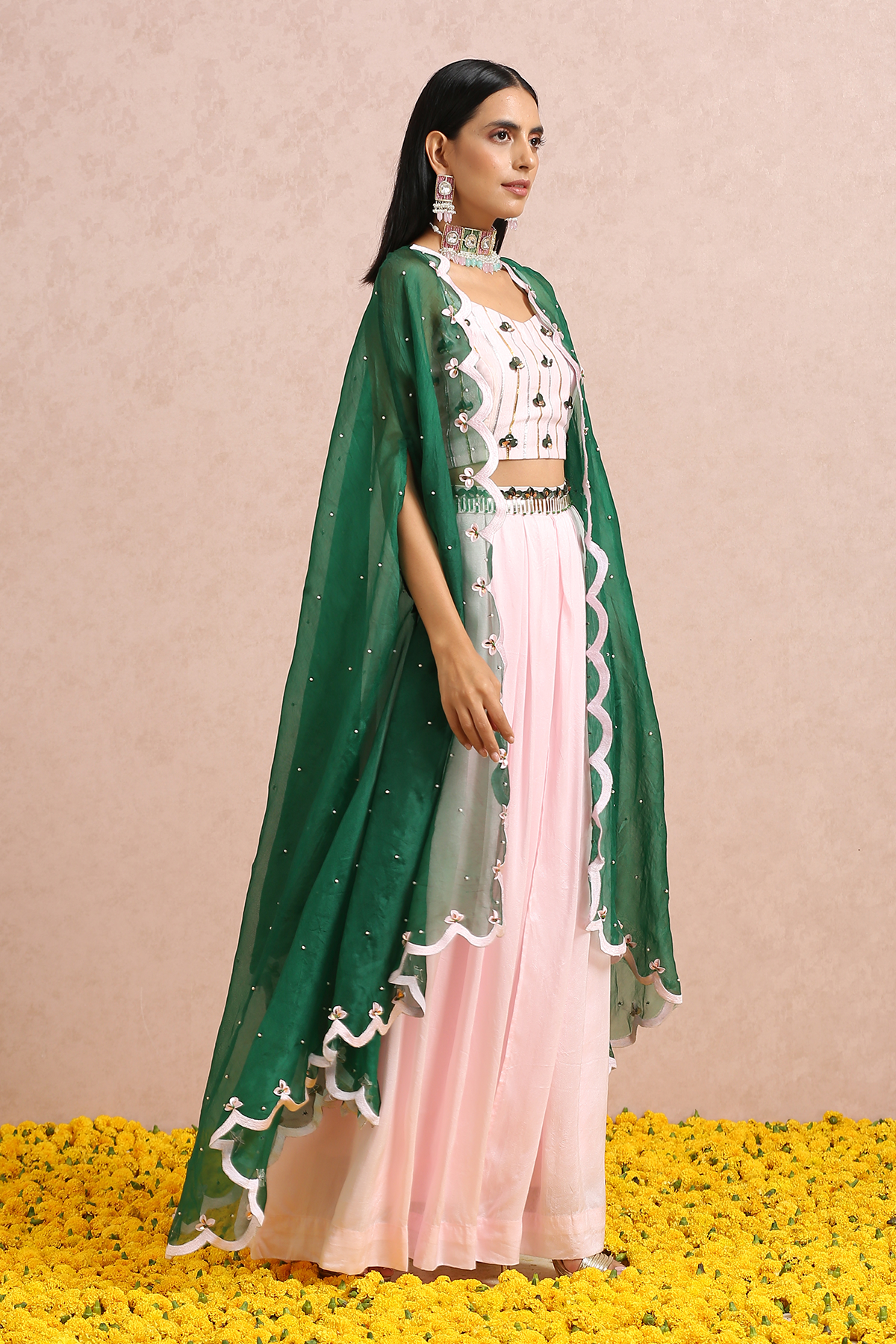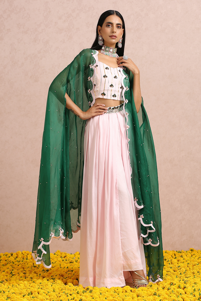 Featuring a baby pink palazzo in lightweight silk base . It comes with a baby pink gota striped covered blouse having hand embroidery.It is paired with an emerald green scalloped silk organza cape with beads all over.