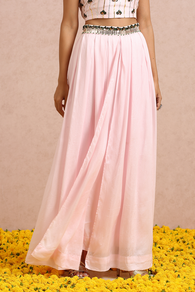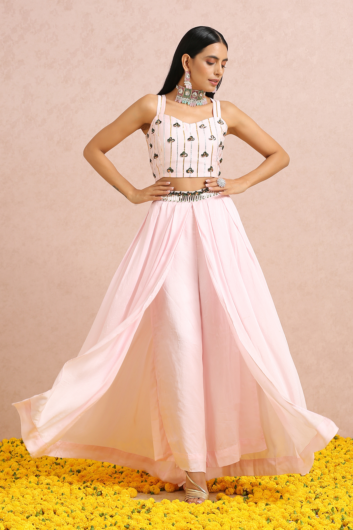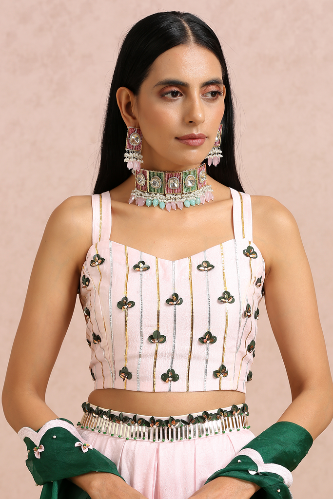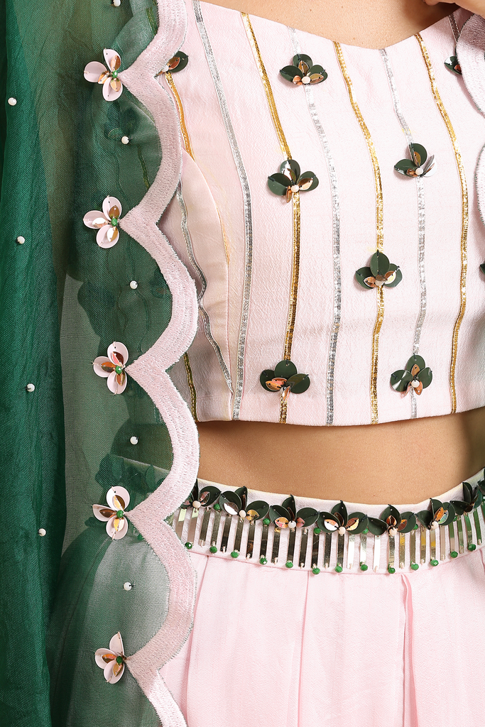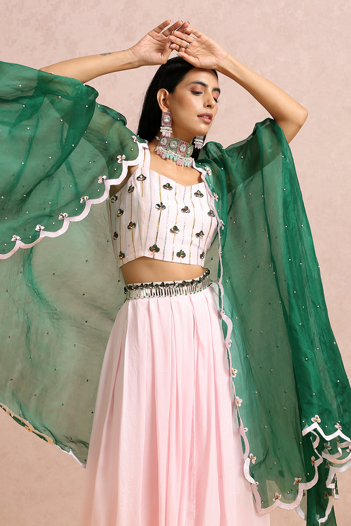 Featuring a baby pink palazzo in lightweight silk base . It comes with a baby pink gota striped covered blouse having hand embroidery.It is paired with an emerald green scalloped silk organza cape with beads all over.