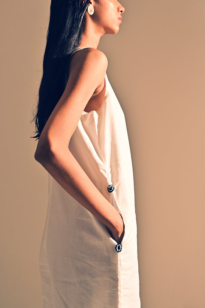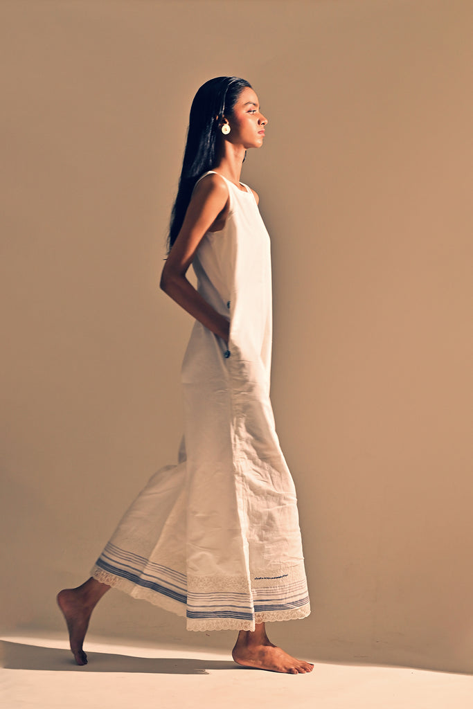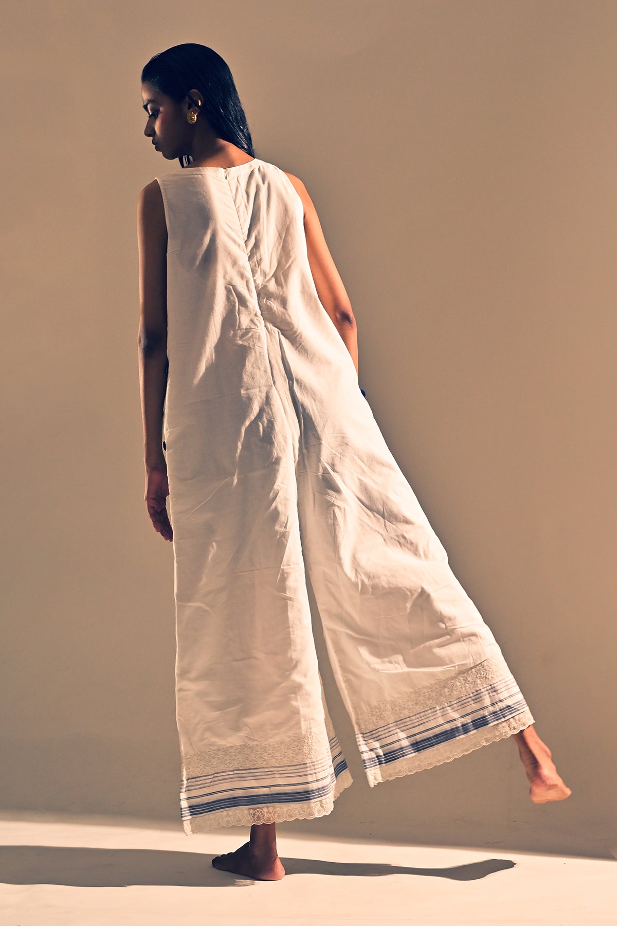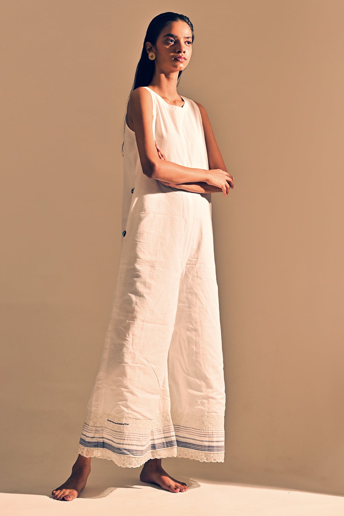 Round Neck Flared leg jumpsuit with embroidered lace at the hem.