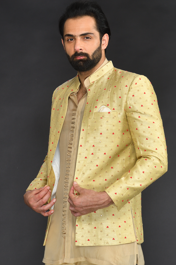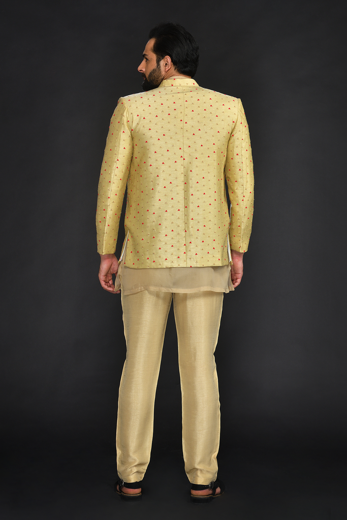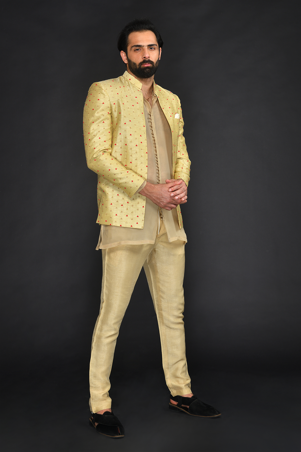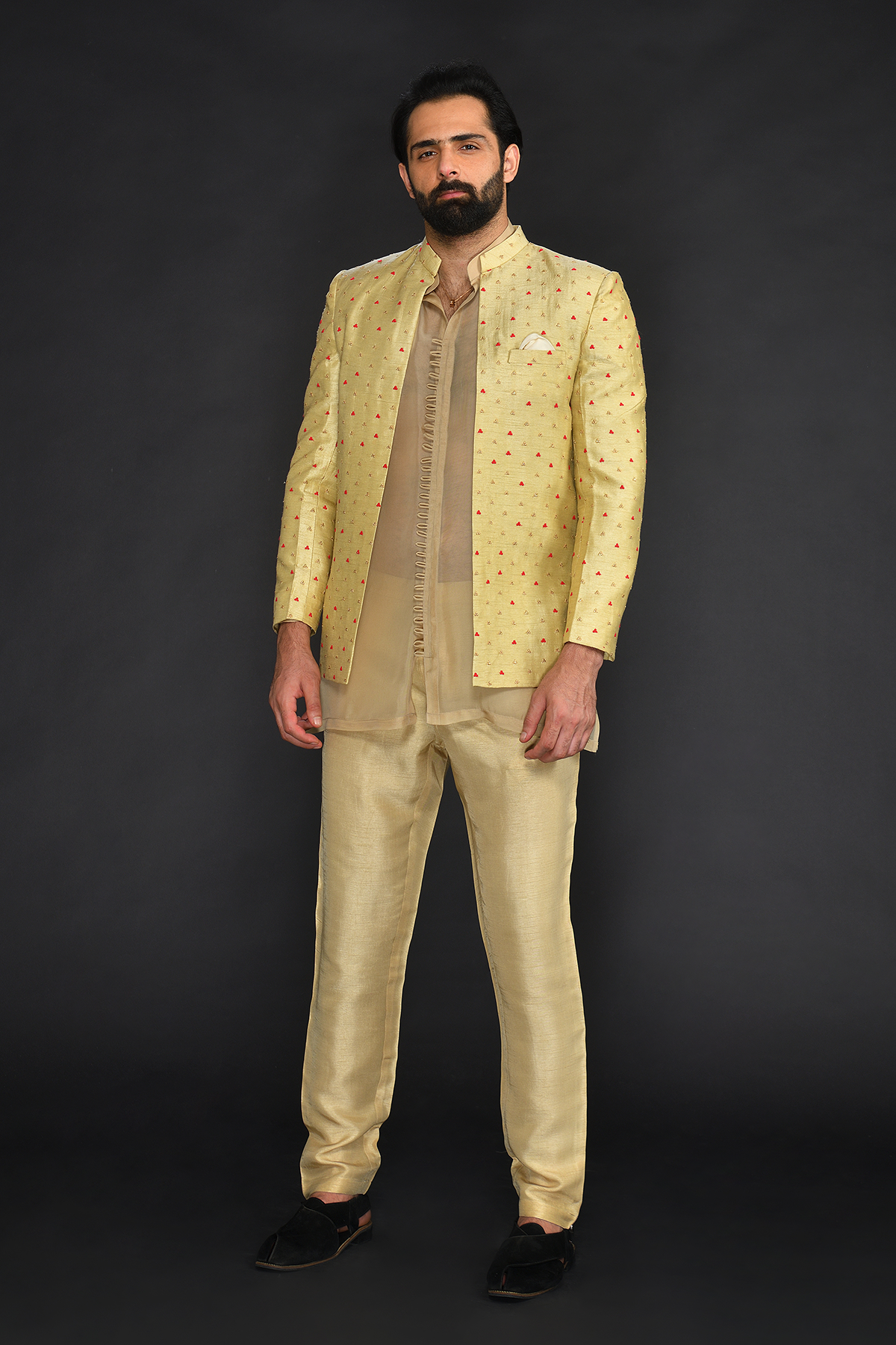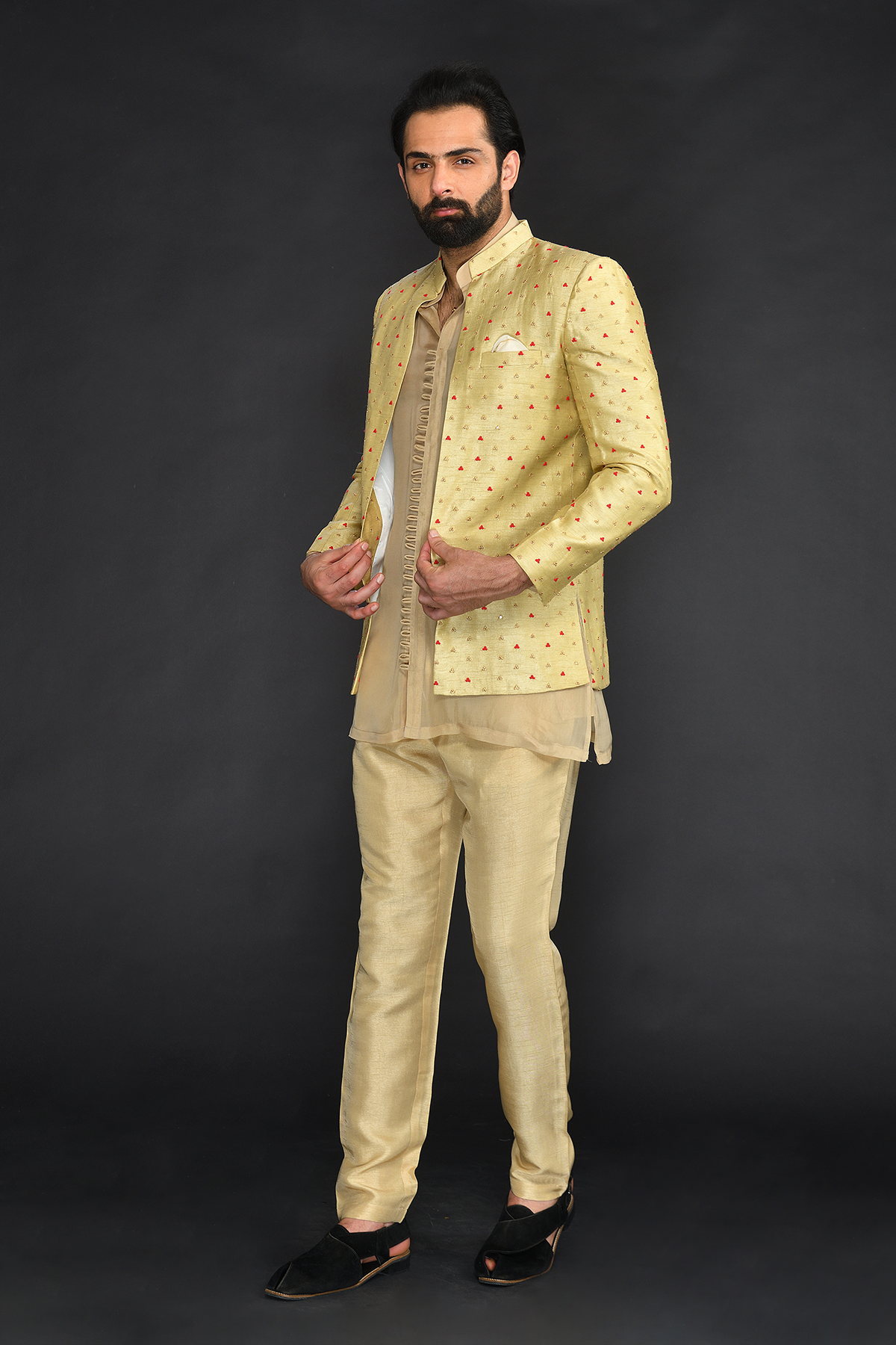 Beige Bandgala with Organza Fabric kurta and slim pant.