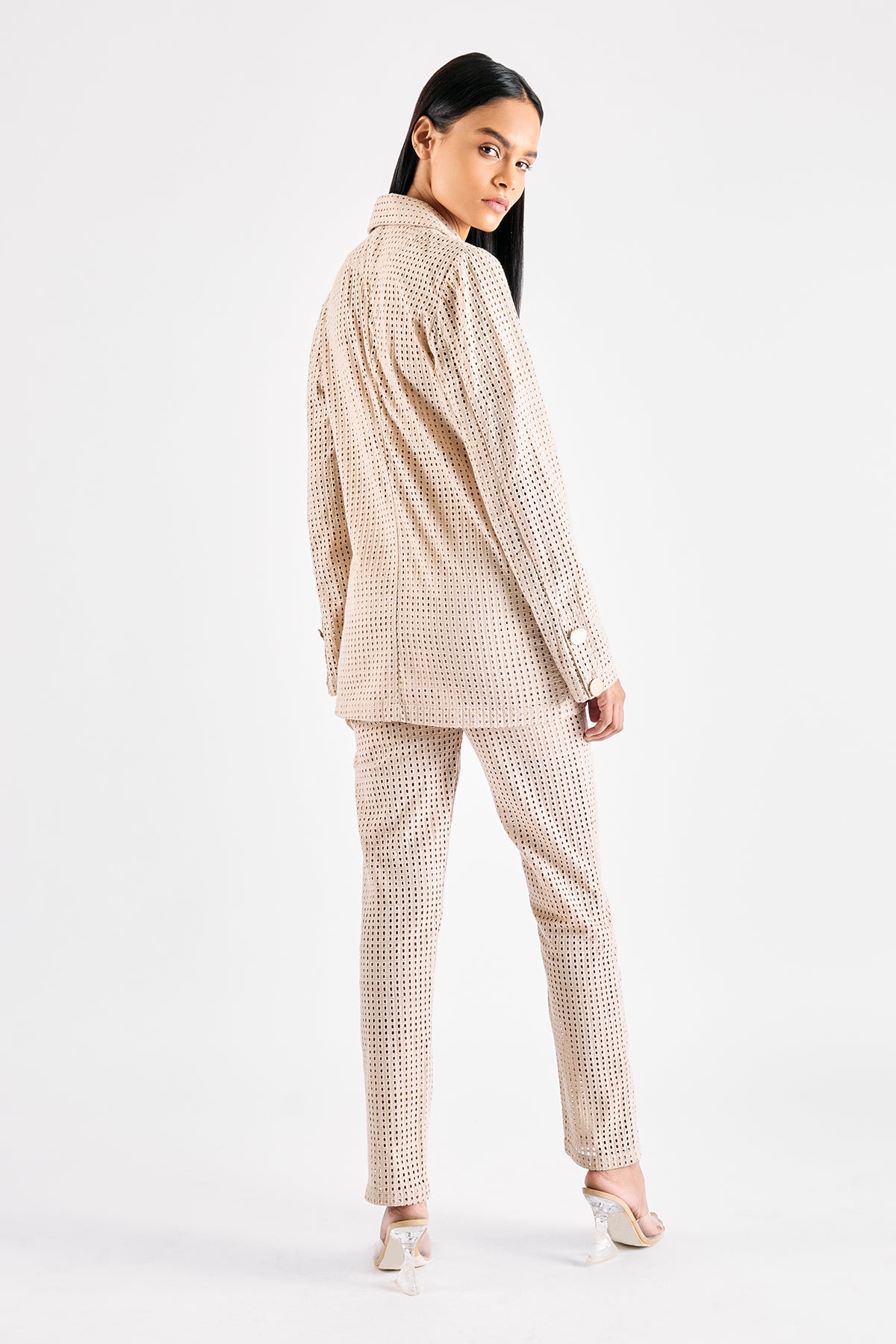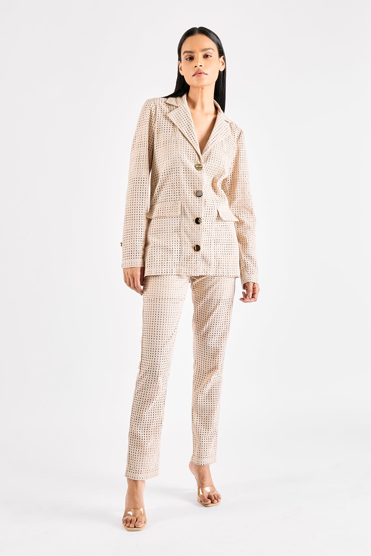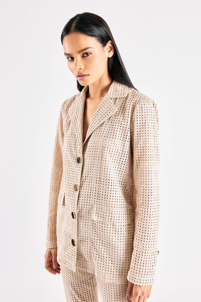 100% Cotton Light weight schiffli blazerWithout liningFlap Pockets at front Regular fitFront Opening with ButtonsFull sleeves with buttons