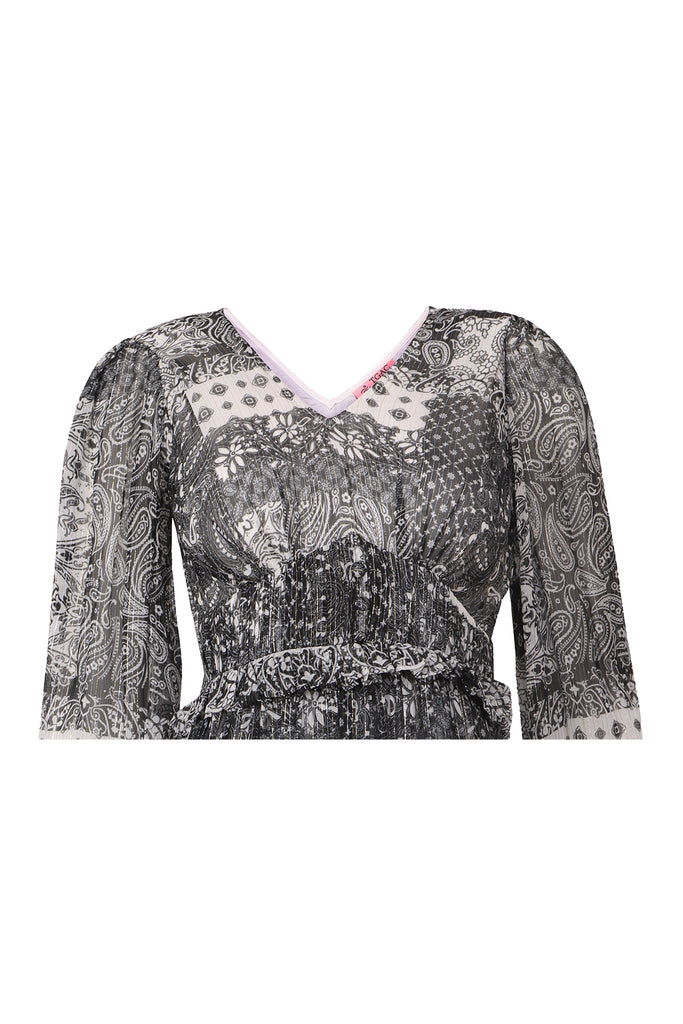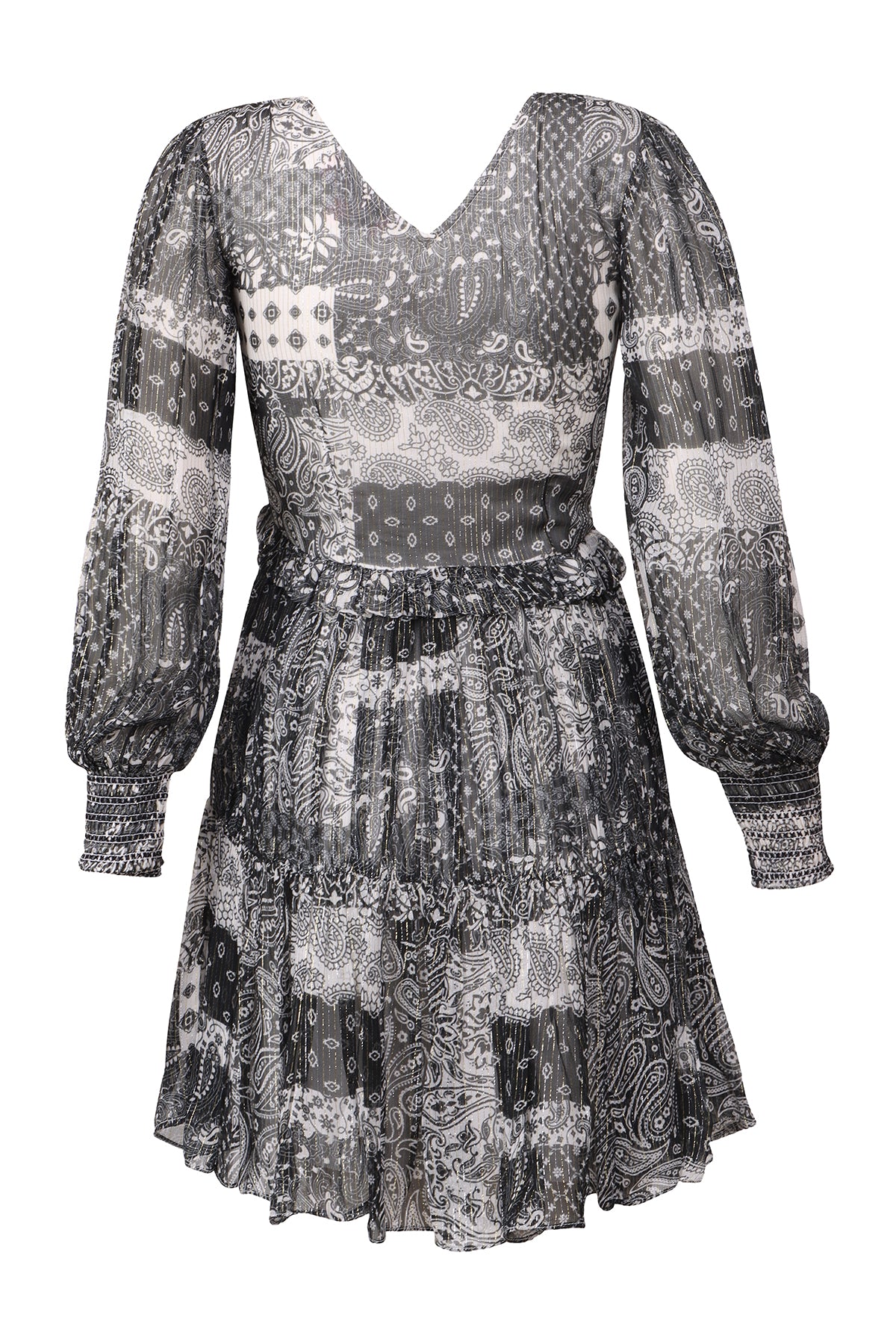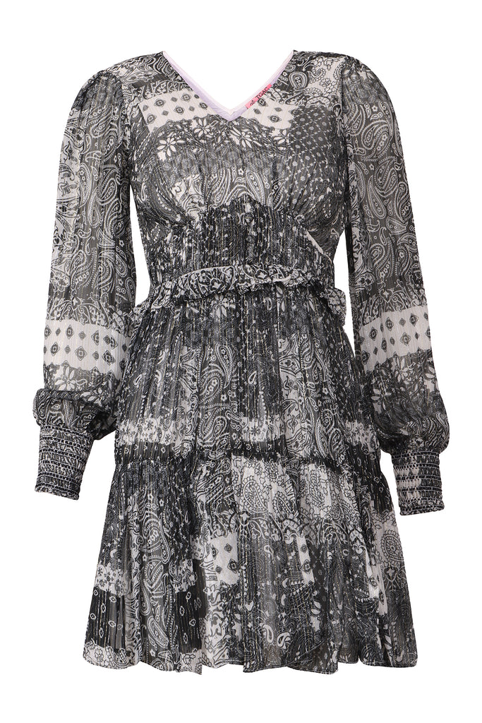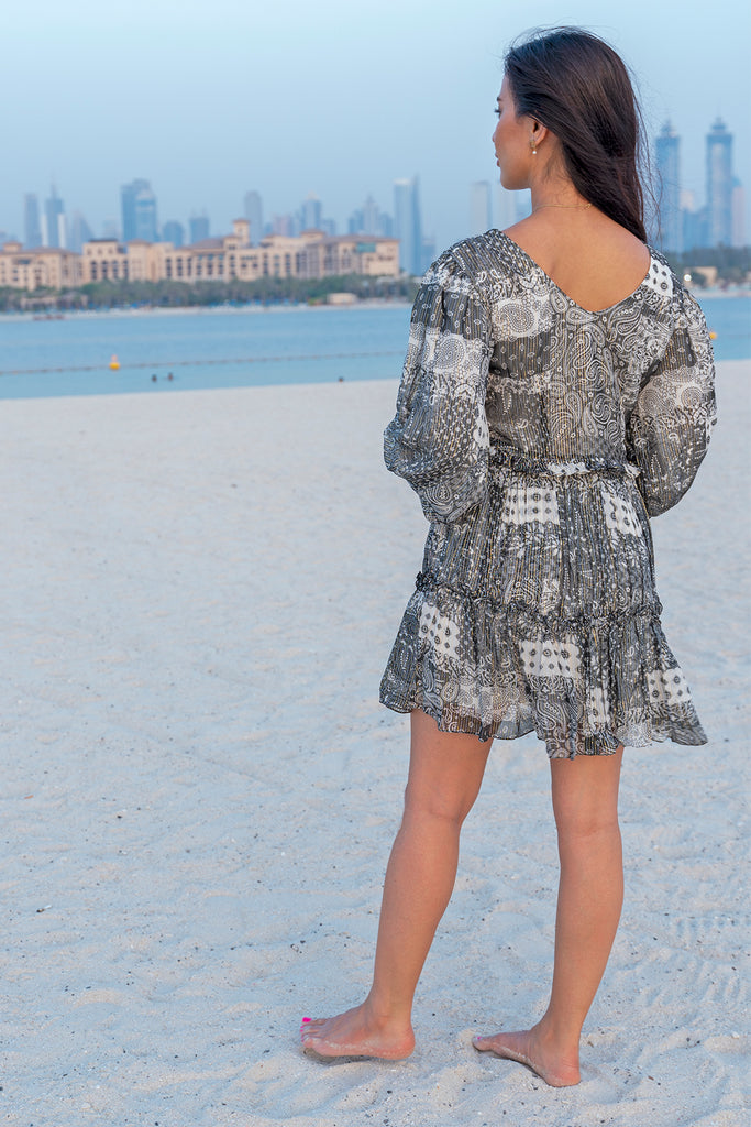 Delicate affair Bandana print dress from luxurious viscose georgette, features a billowy blouson sleeve, a deep v neckline and a relaxed flowy skirt crops at a mini silhouette. This frill dress with darts on the bust blends a rich grey hue sheathed in splashes of sensual notes and bouquets of playful designs that embrace the erotic side of a sensual woman.