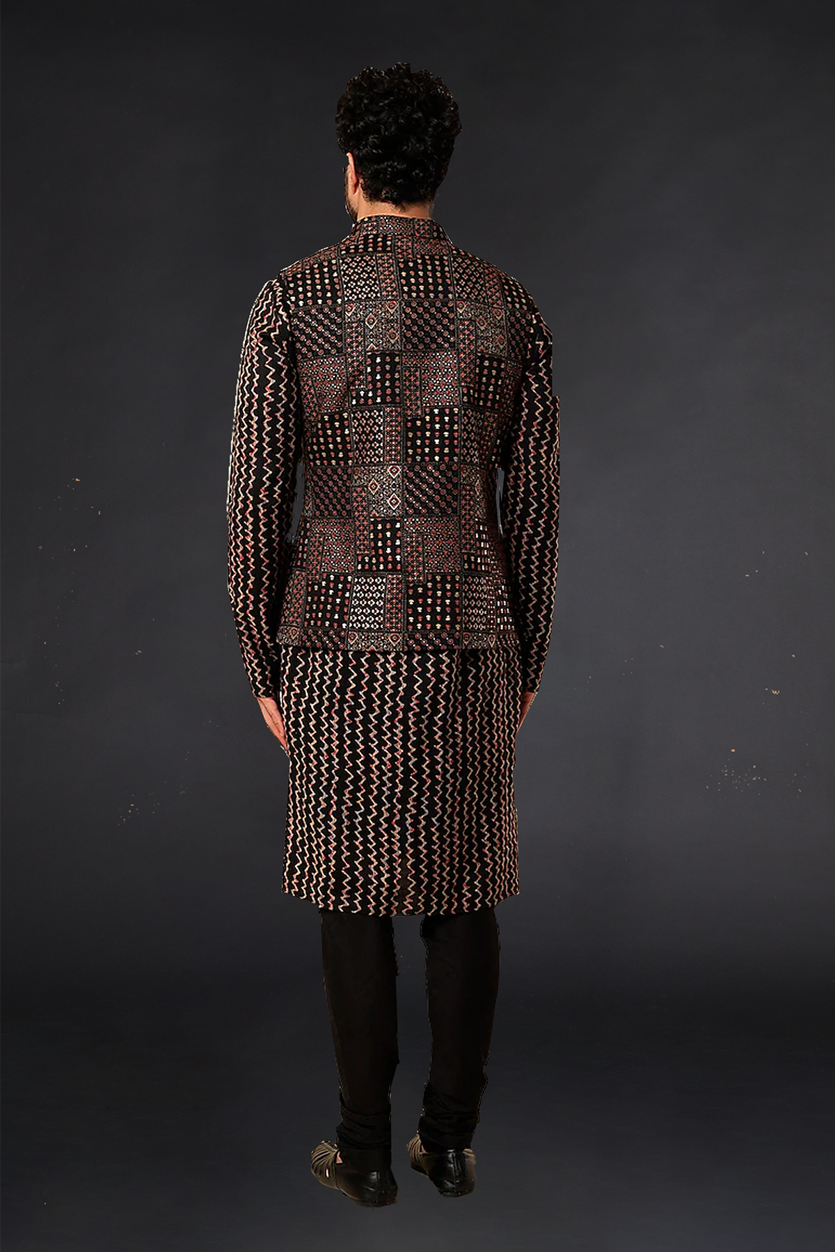 Fabric Compostion: Velvet, Vis Silk, Spun Cotton Lining Material: 100% CottonColor: Black GoldFit: RelaxedNeck Type: Collar