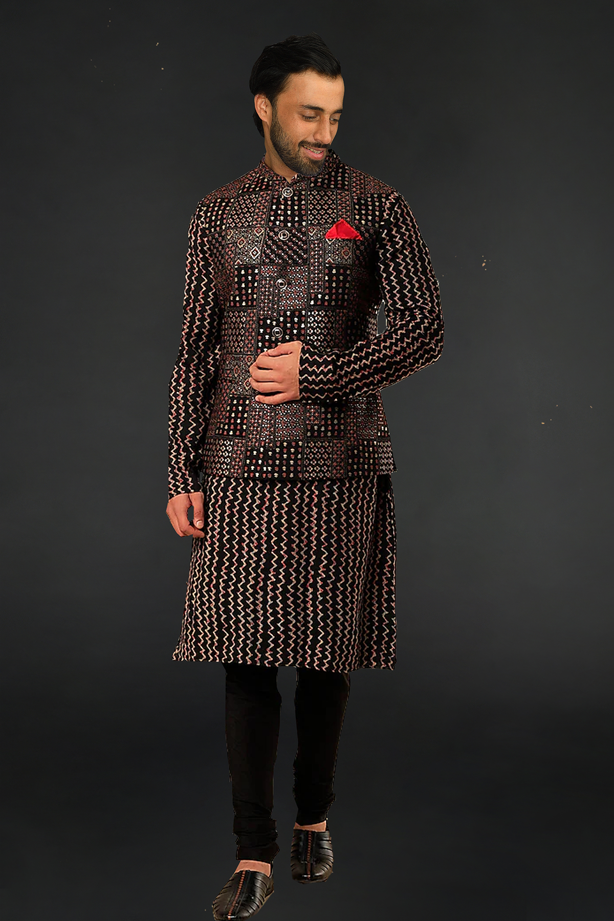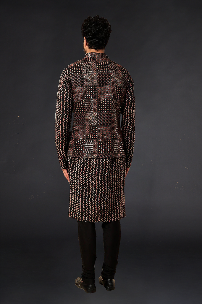 Black Gold Printed Bundi with Kurta and Chudidar.