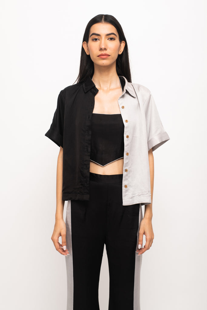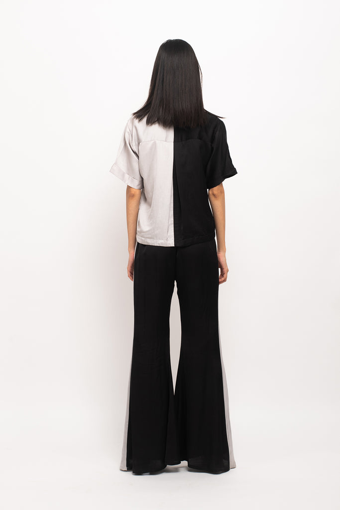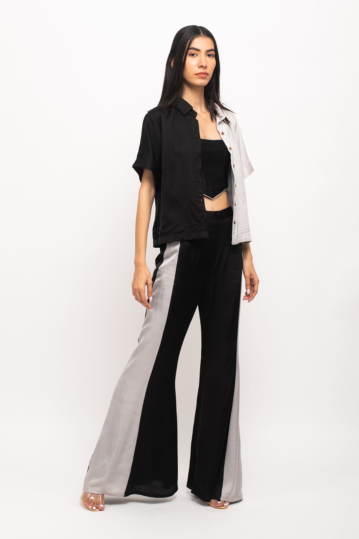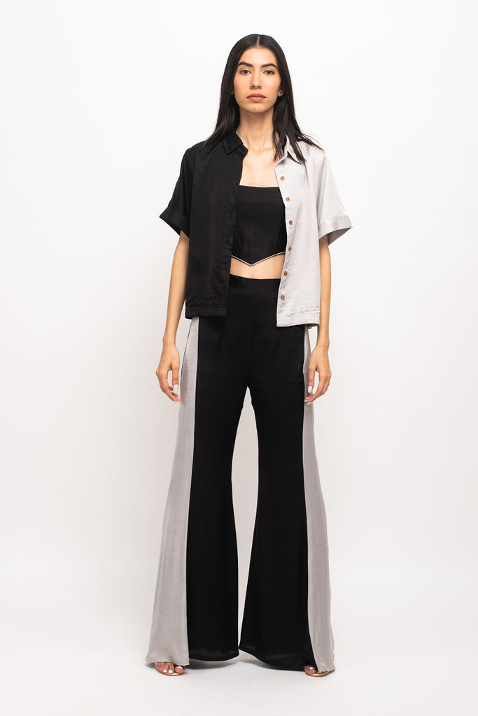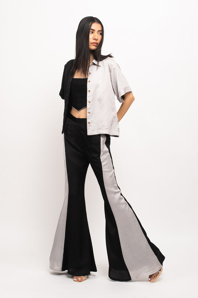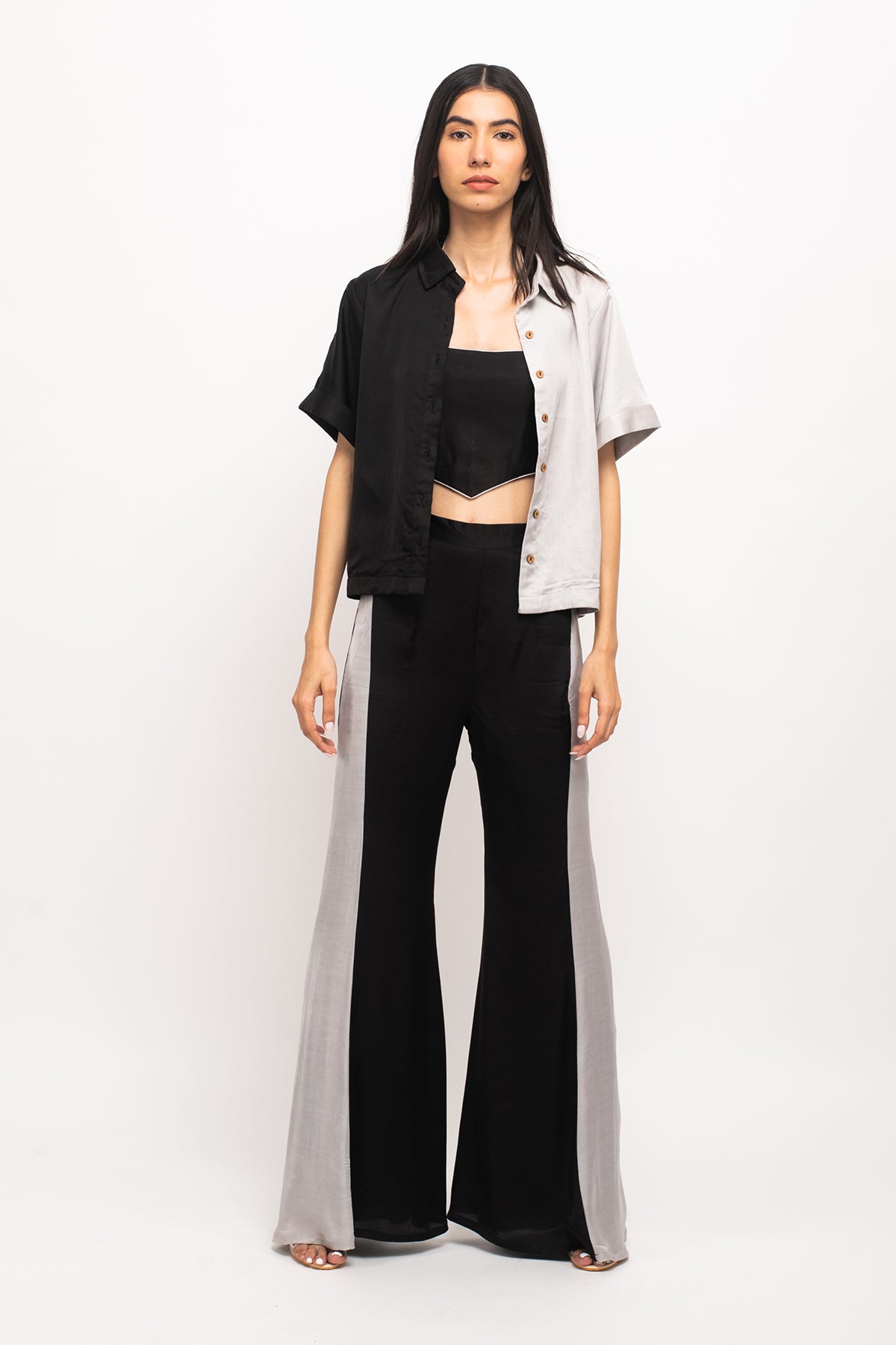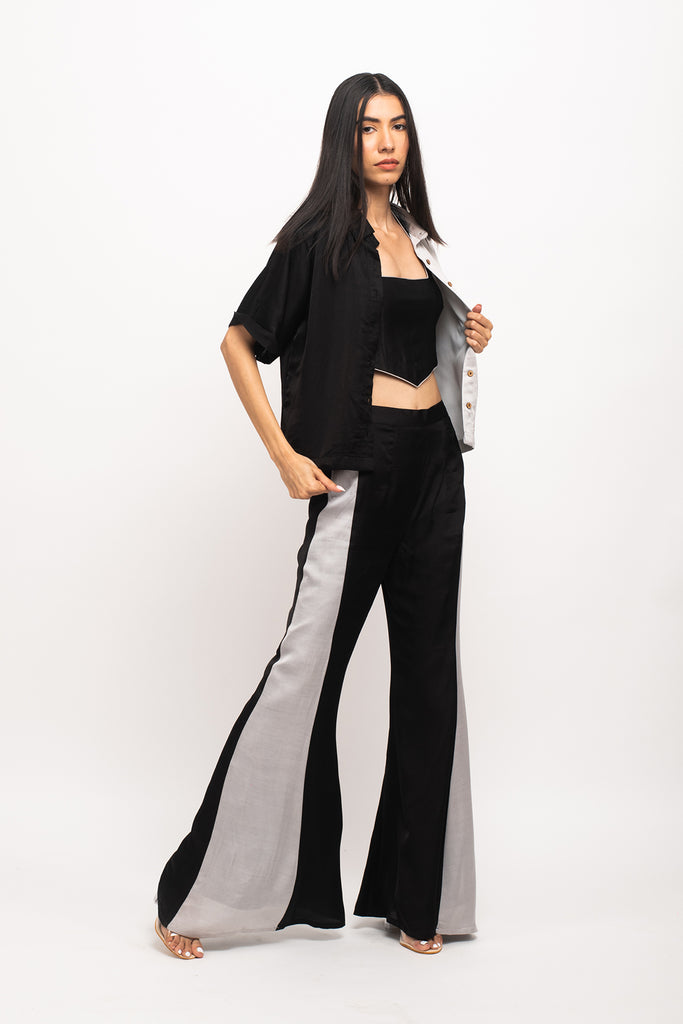 Black-Grey three piece set with half and half crop shirt, black bustier with grey pipin throughout and black flared pants with grey panels on either sides.