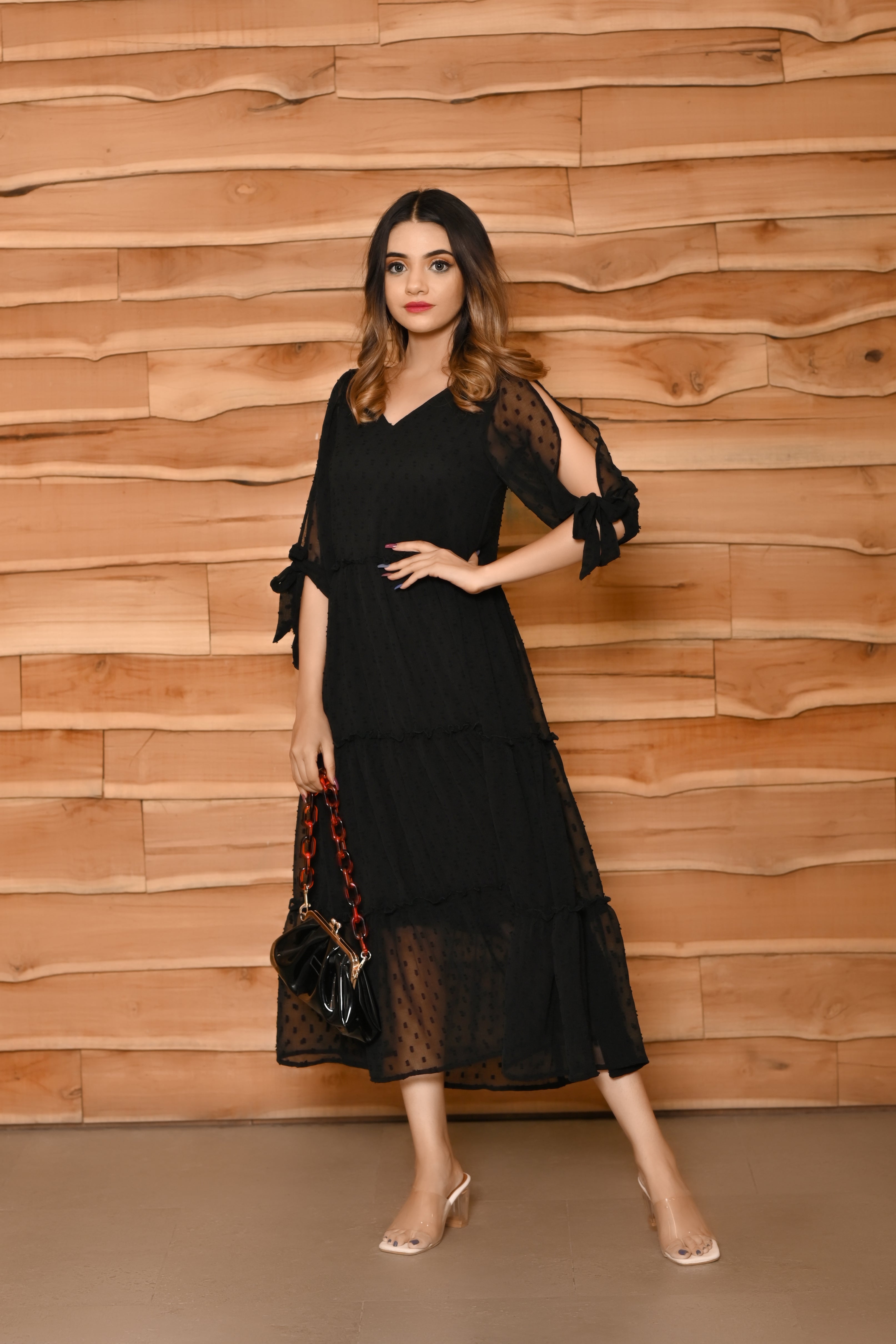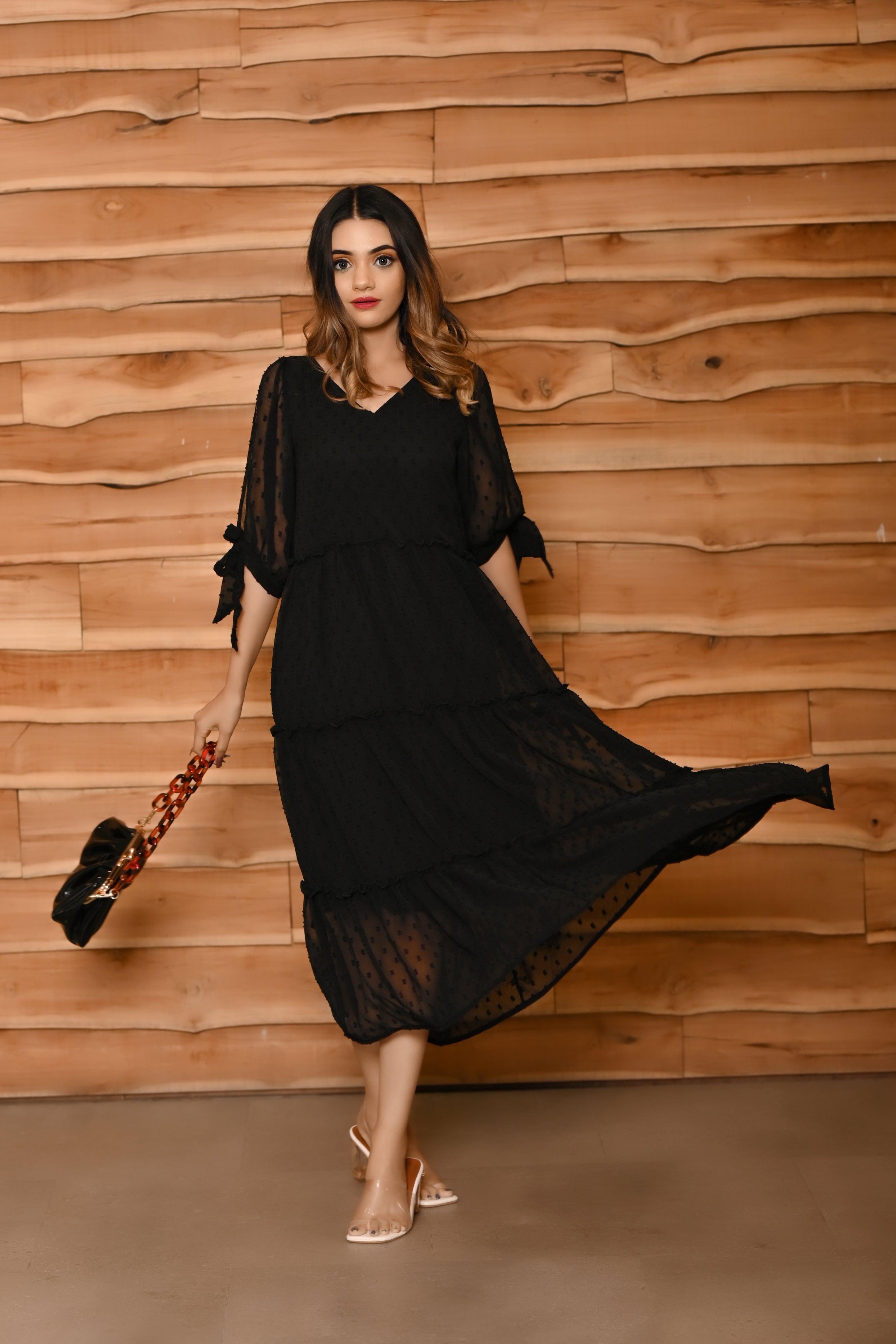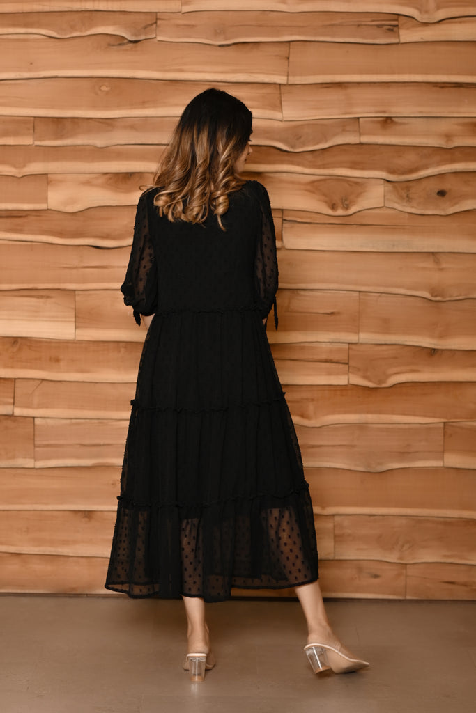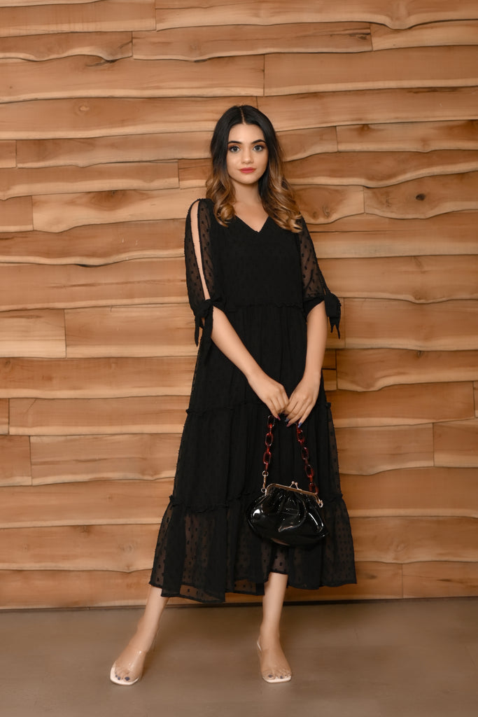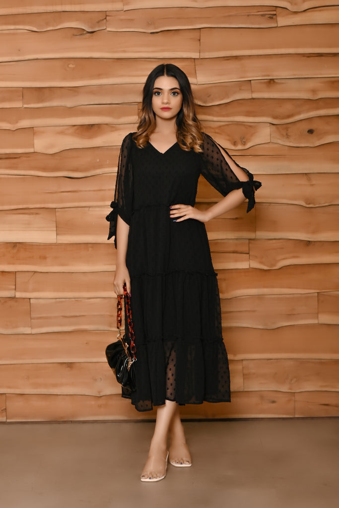 This black colour tier dress has a V neck. This zet black midi length dress has very beautifull elbow length knotted sleeves. Made from very soft and sheer chiffon butta fabric, it is soft and comfortable to wear. shop now online from MANNMANI