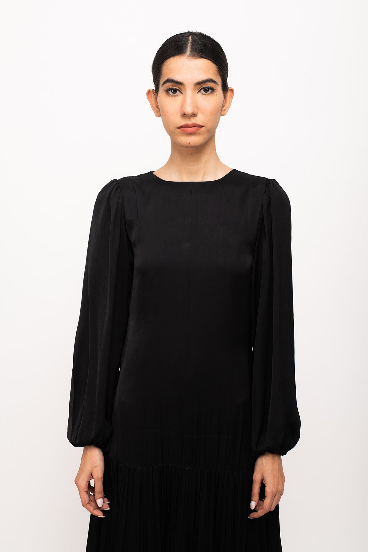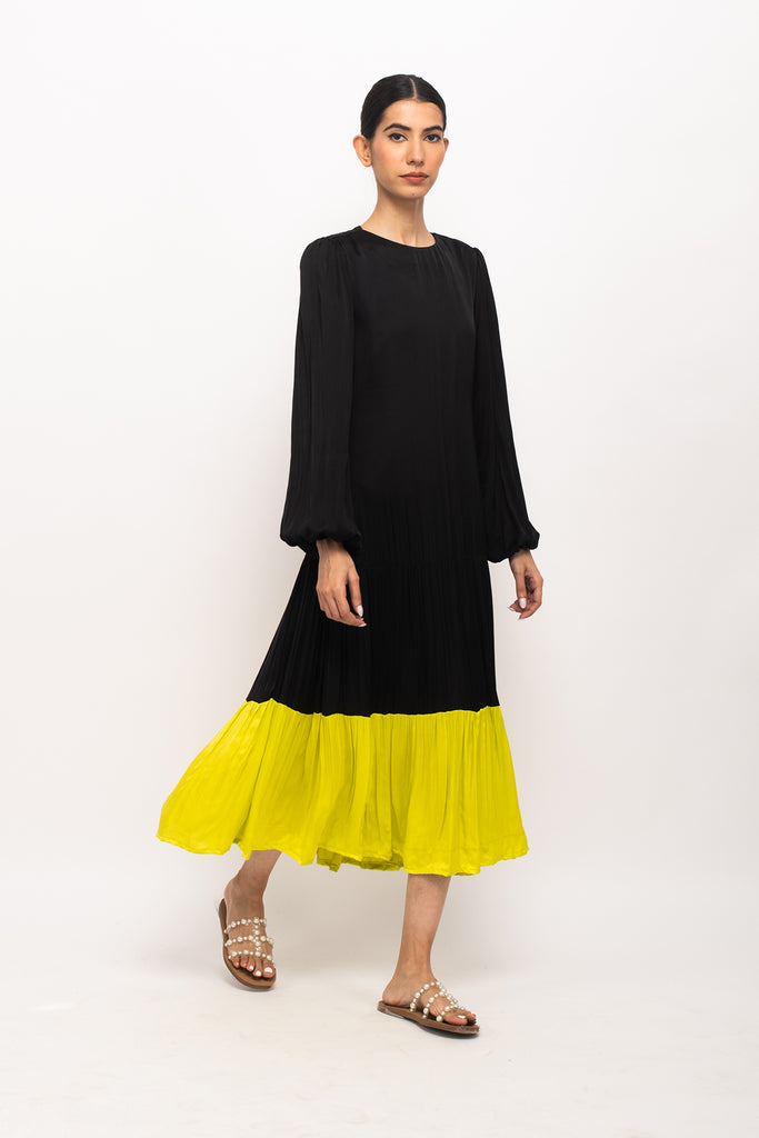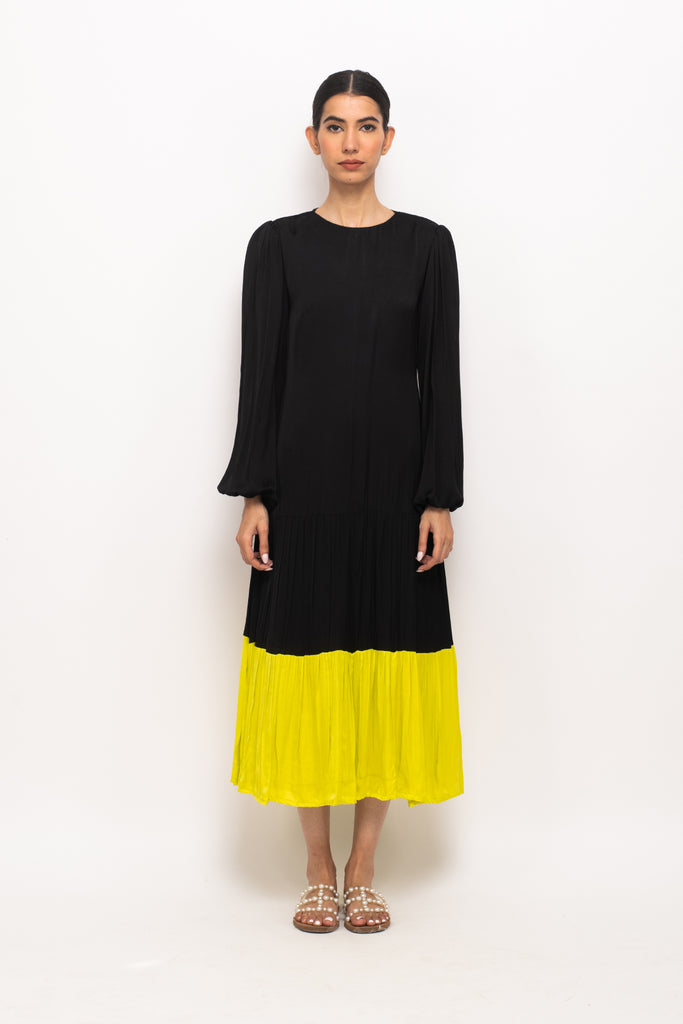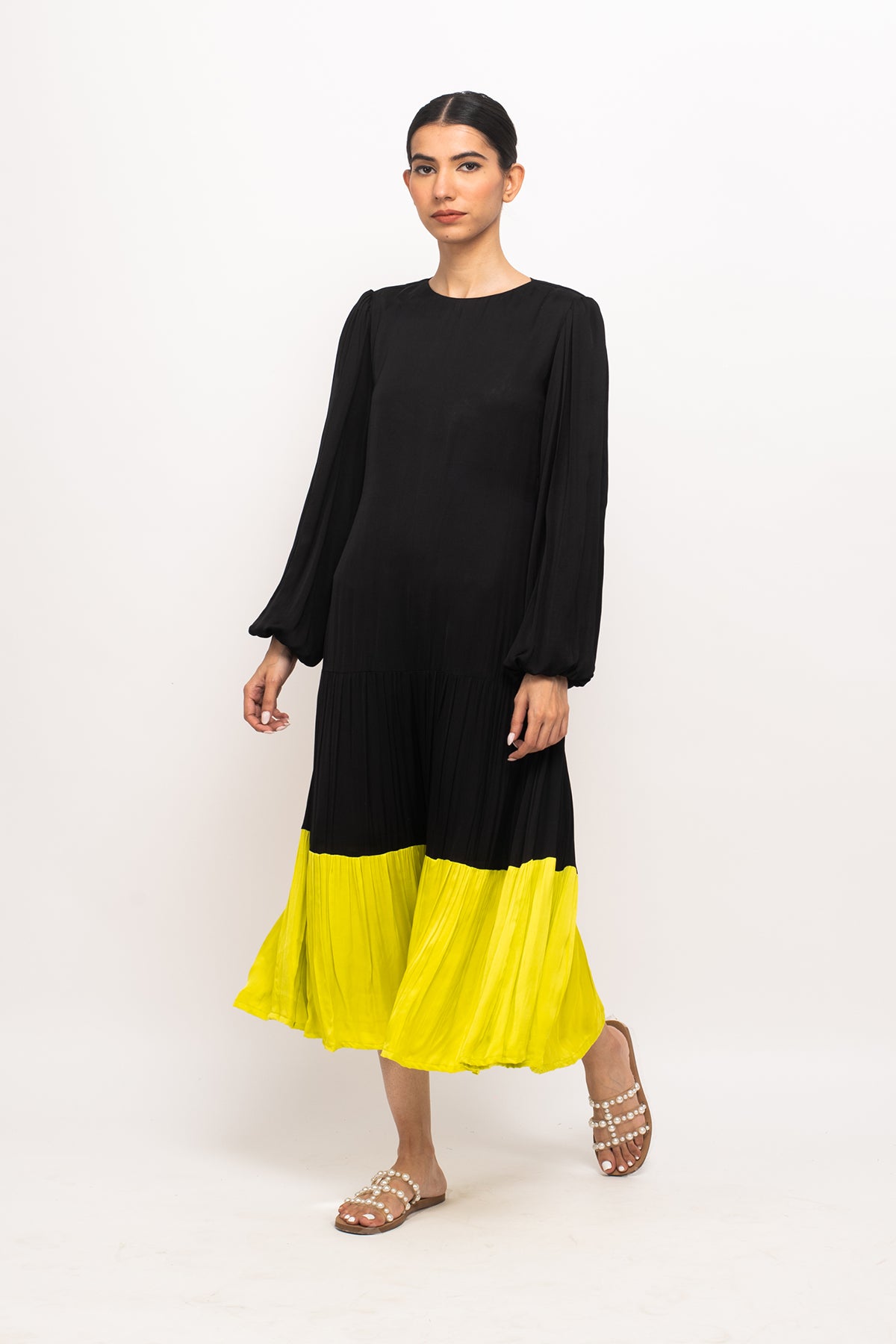 Black-Neon maxi dress with full sleeves and wine gathers at the end.