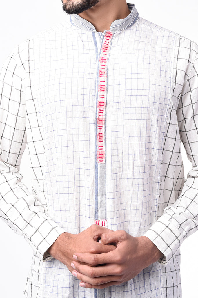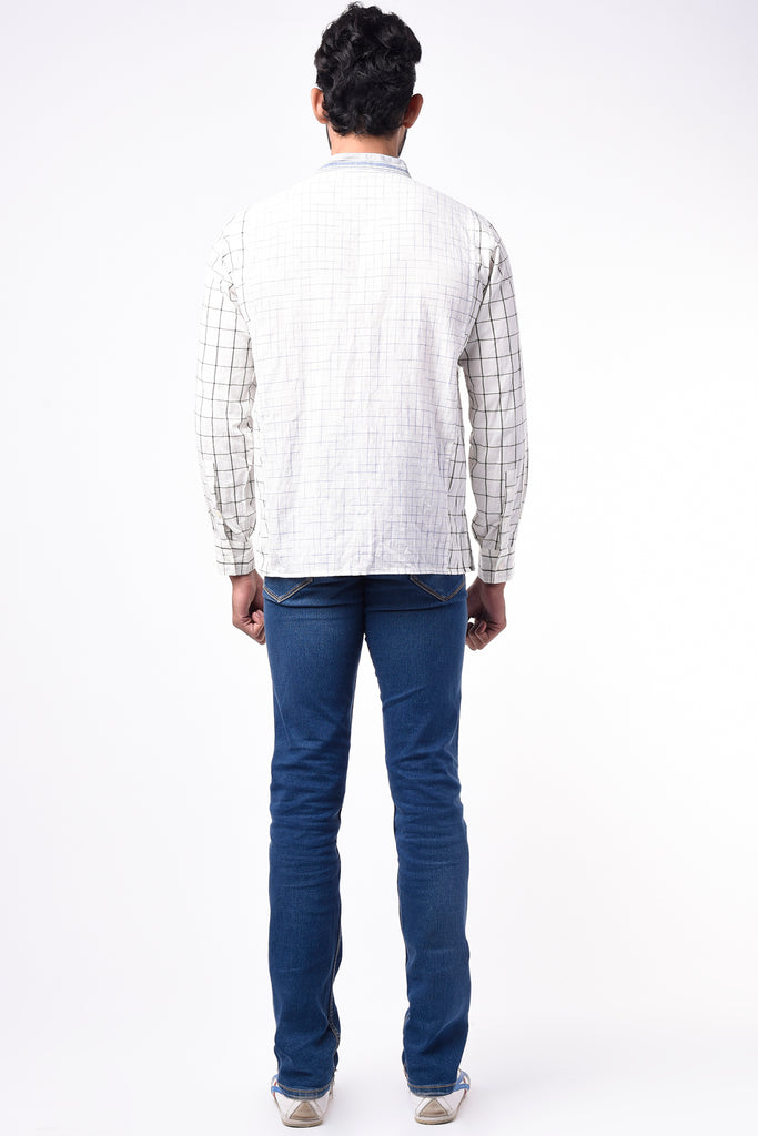 Featuring A Blue And Monochrome Checks Cotton Shirt With Anchor Embroidery Detail And Side Pockets.