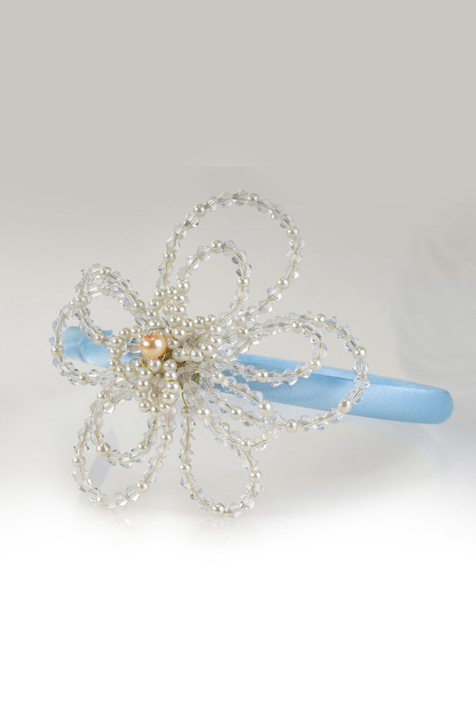 Intricately designed Pearls and Crystals in the shape of blooming petals are set against a Blue Satin band. A popular piece for spring and summer fashion.