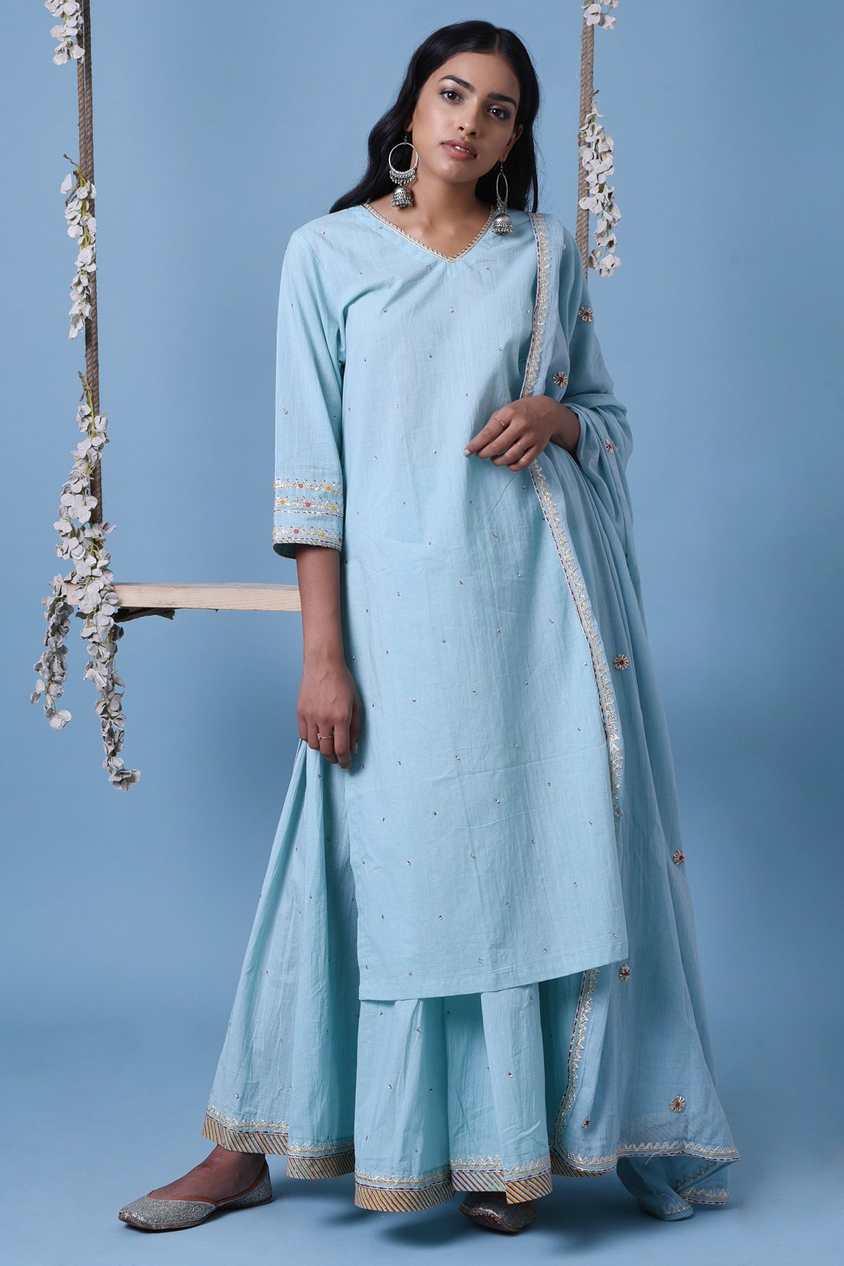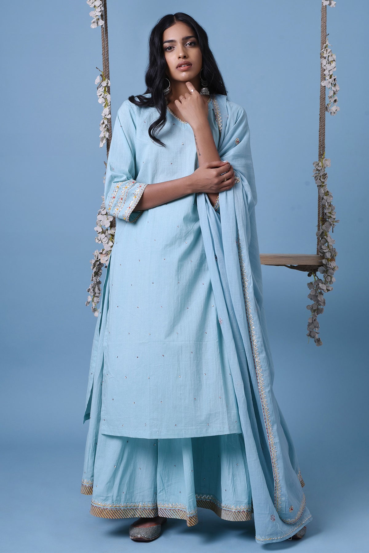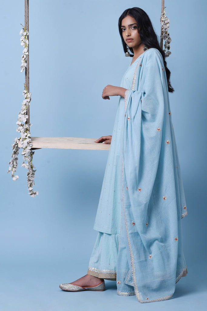 Light Blue Kurta is made of cotton and embroidered with gota and bead work. Skirt is made of cotton and embroidered with gota nad bead work, Dupatta is made of cotton mul mul and hand embroidered with gota and bead work.