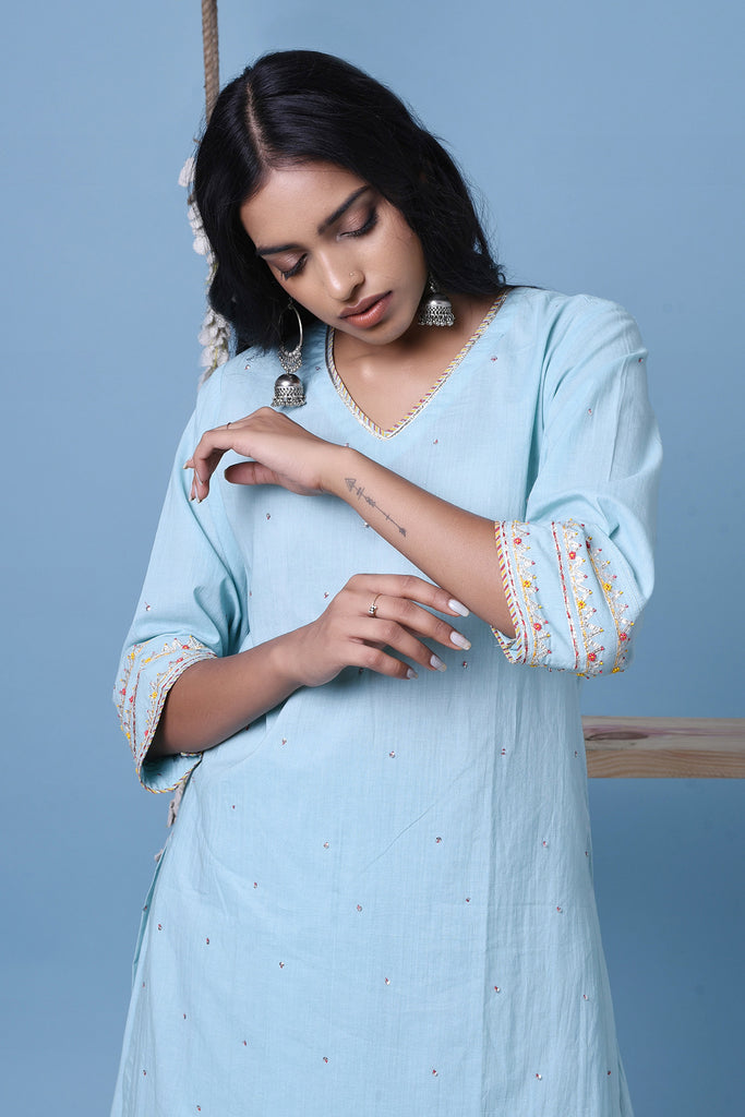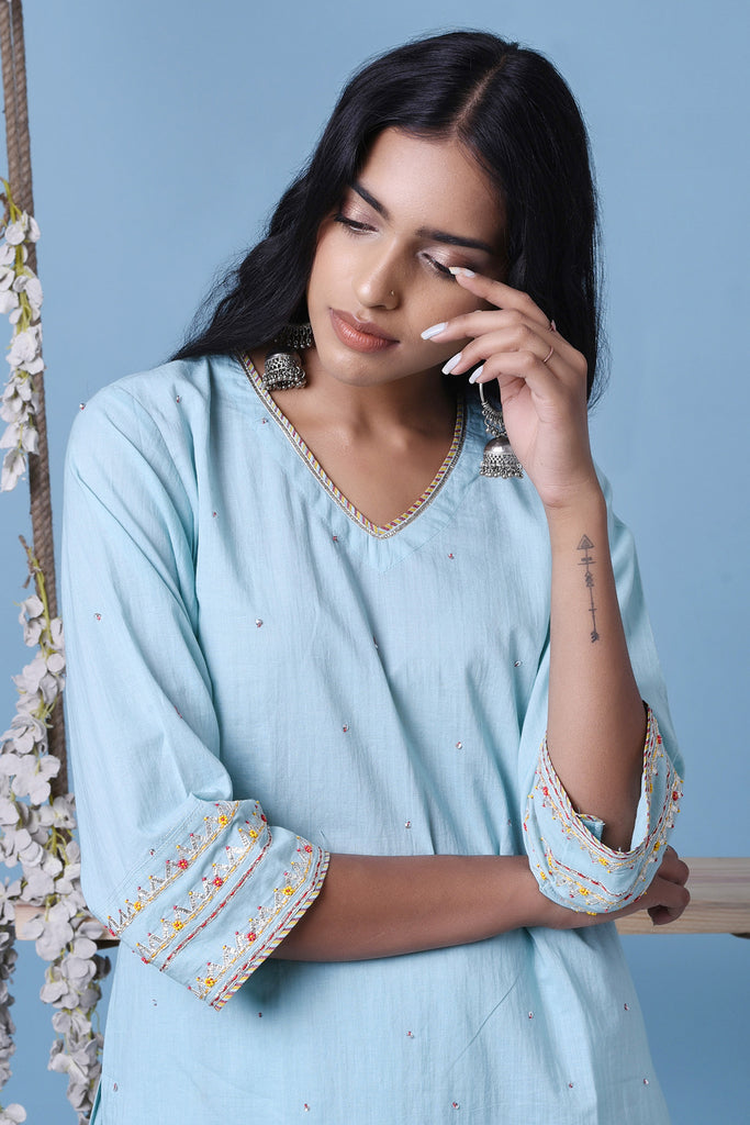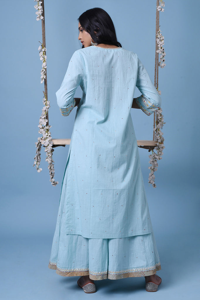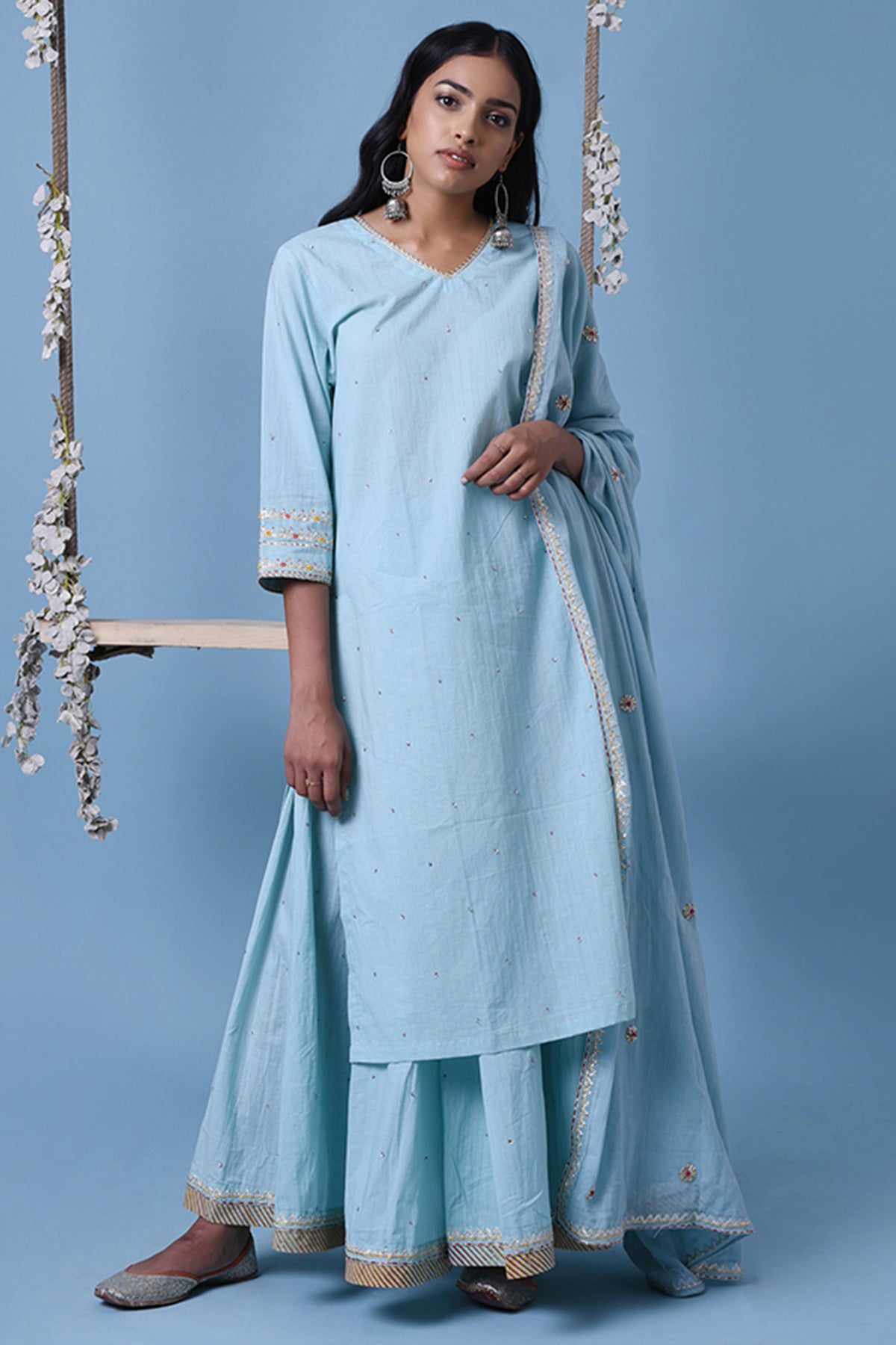 Light Blue Kurta is made of cotton and embroidered with gota and bead work. Skirt is made of cotton and embroidered with gota nad bead work, Dupatta is made of cotton mul mul and hand embroidered with gota and bead work.