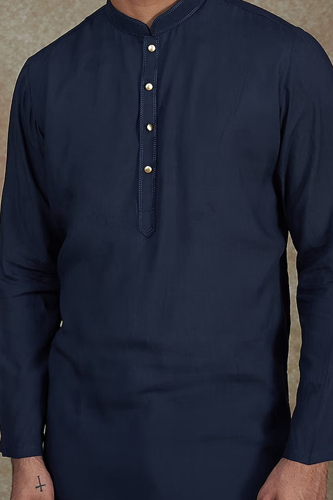 Blue Kurta with Machine Embroidery on Collar and Placket paired with Pant.