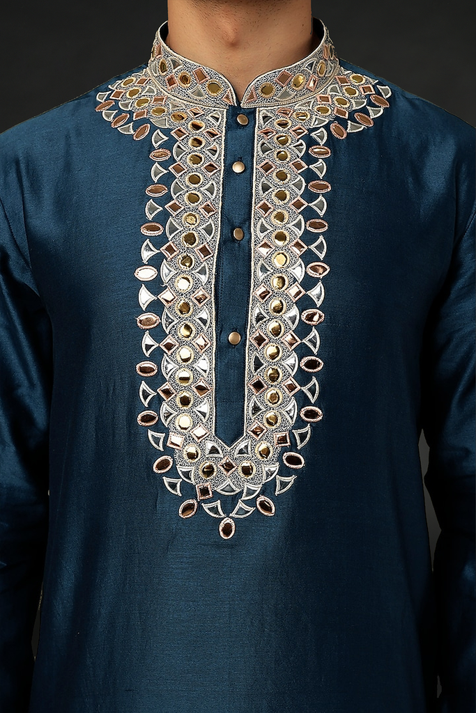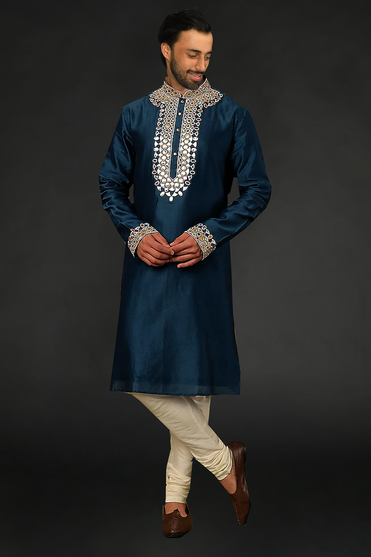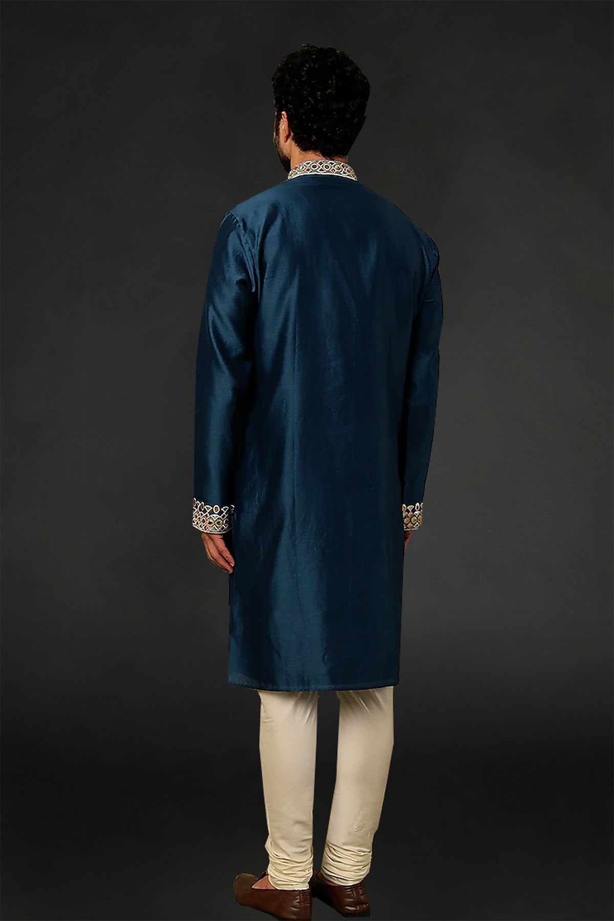Blue Pure Applique Thread Embroidery Kurta with spun silk Off white Chudidar Bottom.