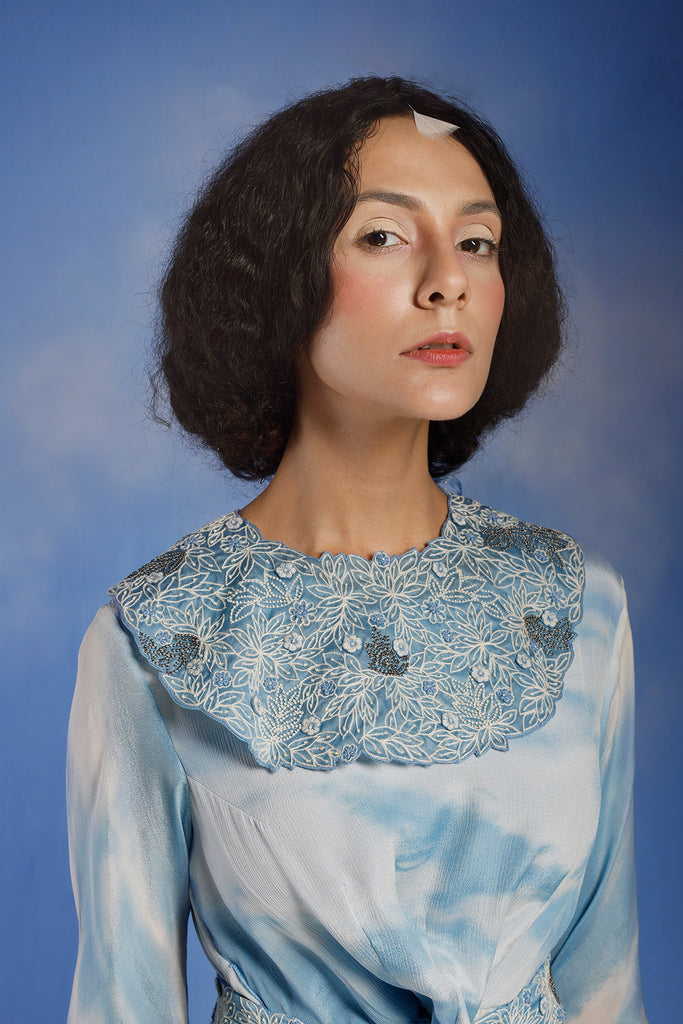 A tie dyed tiered sharara pants, paired with a gathered peplum top. Embroidered belt and necklet.