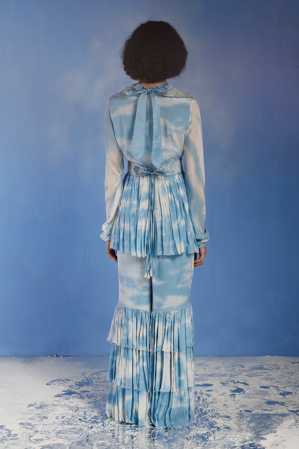 Blue Silk Chiffon Tie Dye Peplum Top Sharara Set