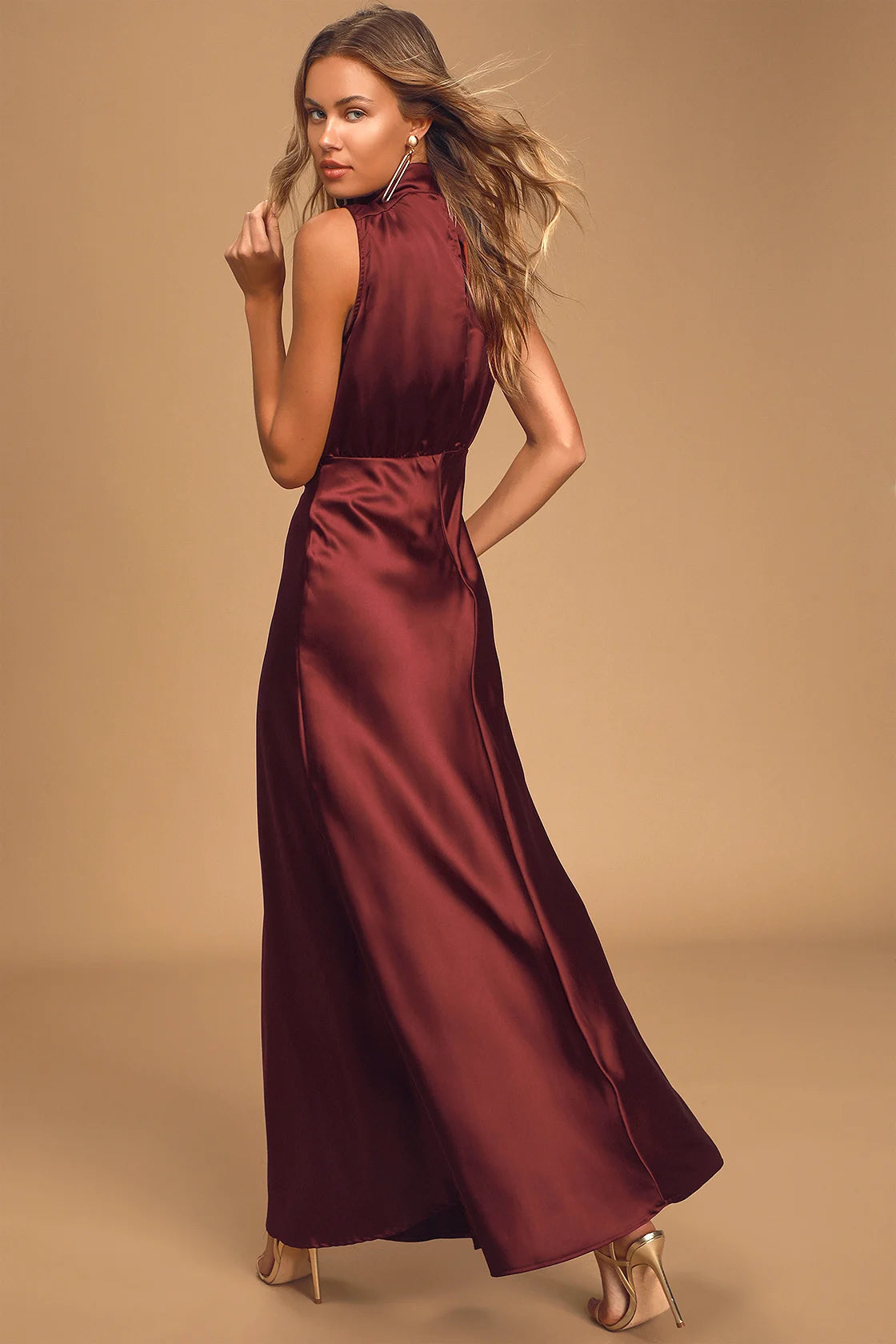 Luxe woven satin, in a peachy-toned blush shade, shapes this gorgeous dress that has a mock neckline and a sleeveless bodice with gathered fabric detailing. An elasticized waist tops a stunning maxi skirt complete with twin side slits. Keyhole opening and double button closure at back.