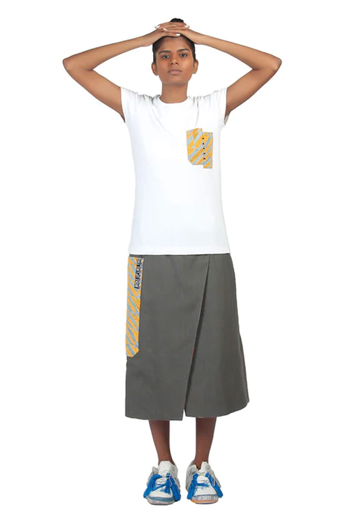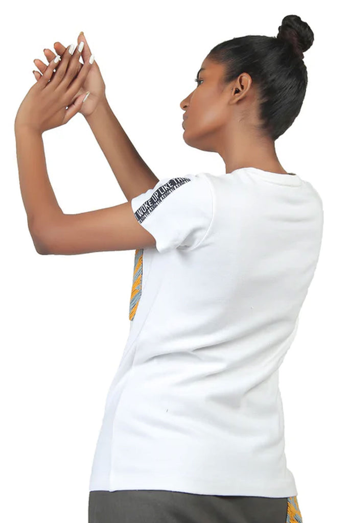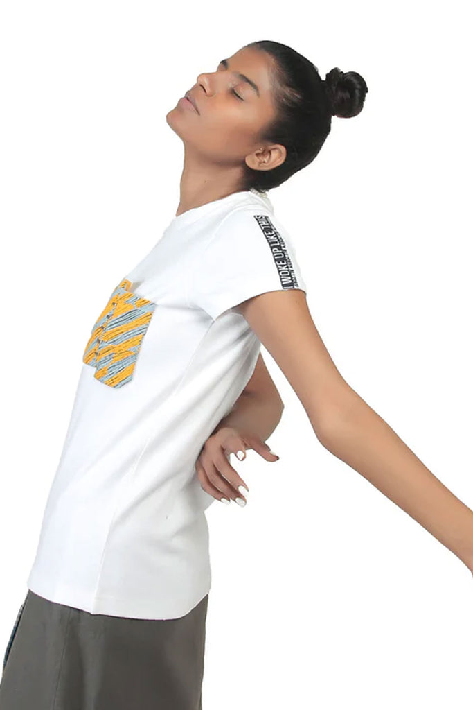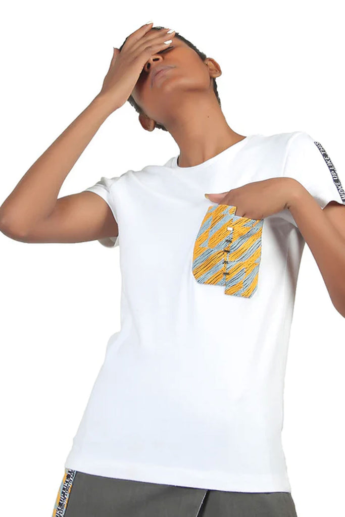 Short sleeve cotton t-shirt in white. Crewneck. Broken patch pocket at chest. Geometric embroidery in multicolour at pocket. Staple hardware at pocket. Signature ALL2DEFY trimming at sleeve. Tonal stitching.