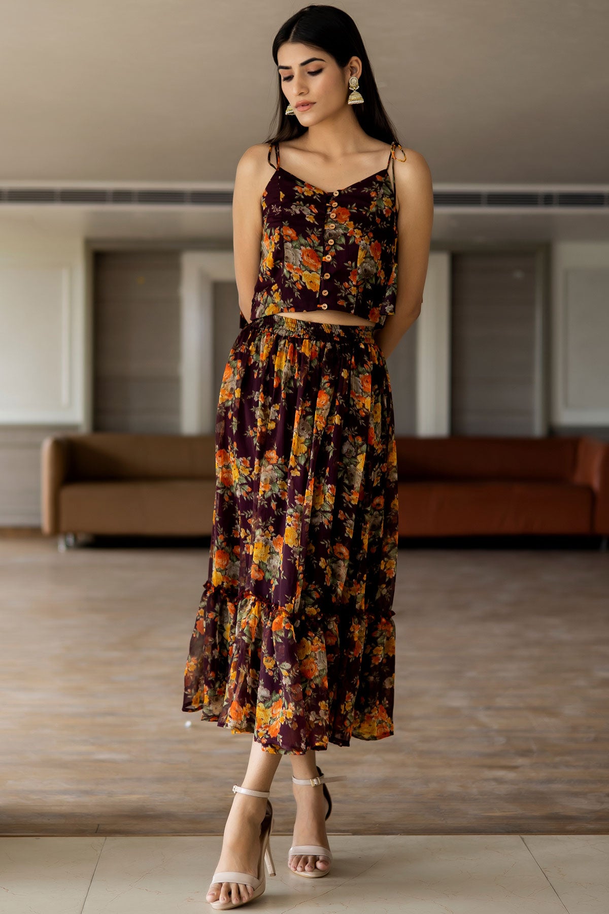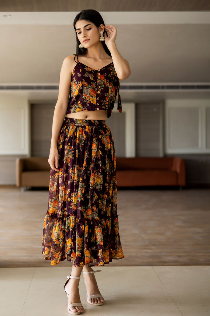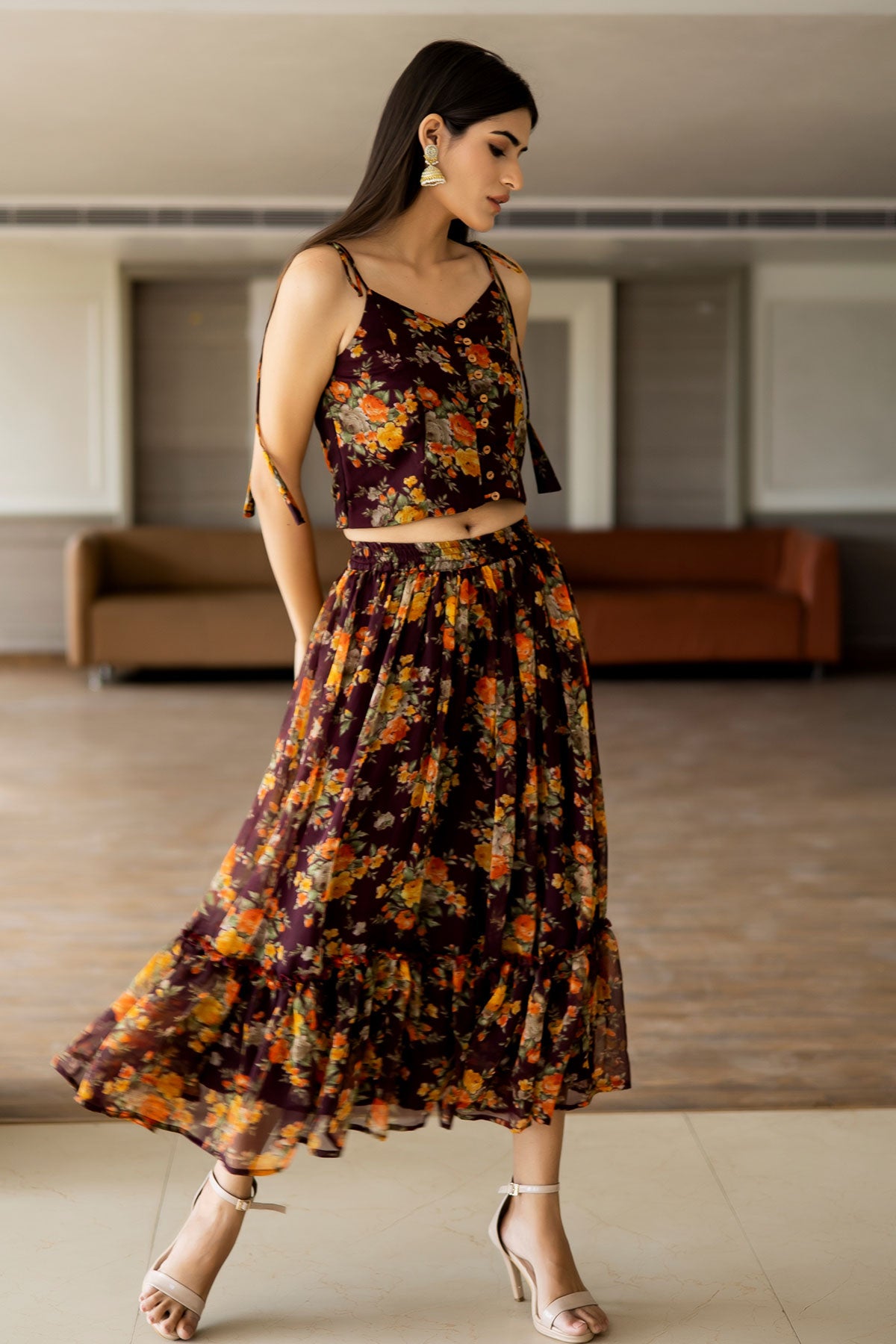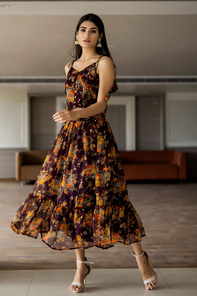 This soft, flowy, chiffon-made outfit includes a floral printed strappy top & a comfortable floral printed, pleated skirt. This girly outfit will refresh your mood & make you look very femine.