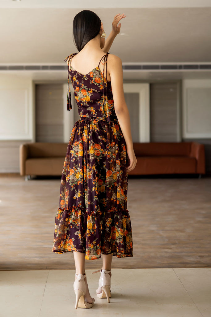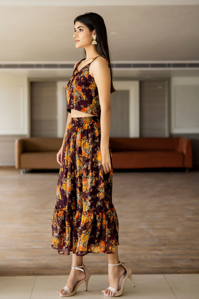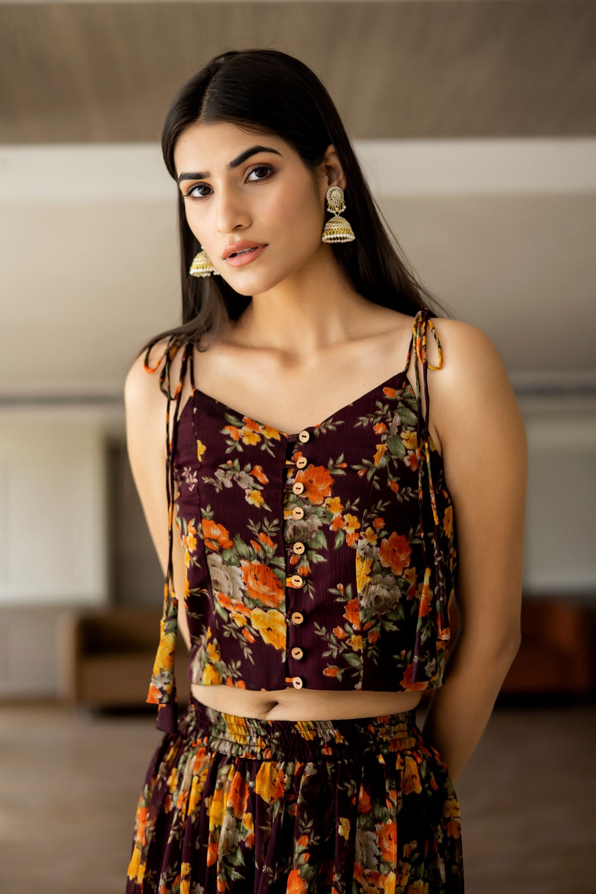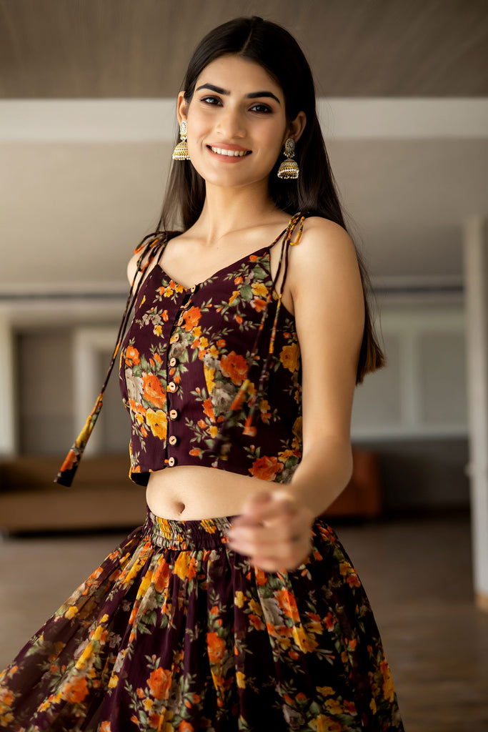 This soft, flowy, chiffon-made outfit includes a floral printed strappy top & a comfortable floral printed, pleated skirt. This girly outfit will refresh your mood & make you look very femine.