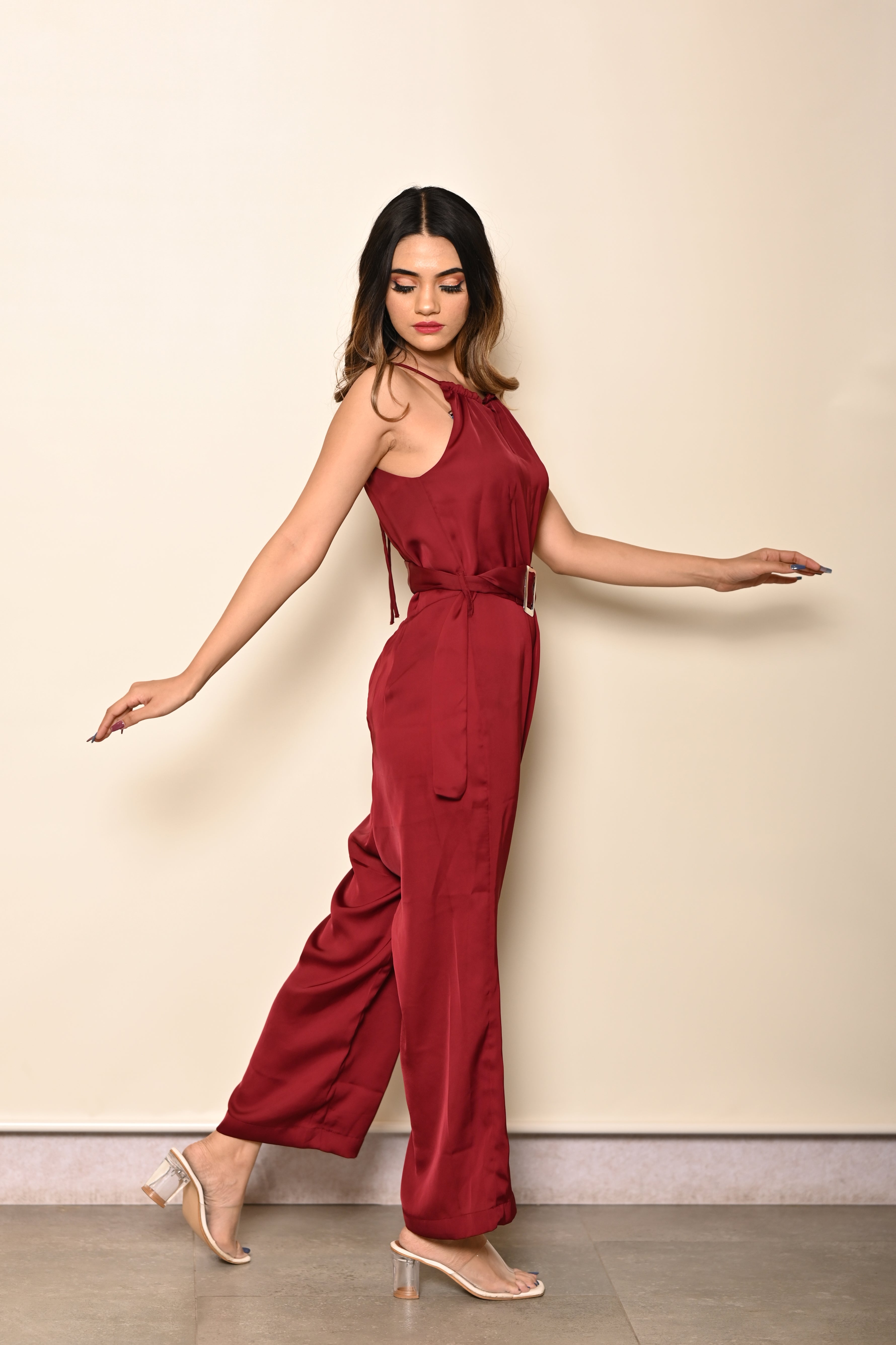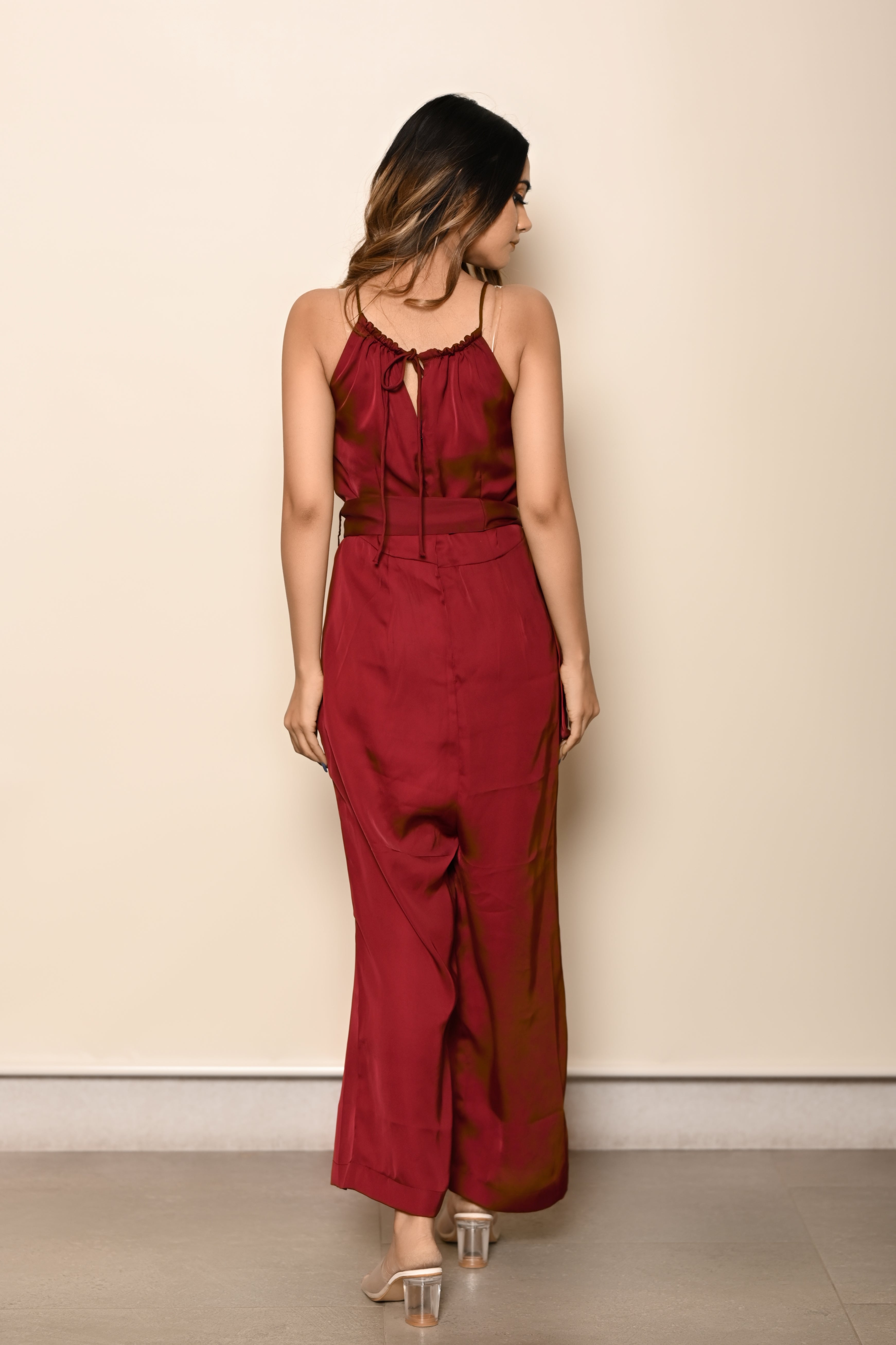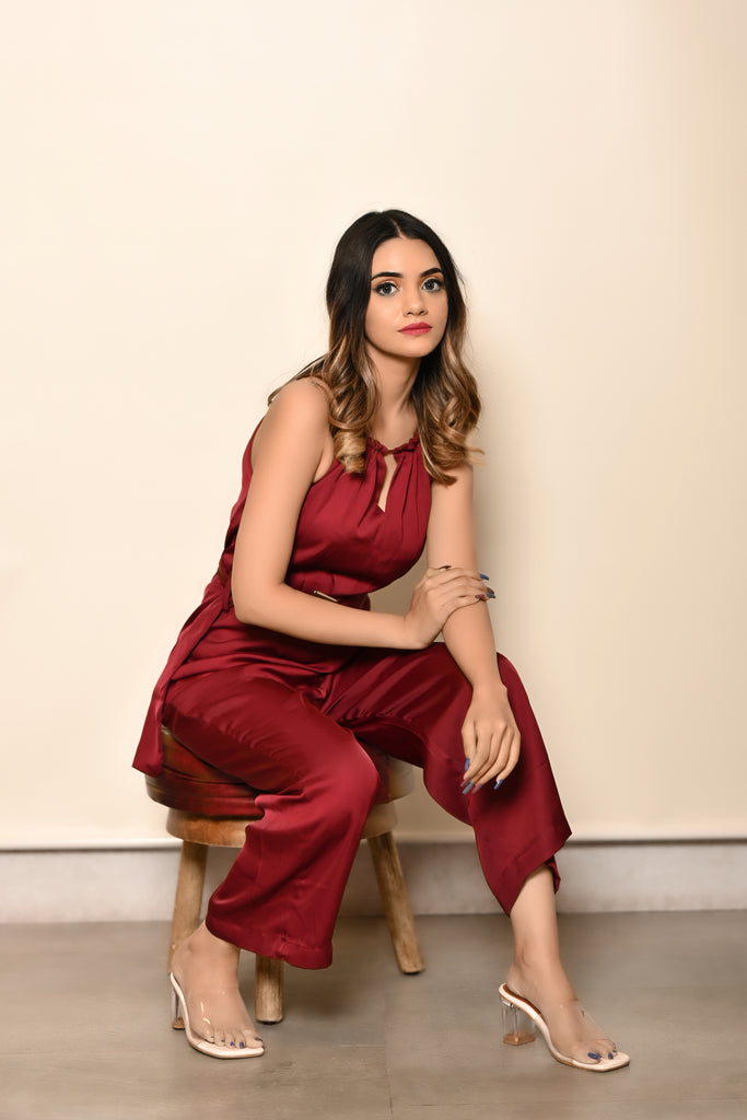 Nothing like a super easy yet stylish jumpsuit this season. Tailor made in very soft and comfy satin fabric. Introducing this gorgeous jumpsuit in burgundy that has a halter neck with self-tie string, & tie up belt. Shop now online from MANNMANI