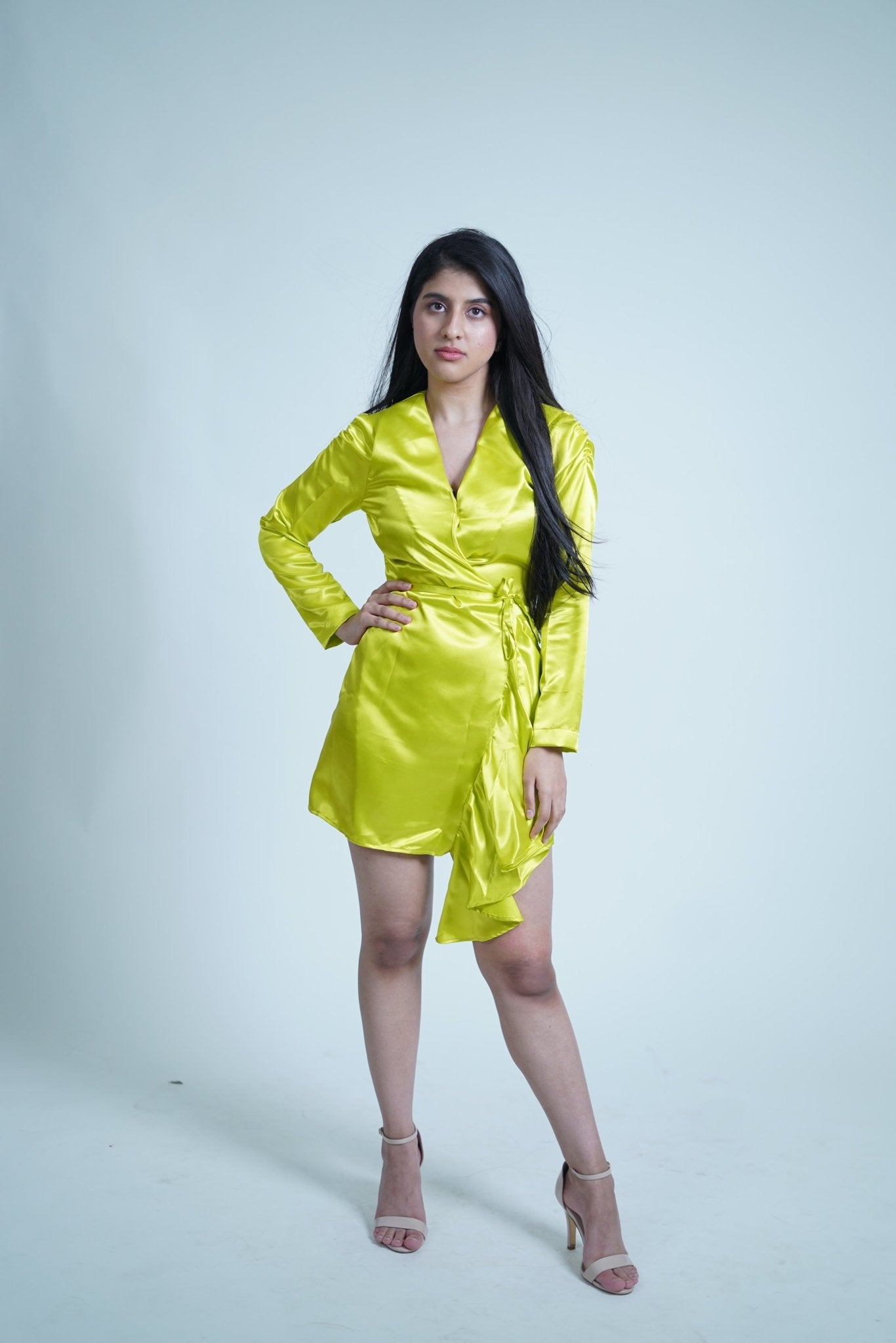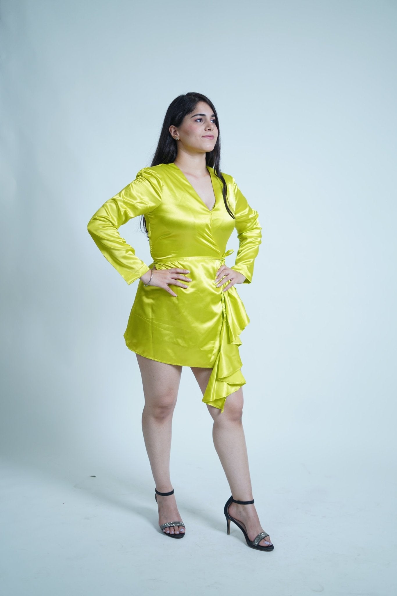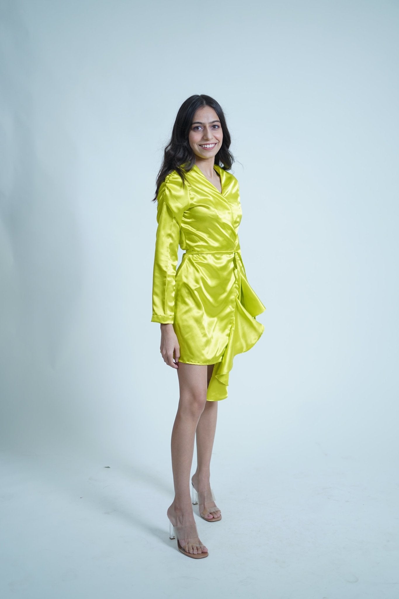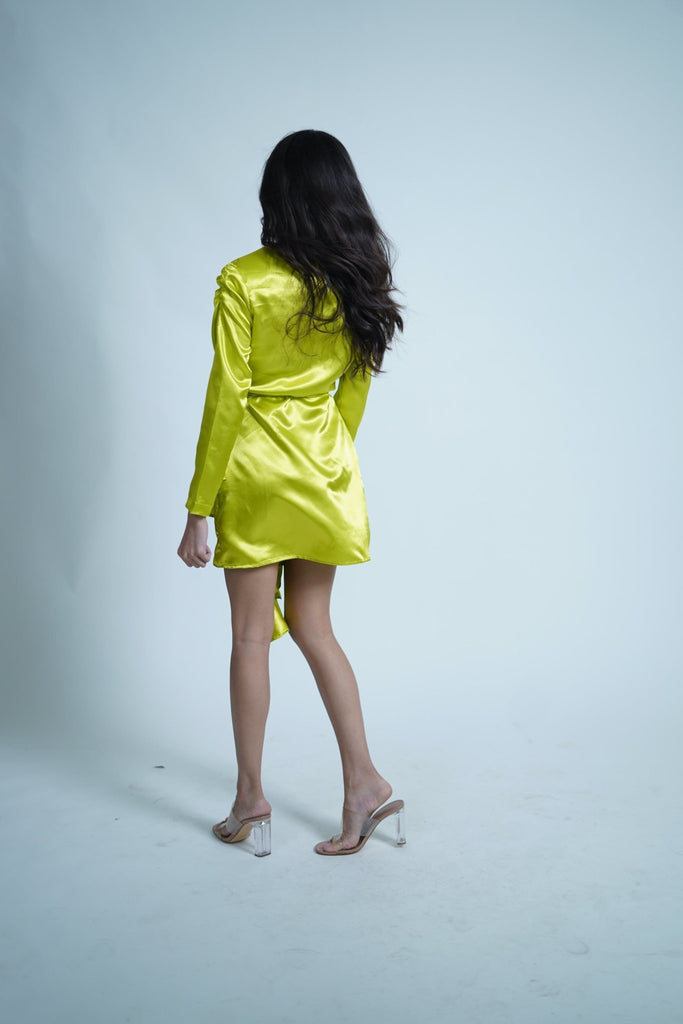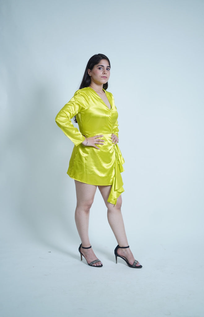 Chartreuse Parrot Green Satin Wrap Up Dress