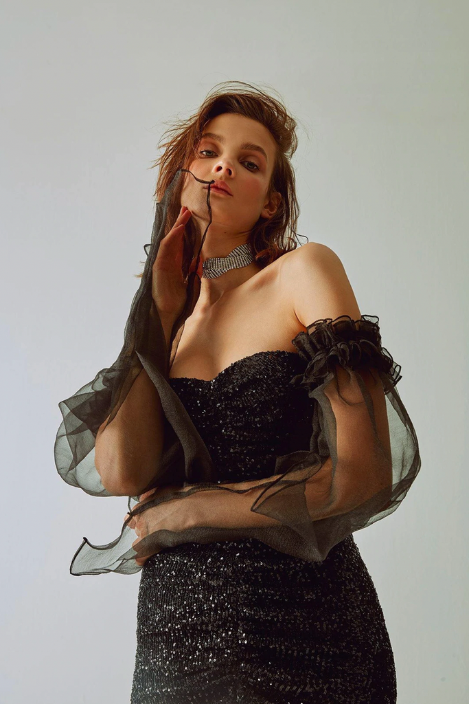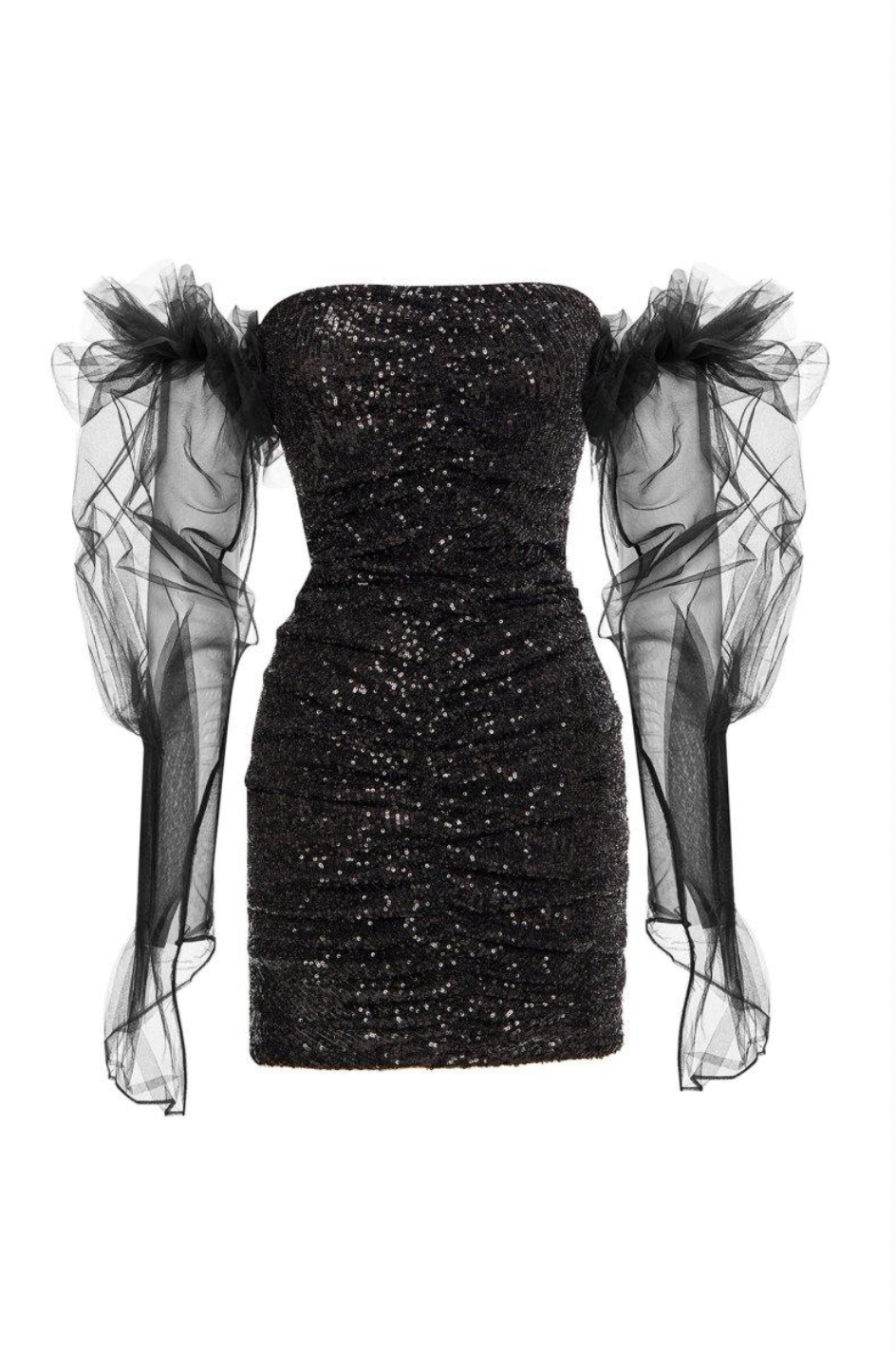 Strapless ruched dress with detachable tulle sleeves in Sequin fabric.