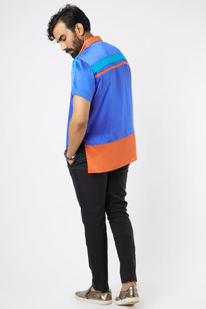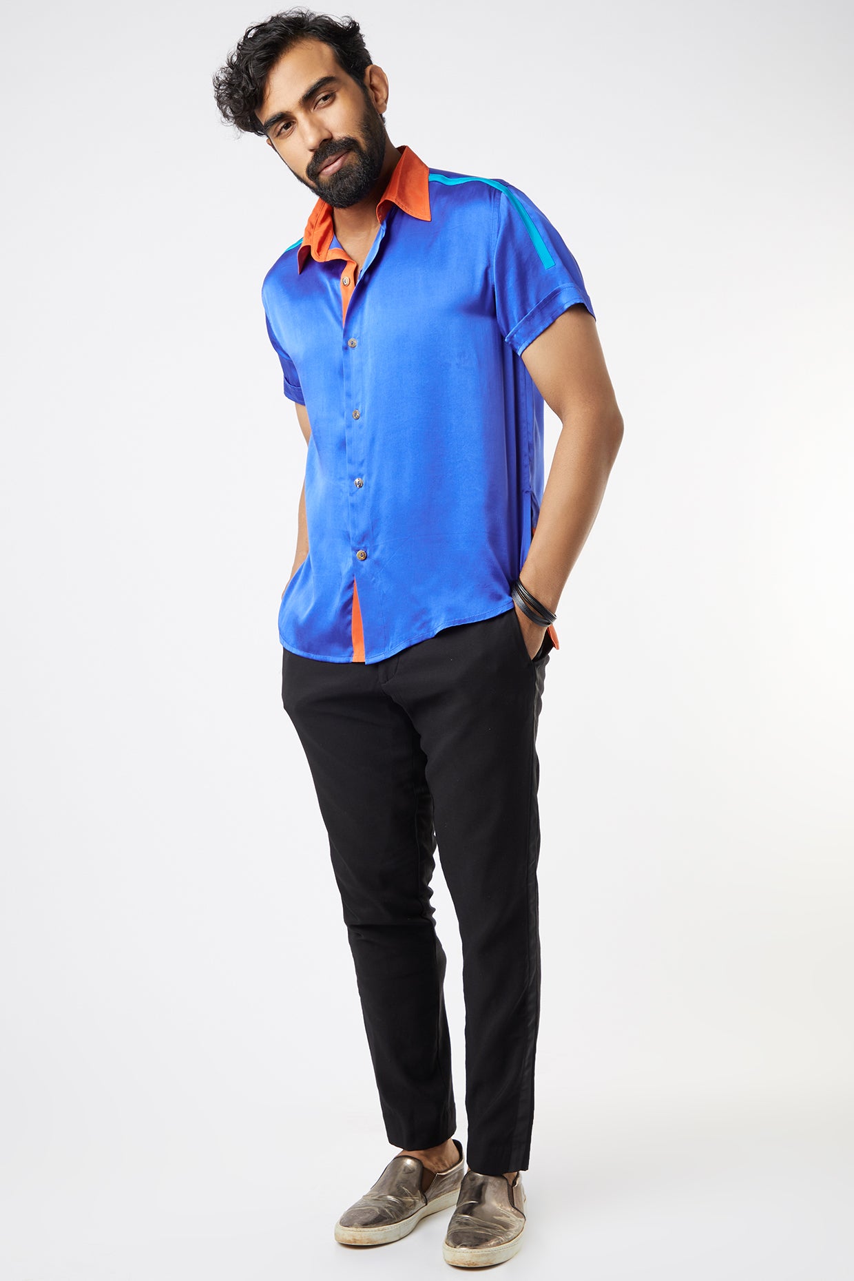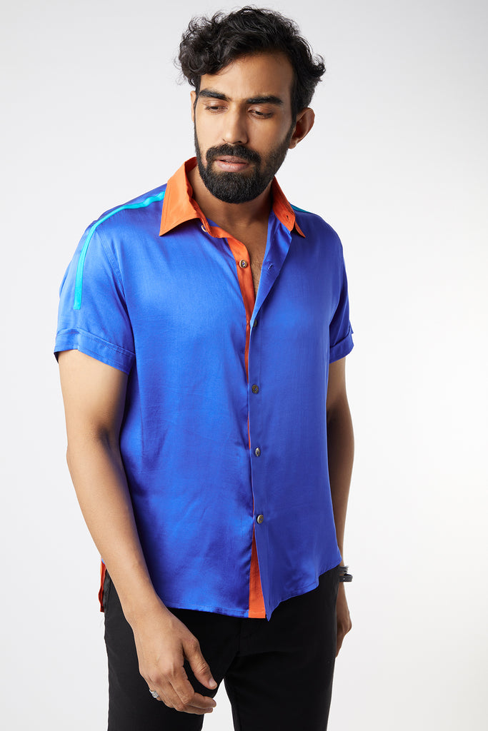 Featuring A Cobalt Blue Shirt In Satin Silk And Crepe Silk Base With Contrast Collar And Back Hem . This Contains Only One Piece.
