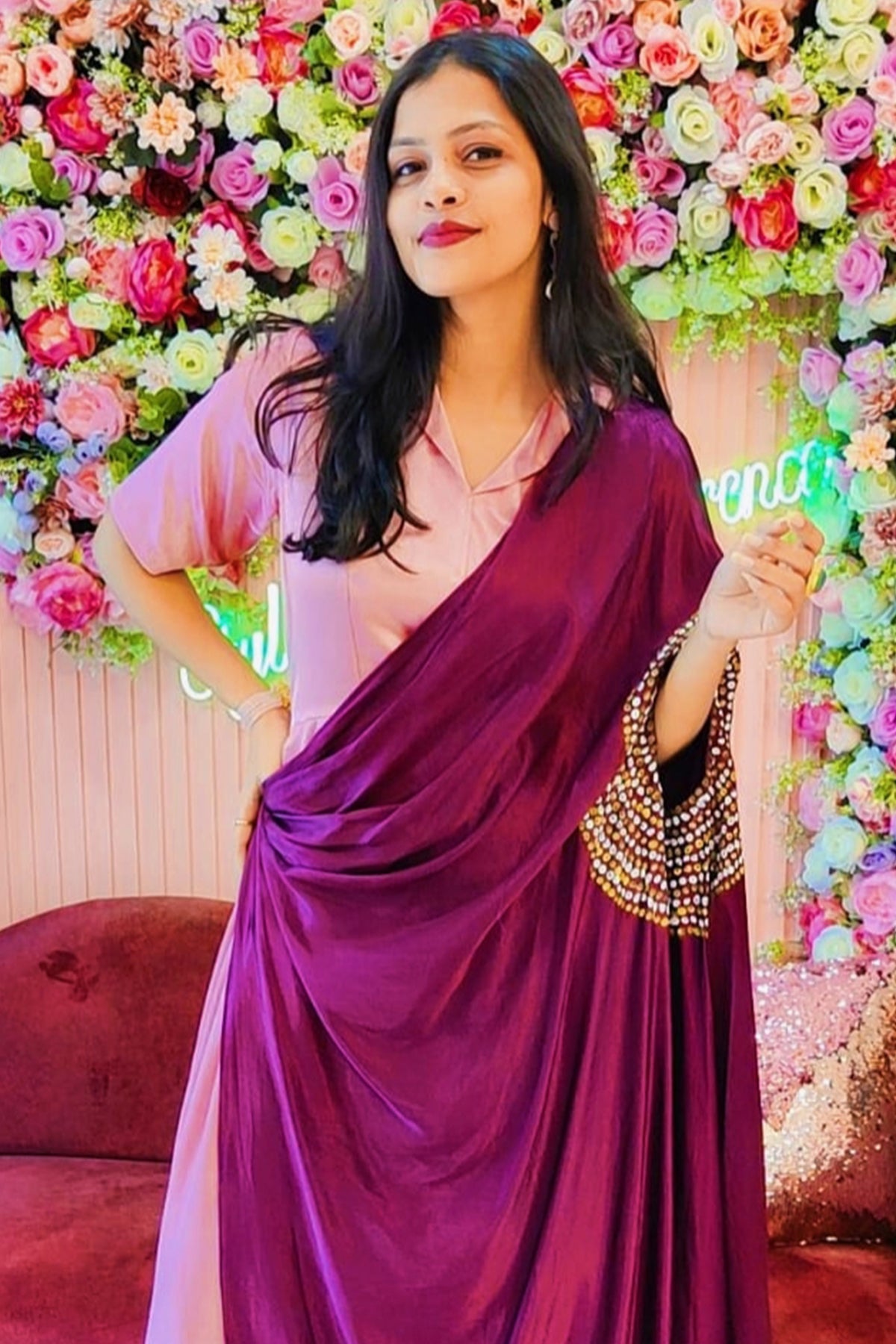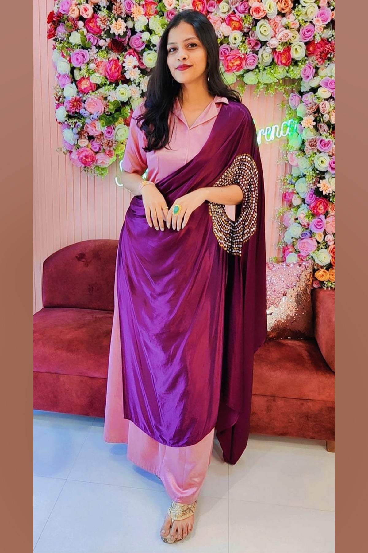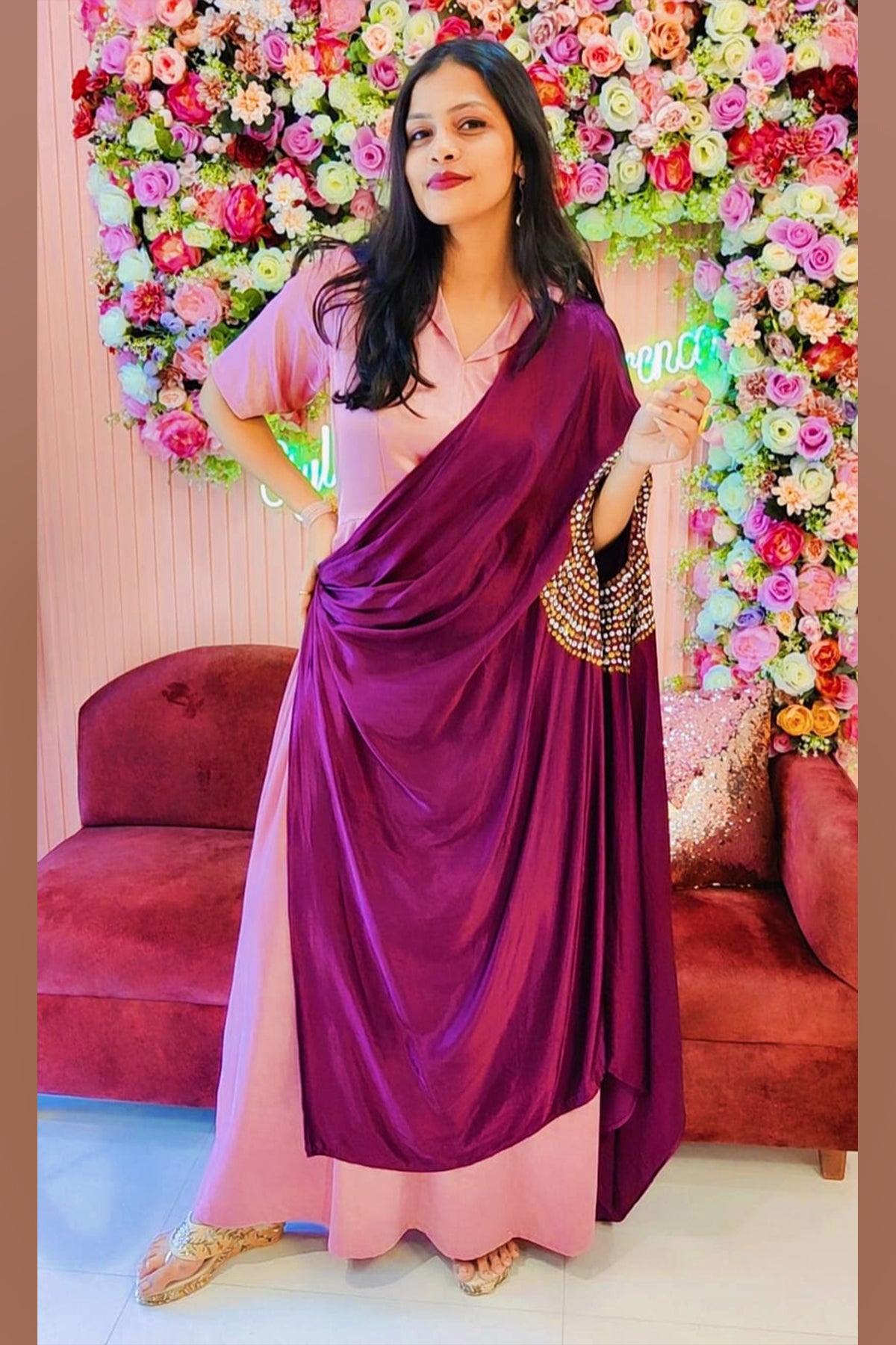 Onion pink and wine gajji silk hand painted dress. Crafted in two shades this gajji silk collar yoke and box pleated dress with attached drape hand painted bandhani effect is perfect choice for your dinner party.