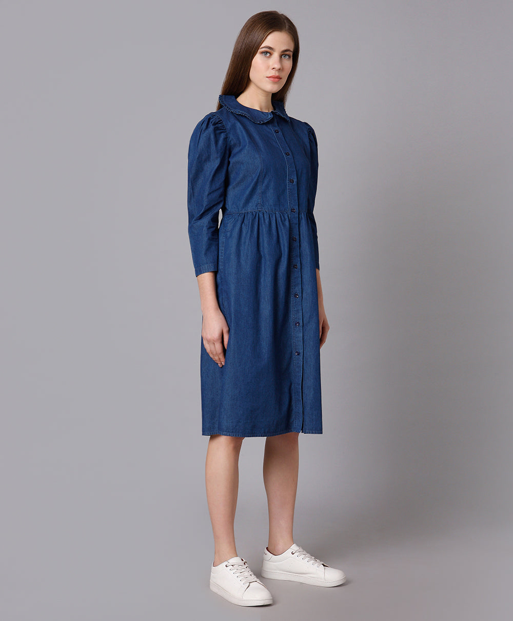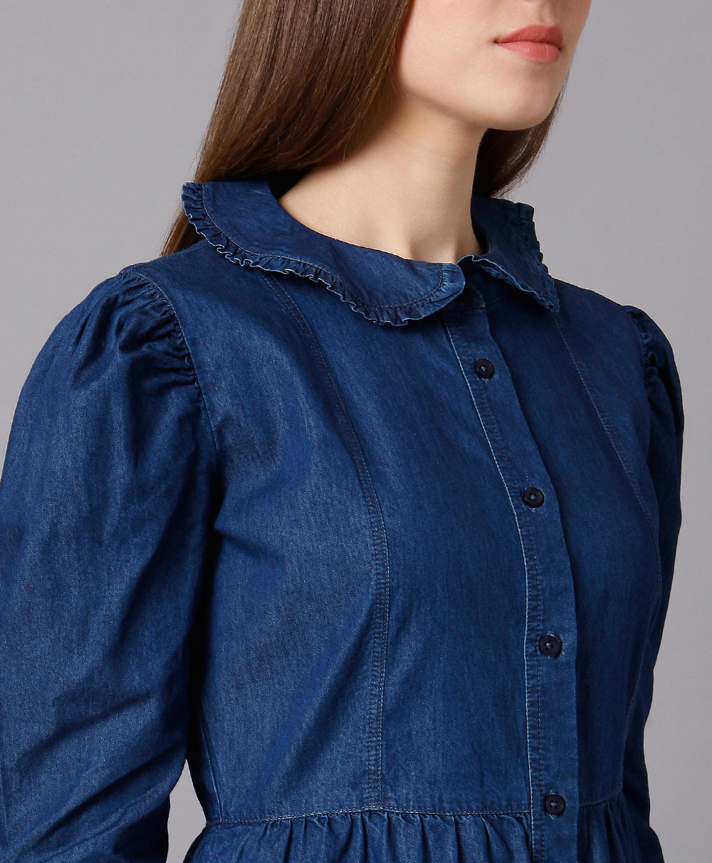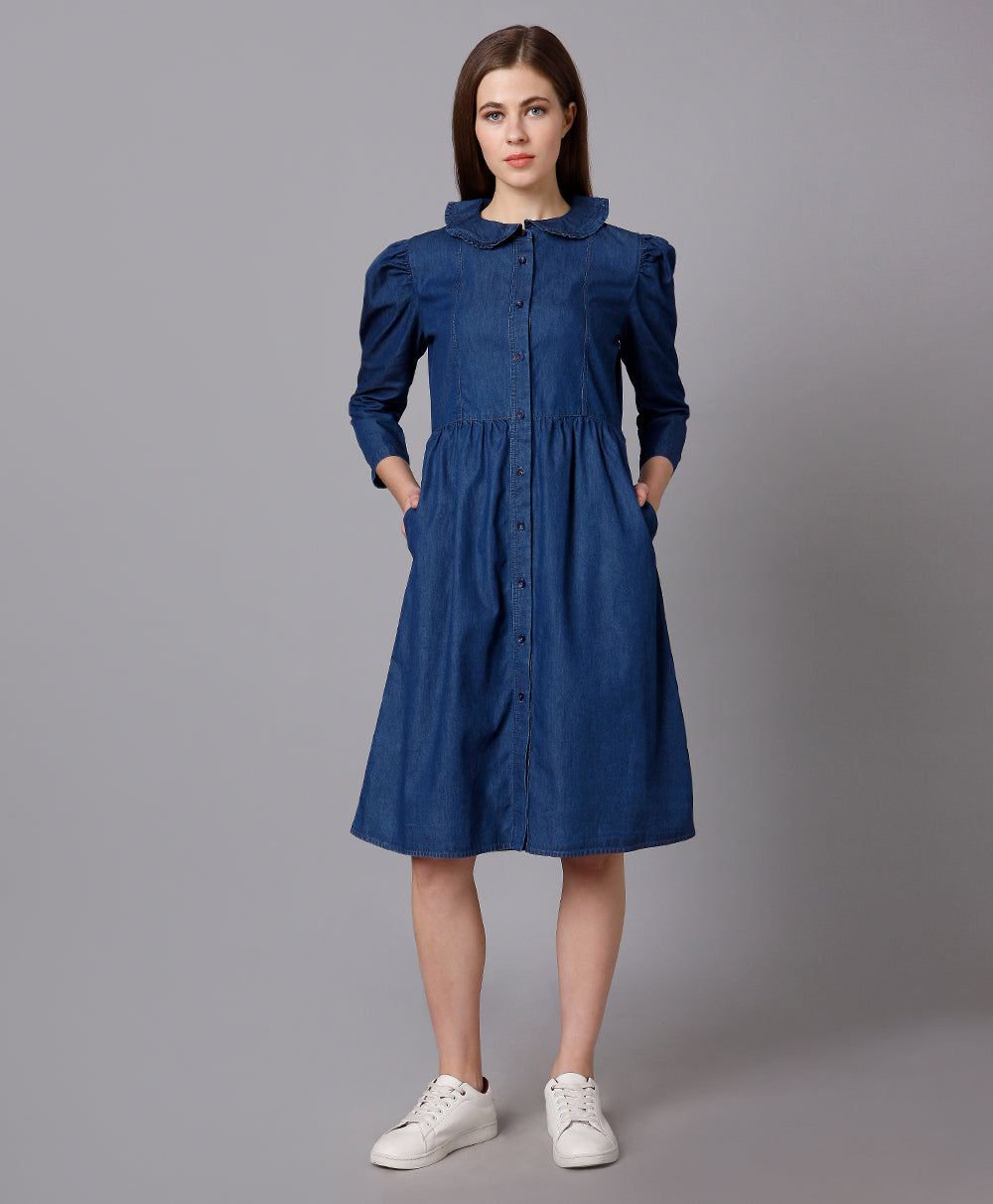 Cotton Denim Dress with Puff Sleeves