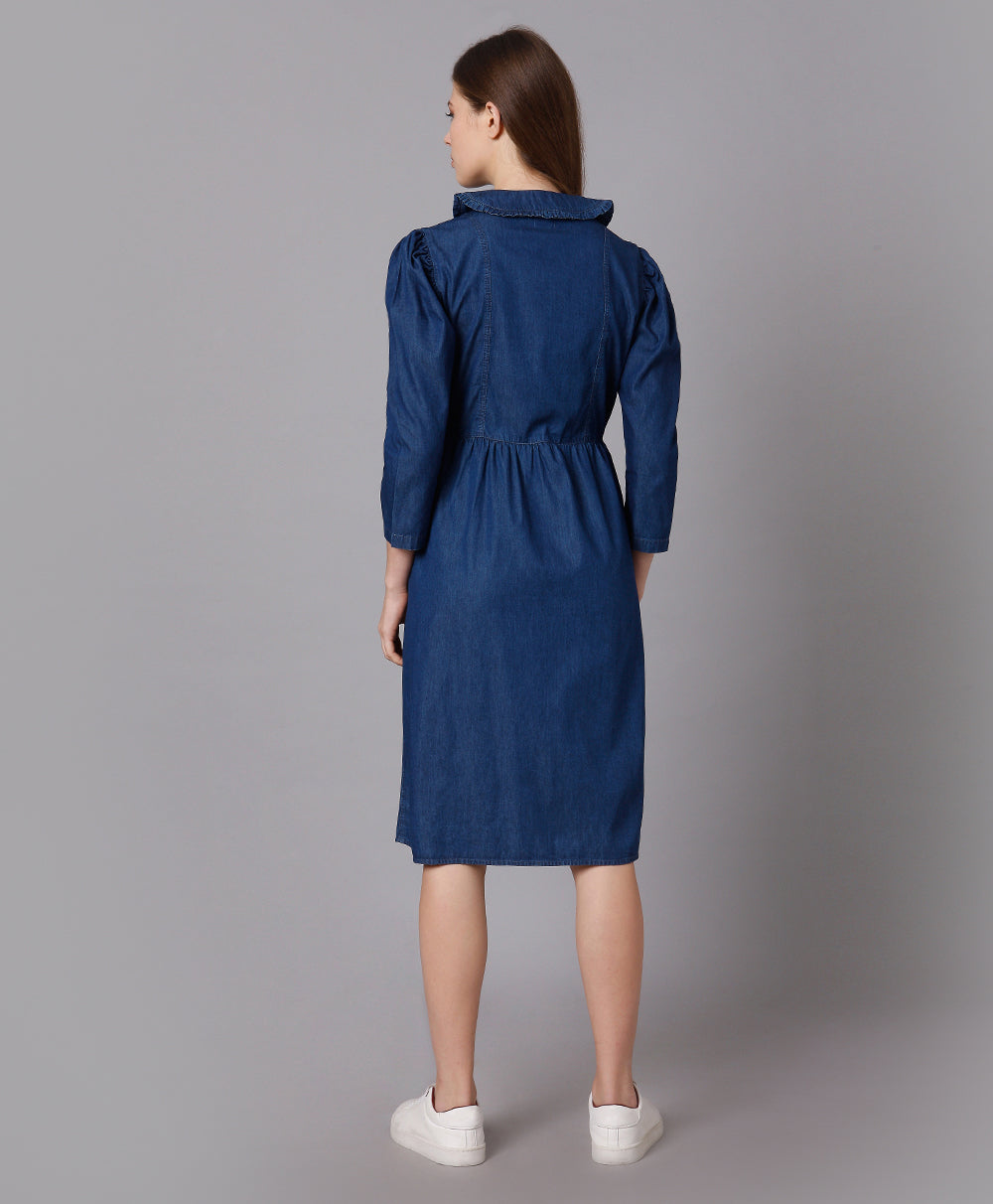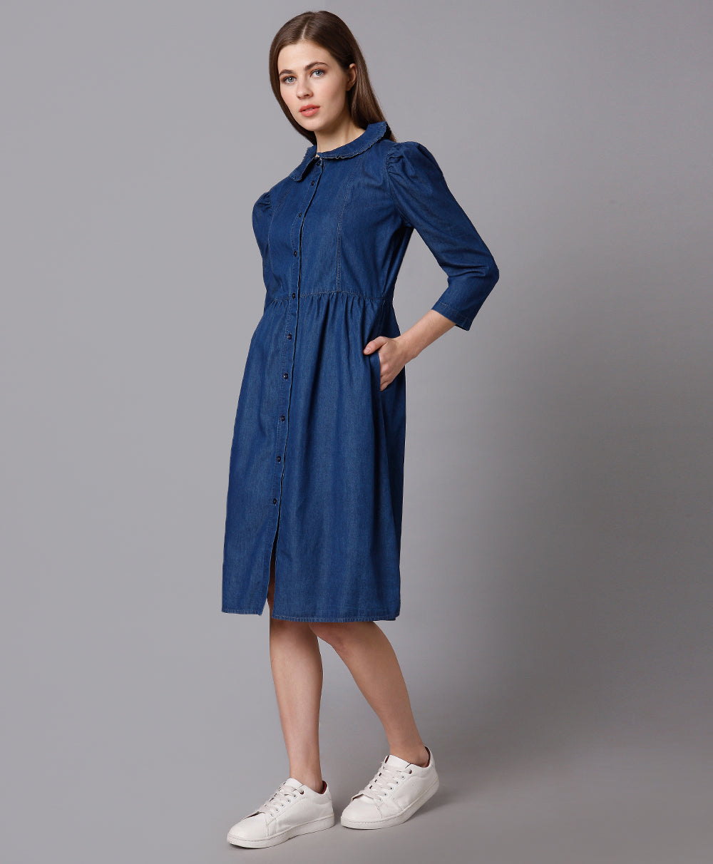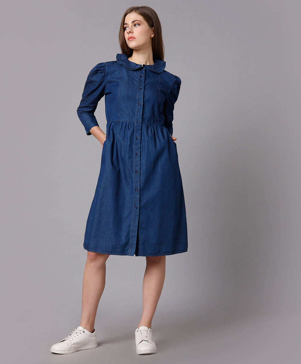 Cotton Denim Dress with Puff Sleeves