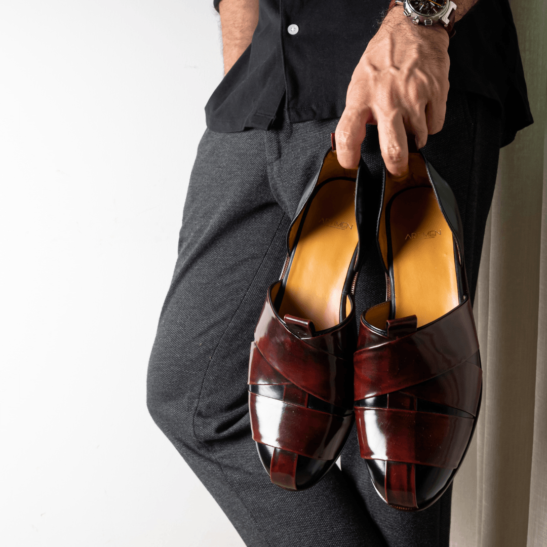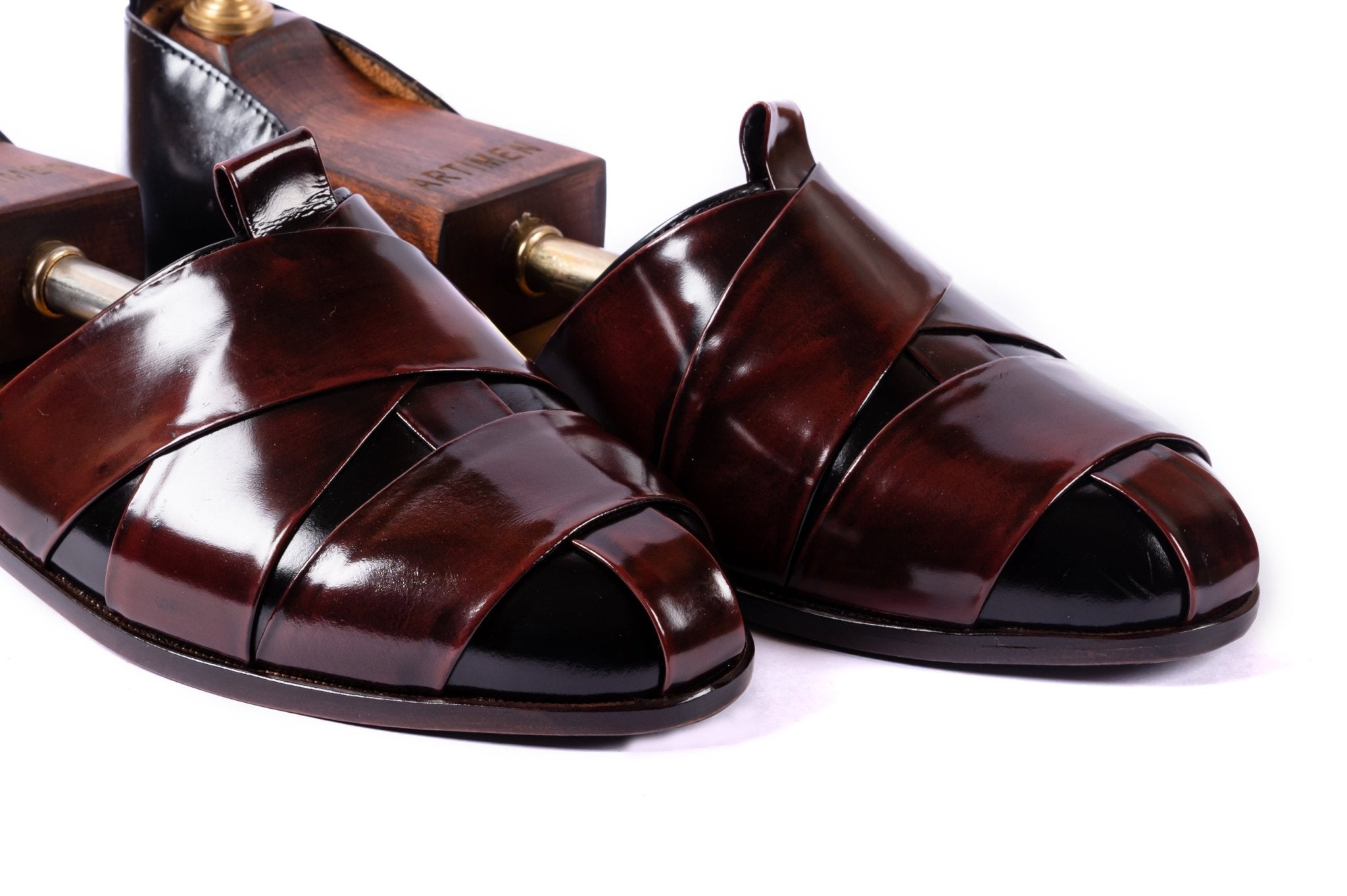 One of our trend setters in sandal collection. These cross strapped sandals are new to the line of traditional wear but seem to have taken over. Burnt deep brown shade is a perfect replacement for a black pair. This could be worn with traditional or even with smart casuals.