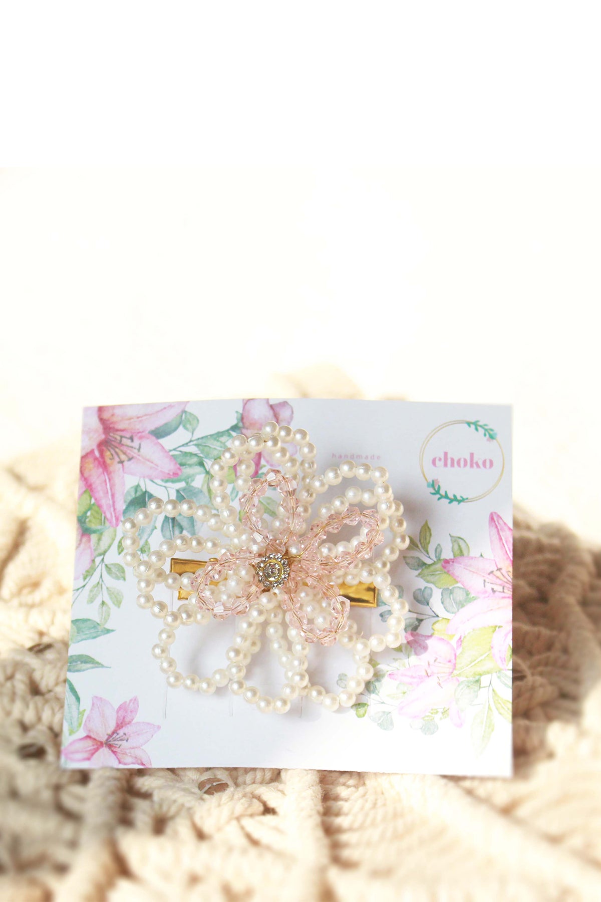 Crystal & Pearls Embellished Flower On Alligator Hair Clip - Off White & Pink