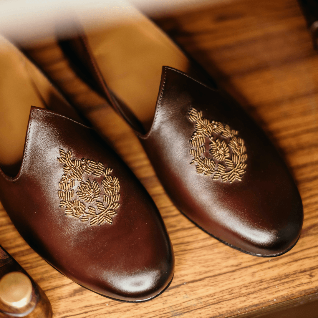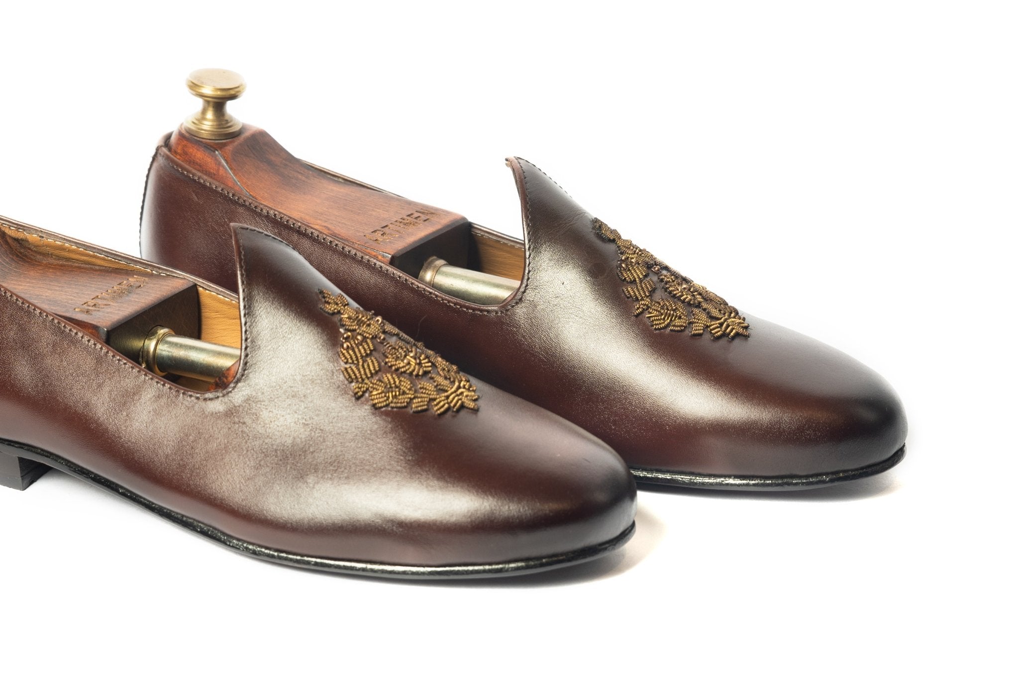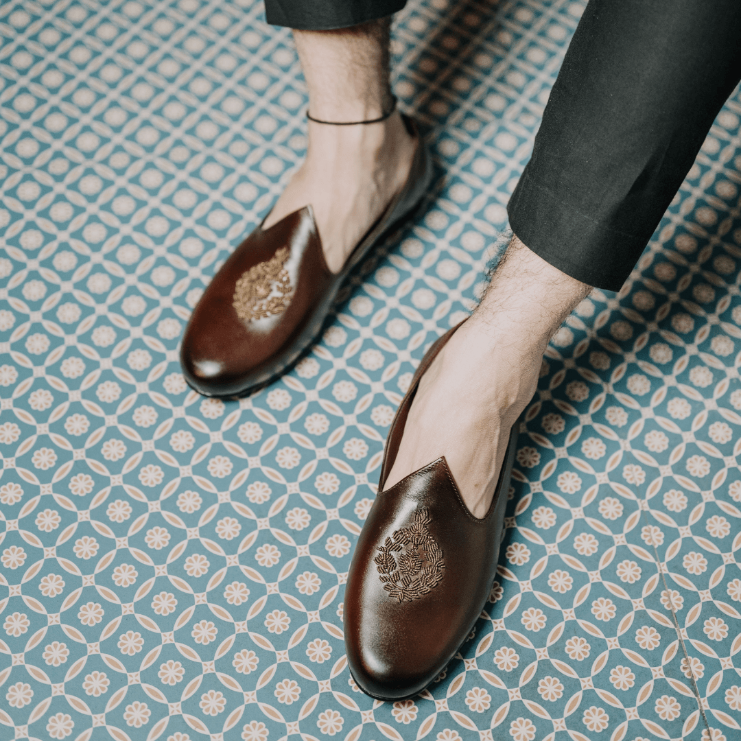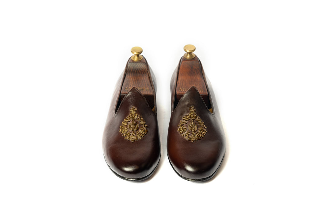 One of the hottest selling, most loved and appreciated pair. This Jutti shoe with a Hand Embroidered Dabka motif has been a hit for all our clients across the world. Comfort and class at its best. Hand sprayed burnt brown is the new color in this jutti collection. Little away from the old school, this jutti shoe gives you the look and comfort of a loafer.Β