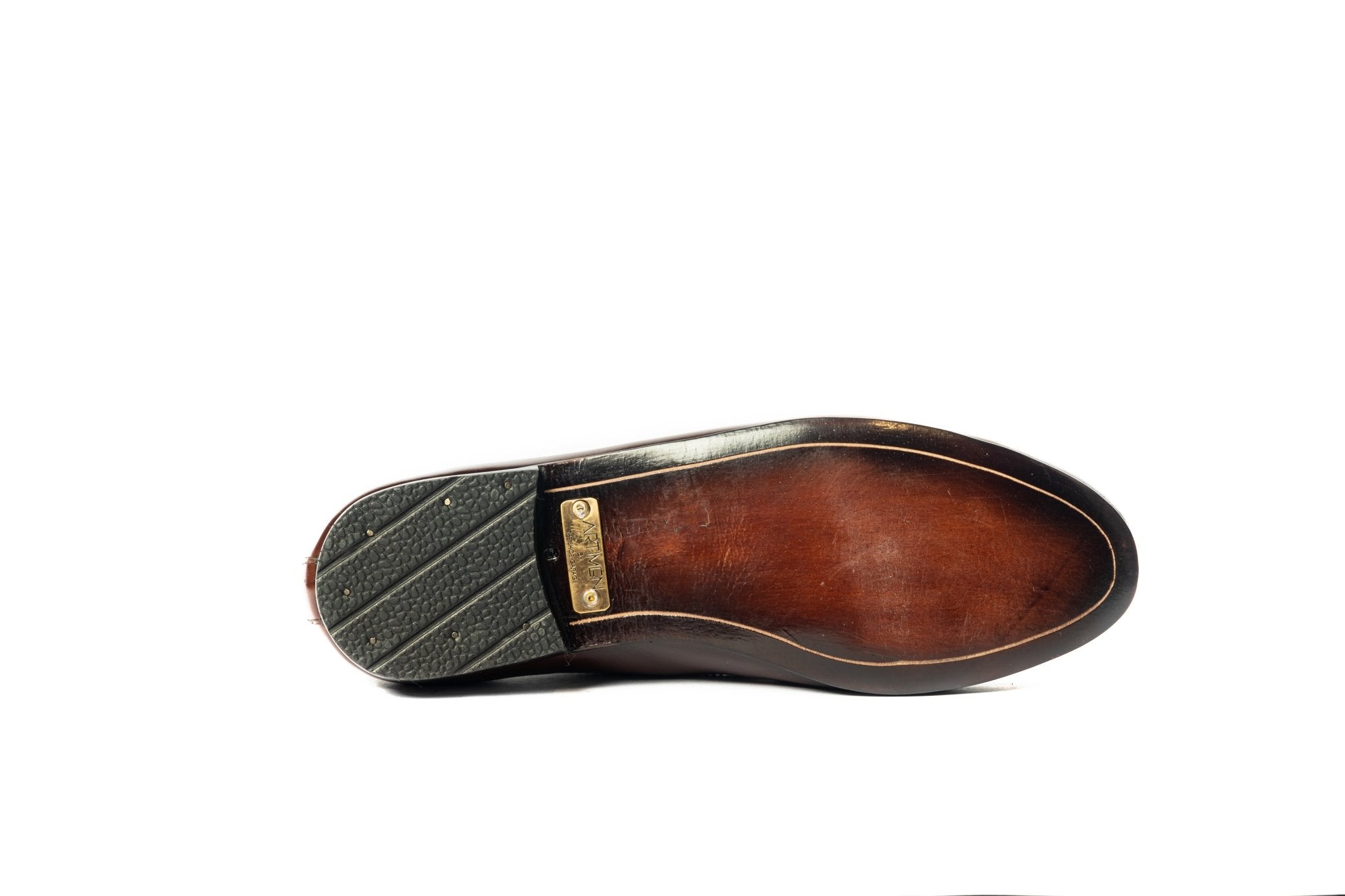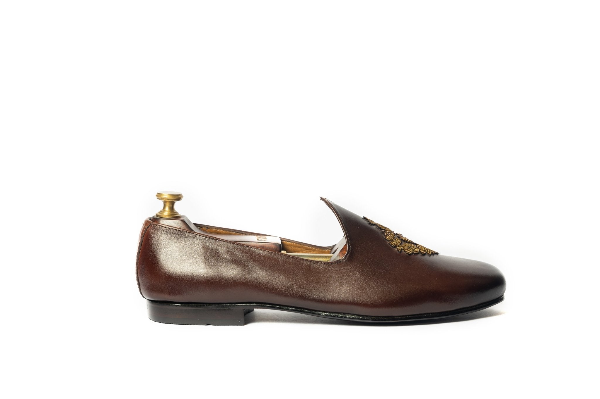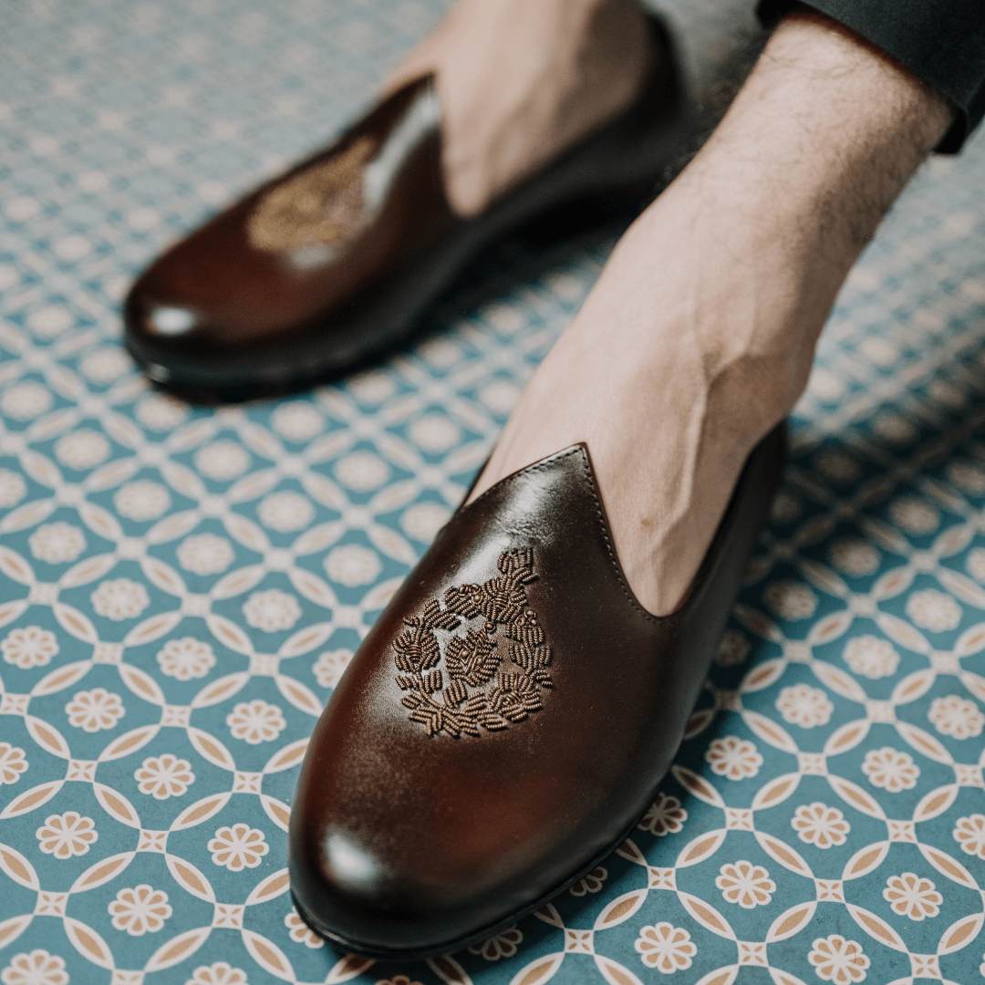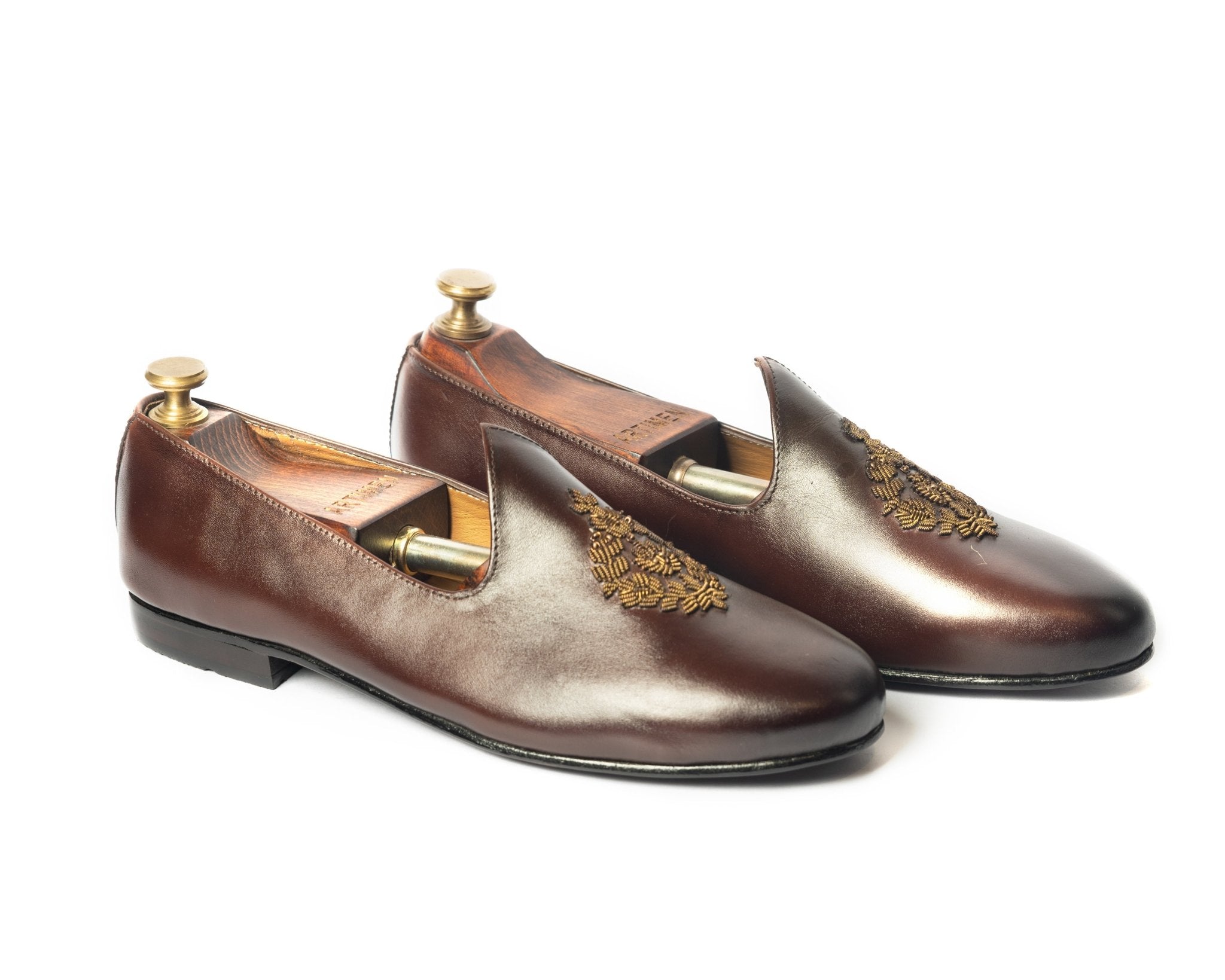 One of the hottest selling, most loved and appreciated pair. This Jutti shoe with a Hand Embroidered Dabka motif has been a hit for all our clients across the world. Comfort and class at its best. Hand sprayed burnt brown is the new color in this jutti collection. Little away from the old school, this jutti shoe gives you the look and comfort of a loafer.Β