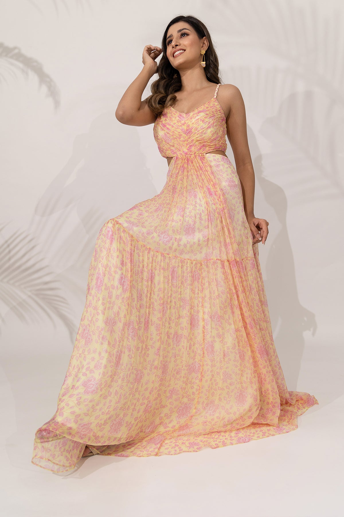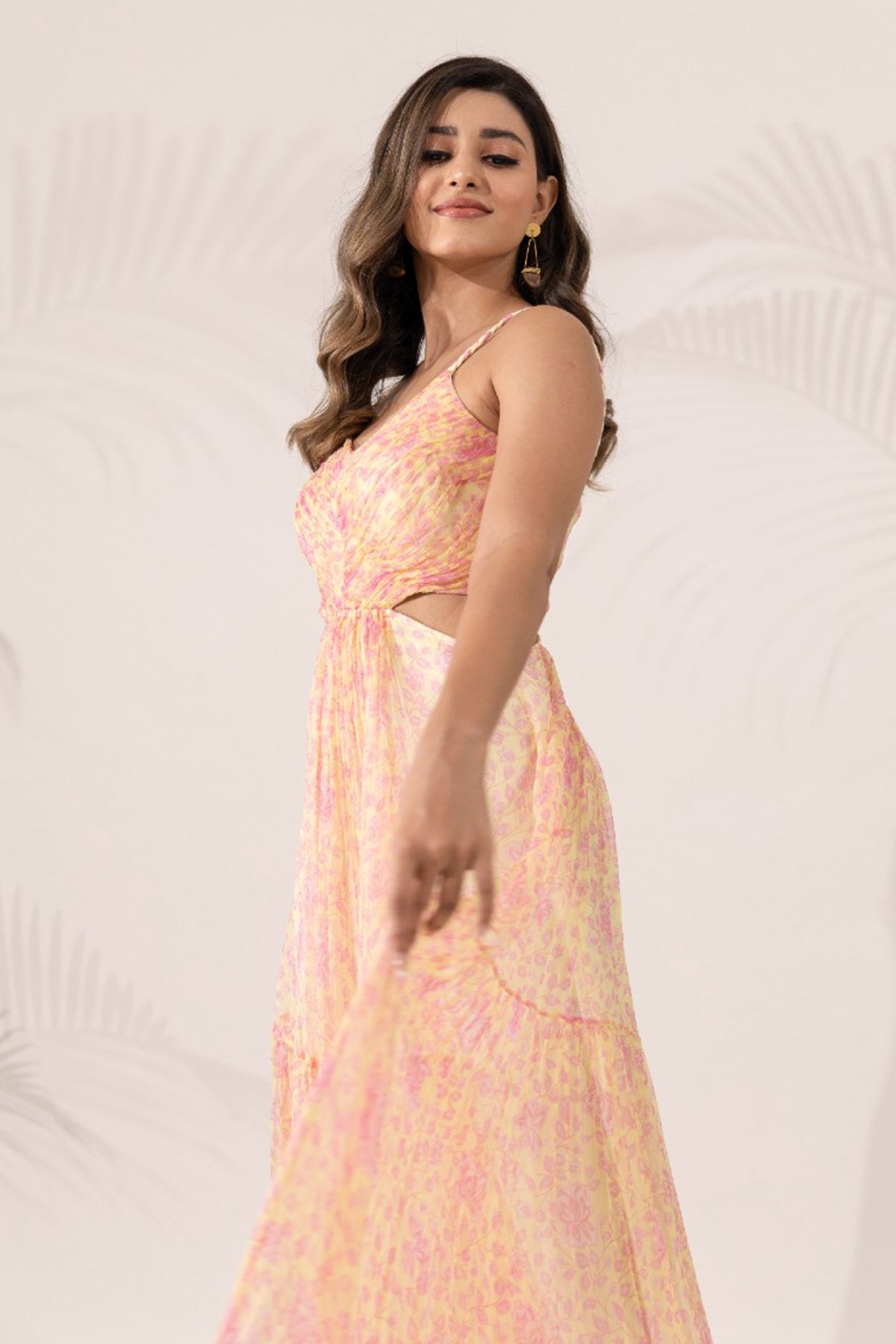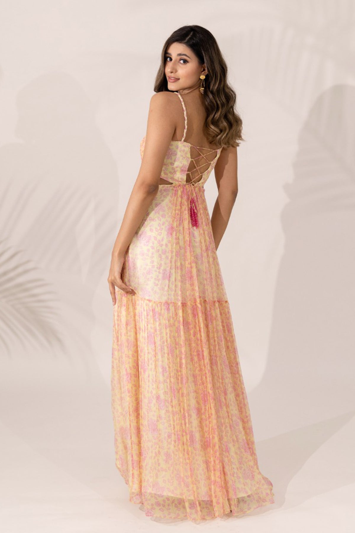 A floral hand-braided strappy maxi dress in our daffodil print is the quintessential fun and flirty piece in your vacay wardrobe. The two tiers give you the flare to light up the dance floor, while the fitted yoke with hand-pleated gathers and open-back tie-up with signature glass-stone tassels add the glitz to your glam. All this, in a breezy, lightweight viscose chiffon fabric that keeps you, and the environment, smiling.