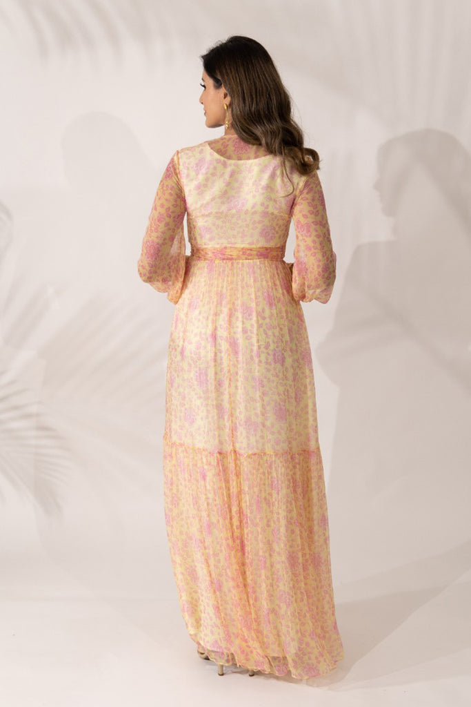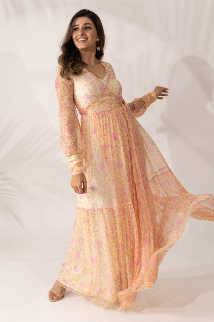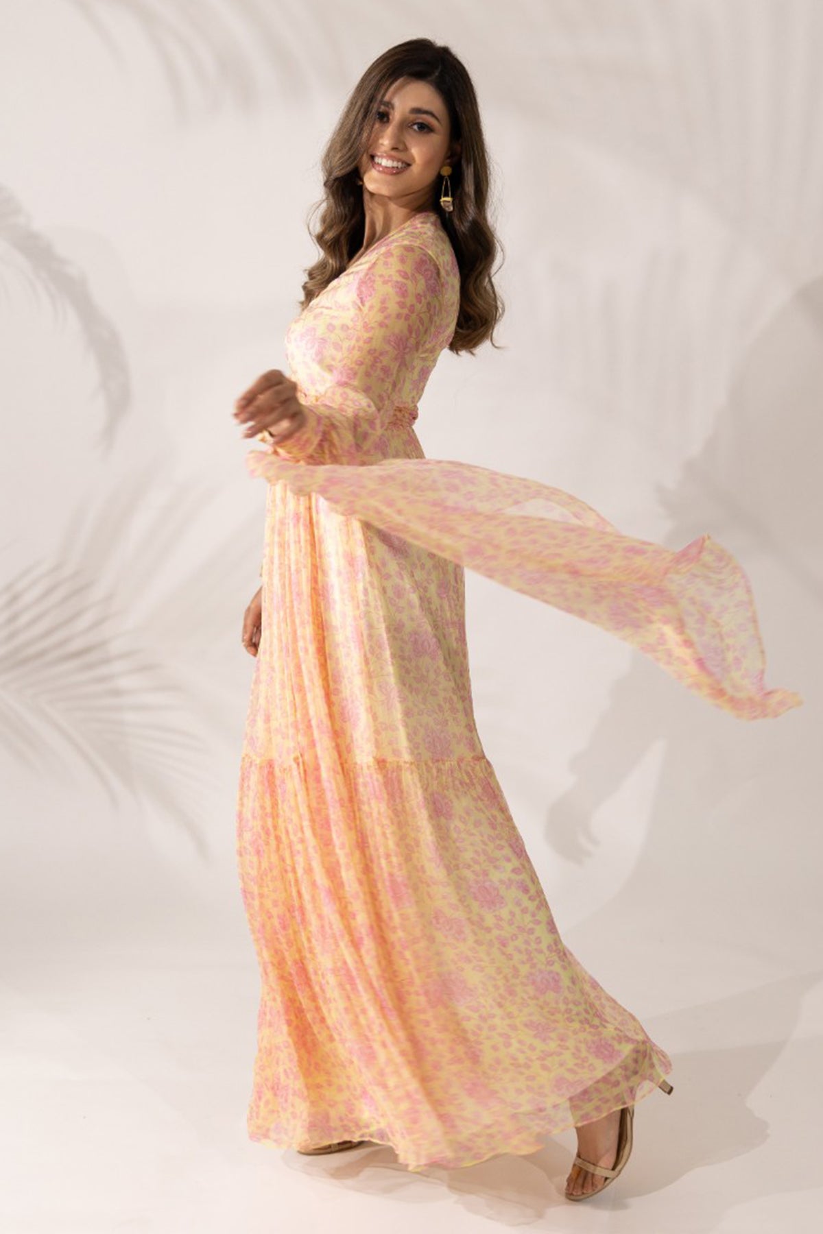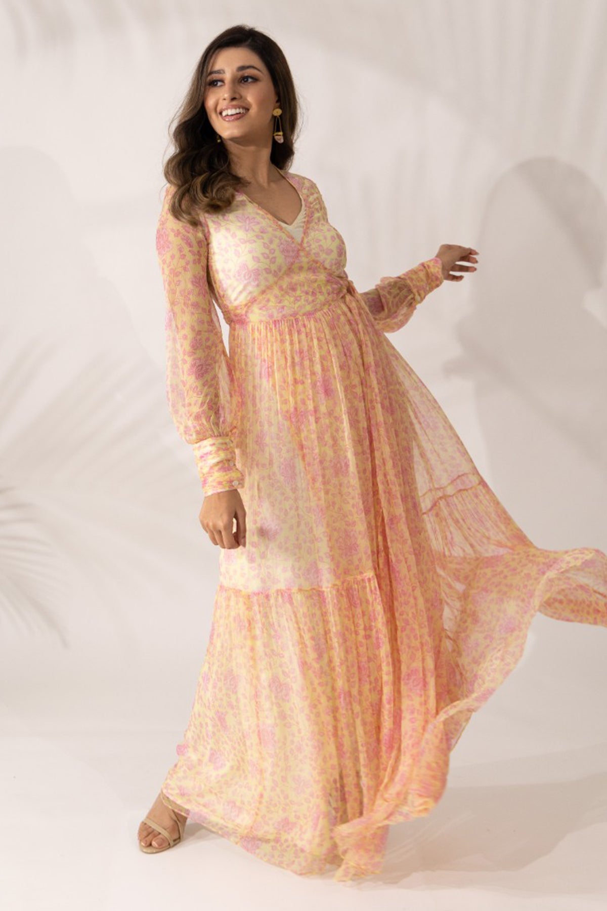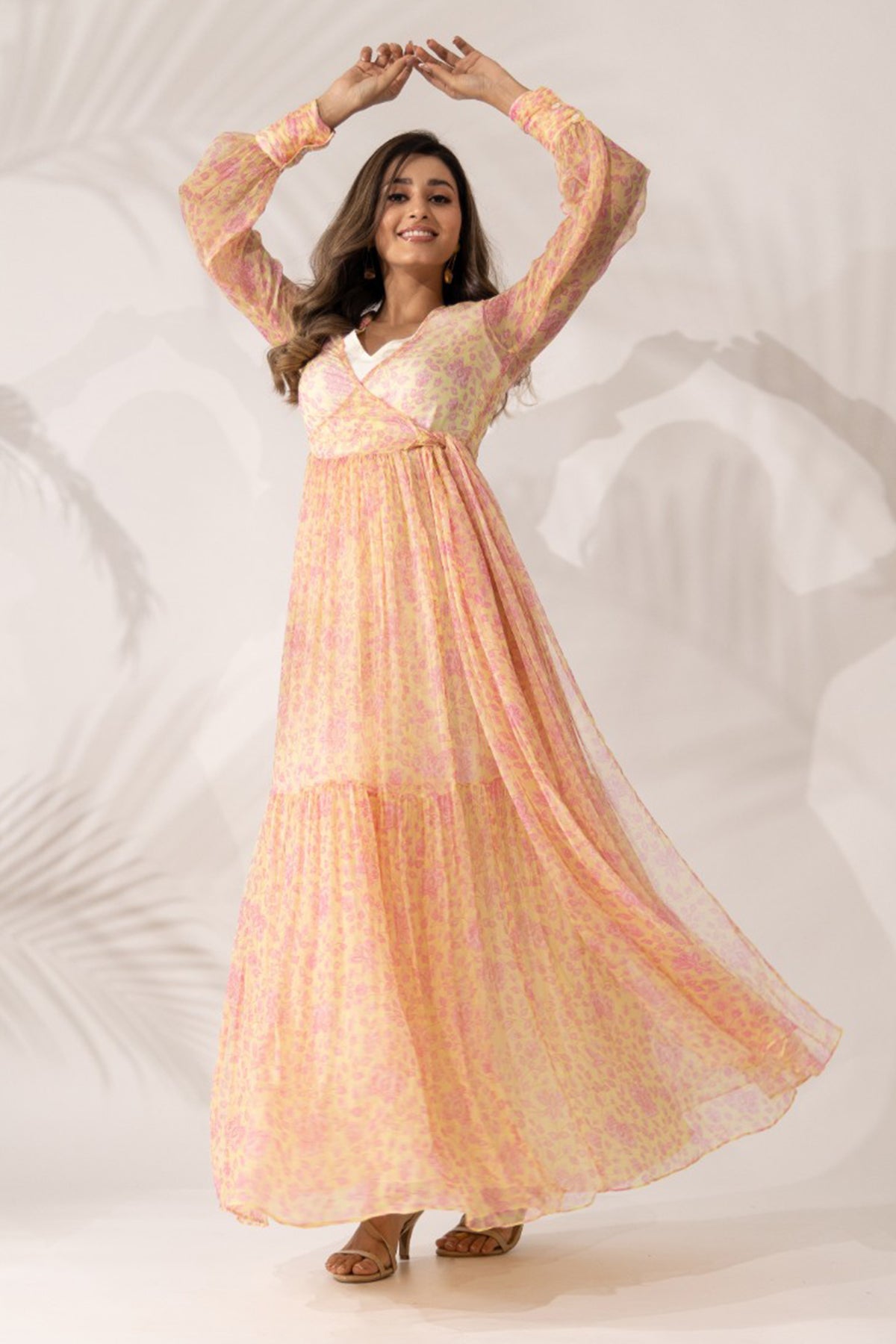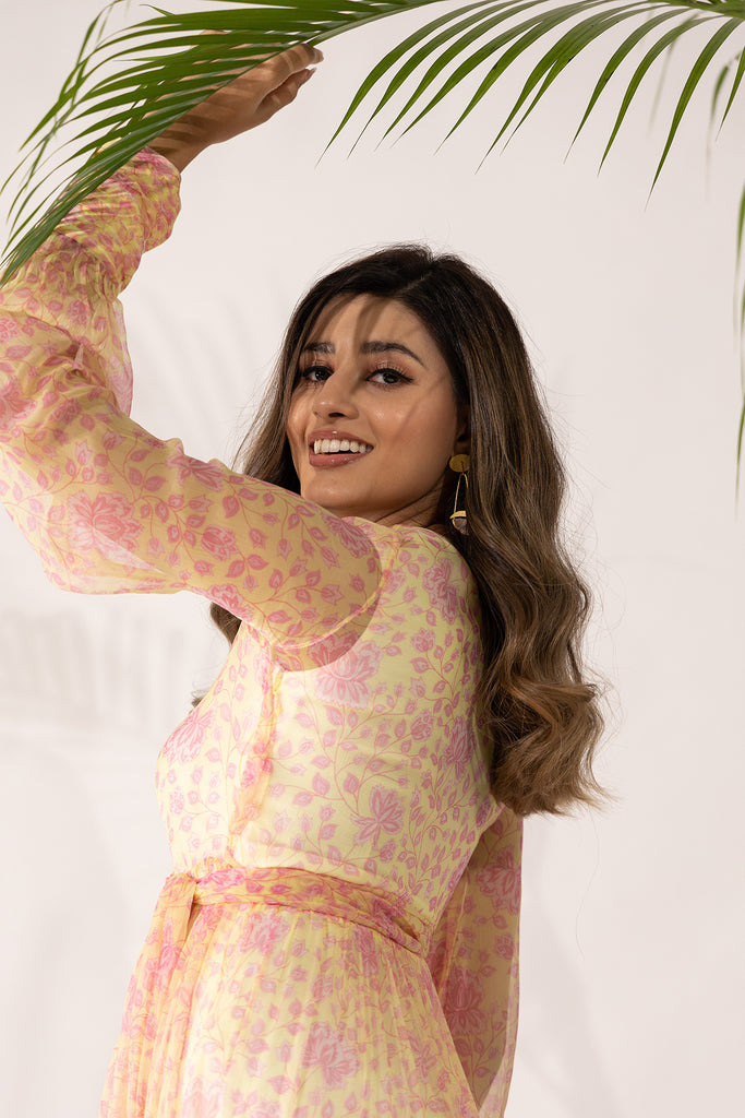 Our boho floral print comes alive in the playful union of yellow and pink, which adds a spring in your step. A perfect tropical dream, the wrap-around is crafted in an airy viscose-chiffon fabric that feels light on you. It comes in a set of two, with an A-line dress as an inner, and a flared wrap-around maxi dress that can be tied.