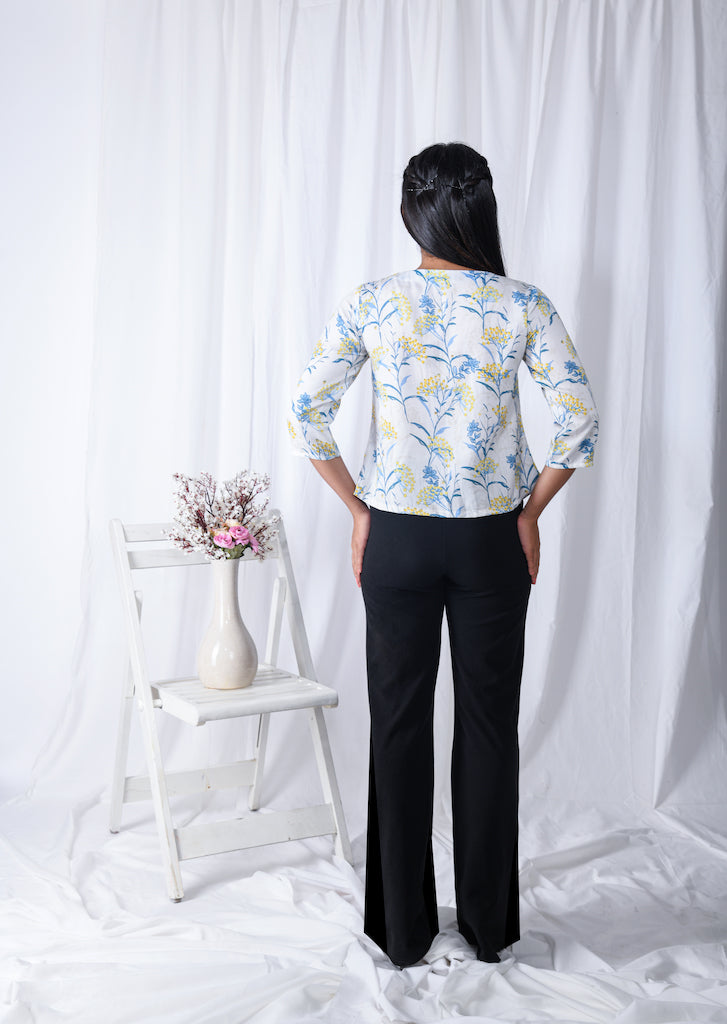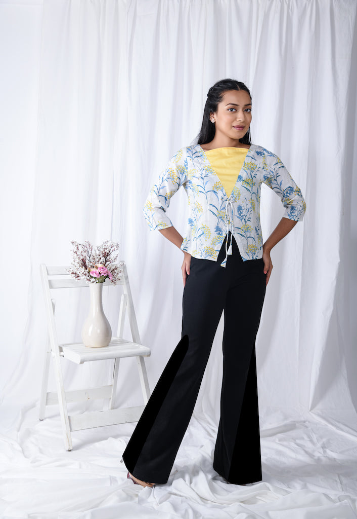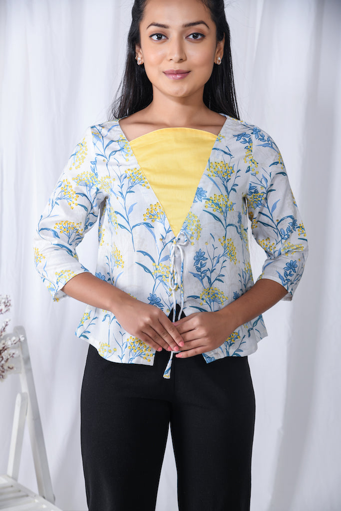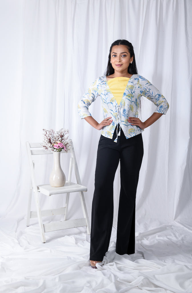 A digital print centre tie up jacket style Indo-western top.