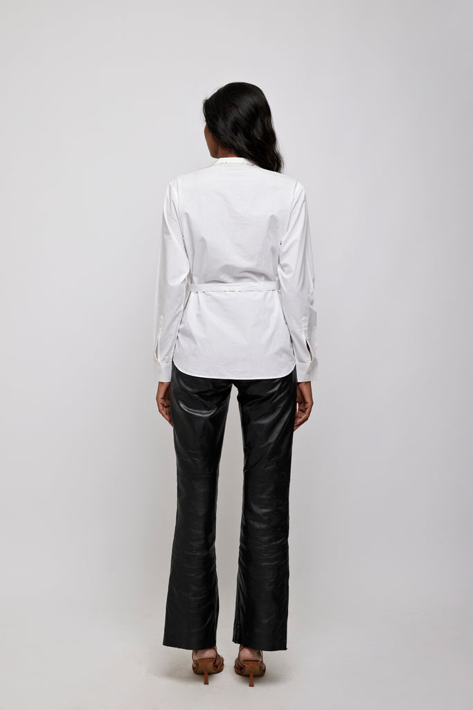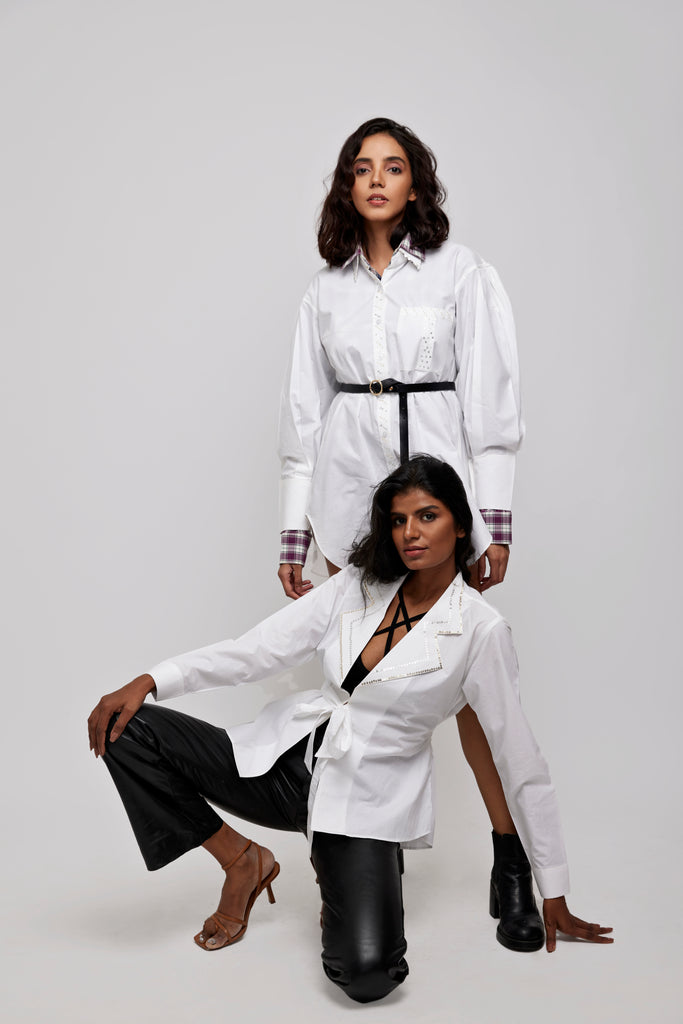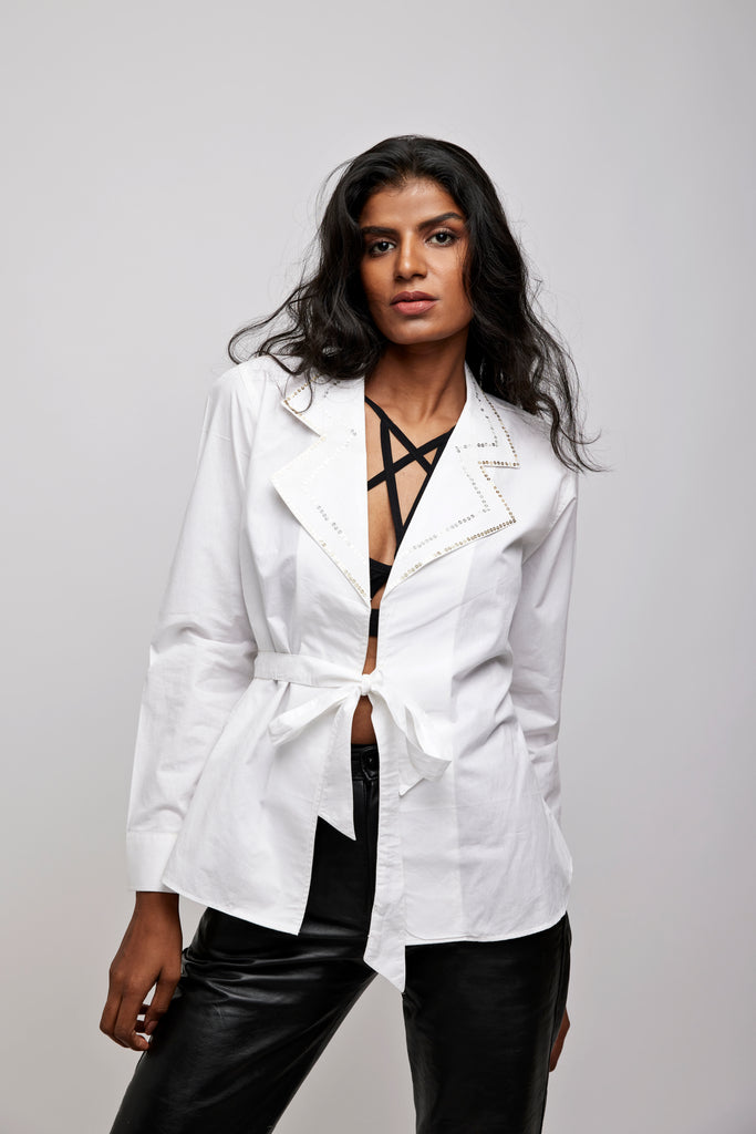 A Classic wrap around slim shirt with basic sleeves, notch lapels. Notch lapels embellished with golden and silver sequins