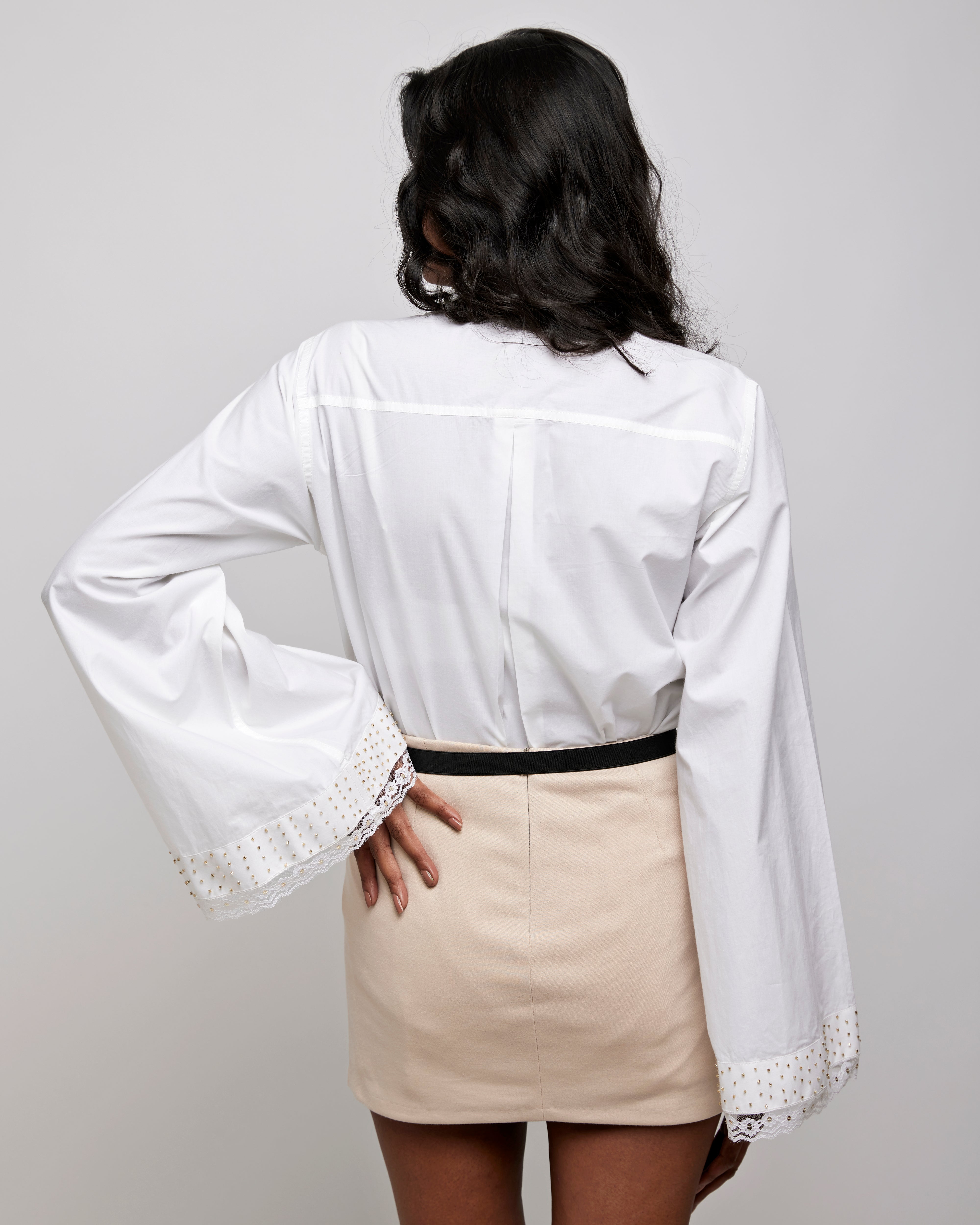 Basic White Classic Shirt with classic collar and a lace on the edges with sequins embellished and collar embellished with glass beads.